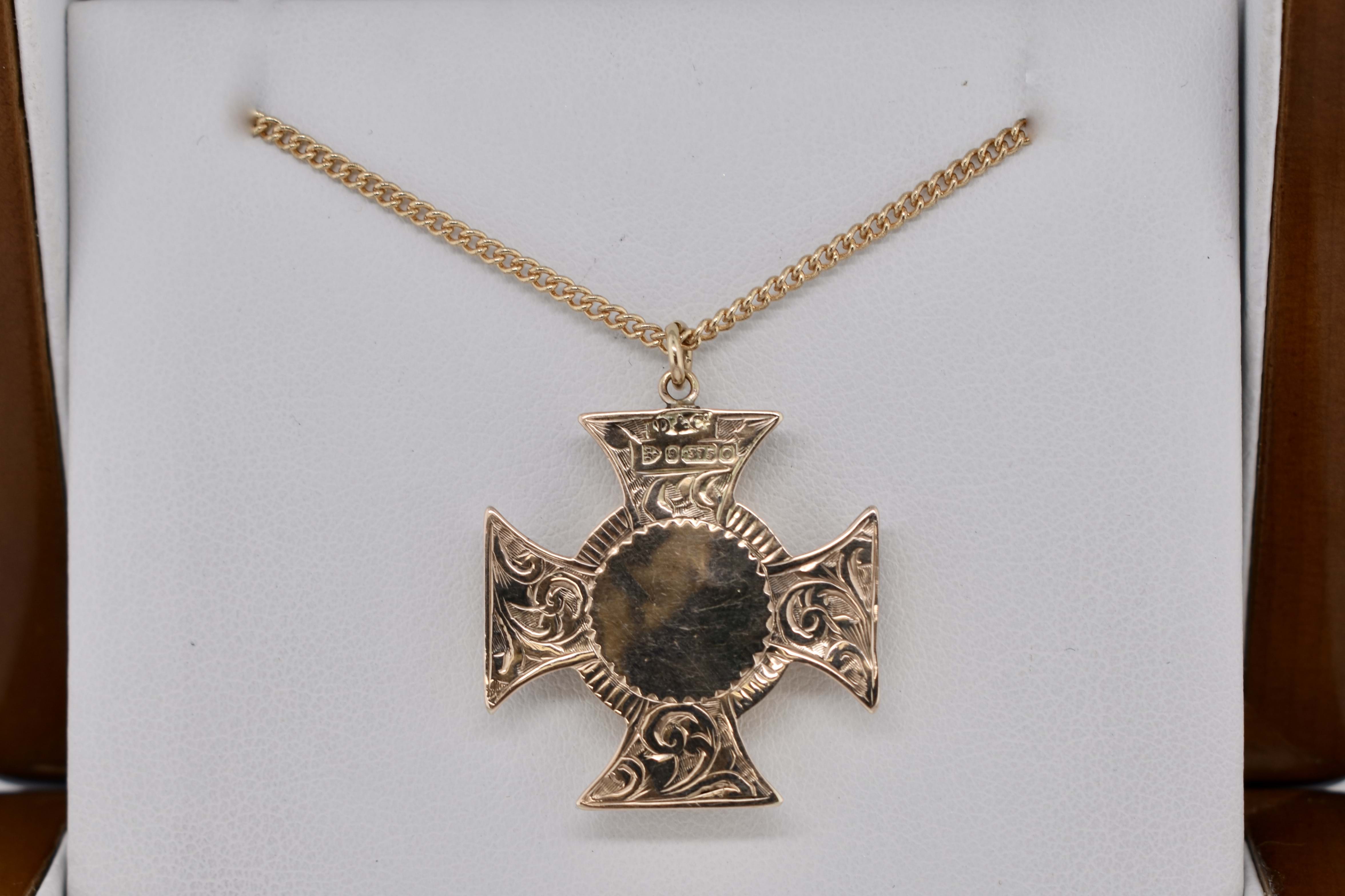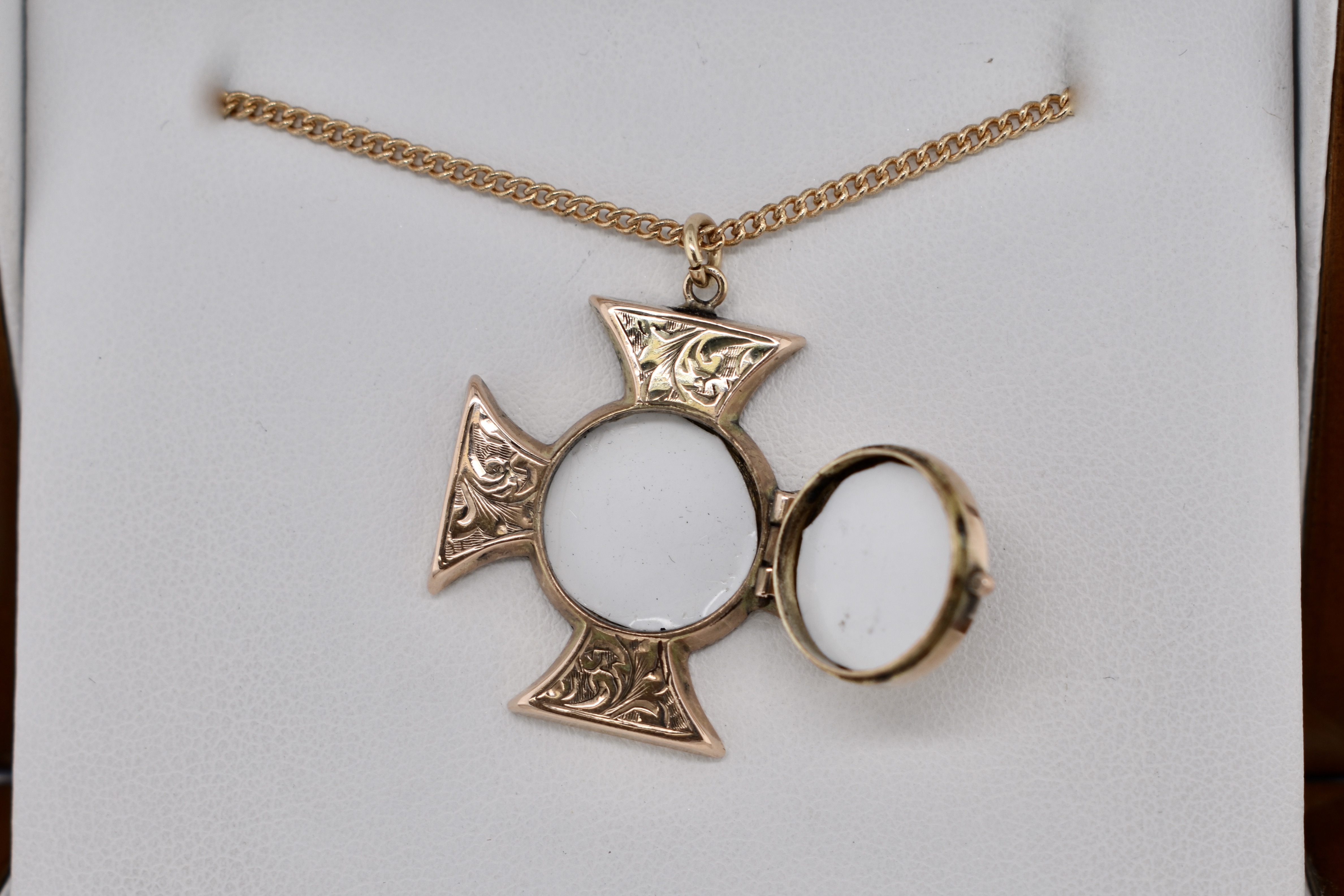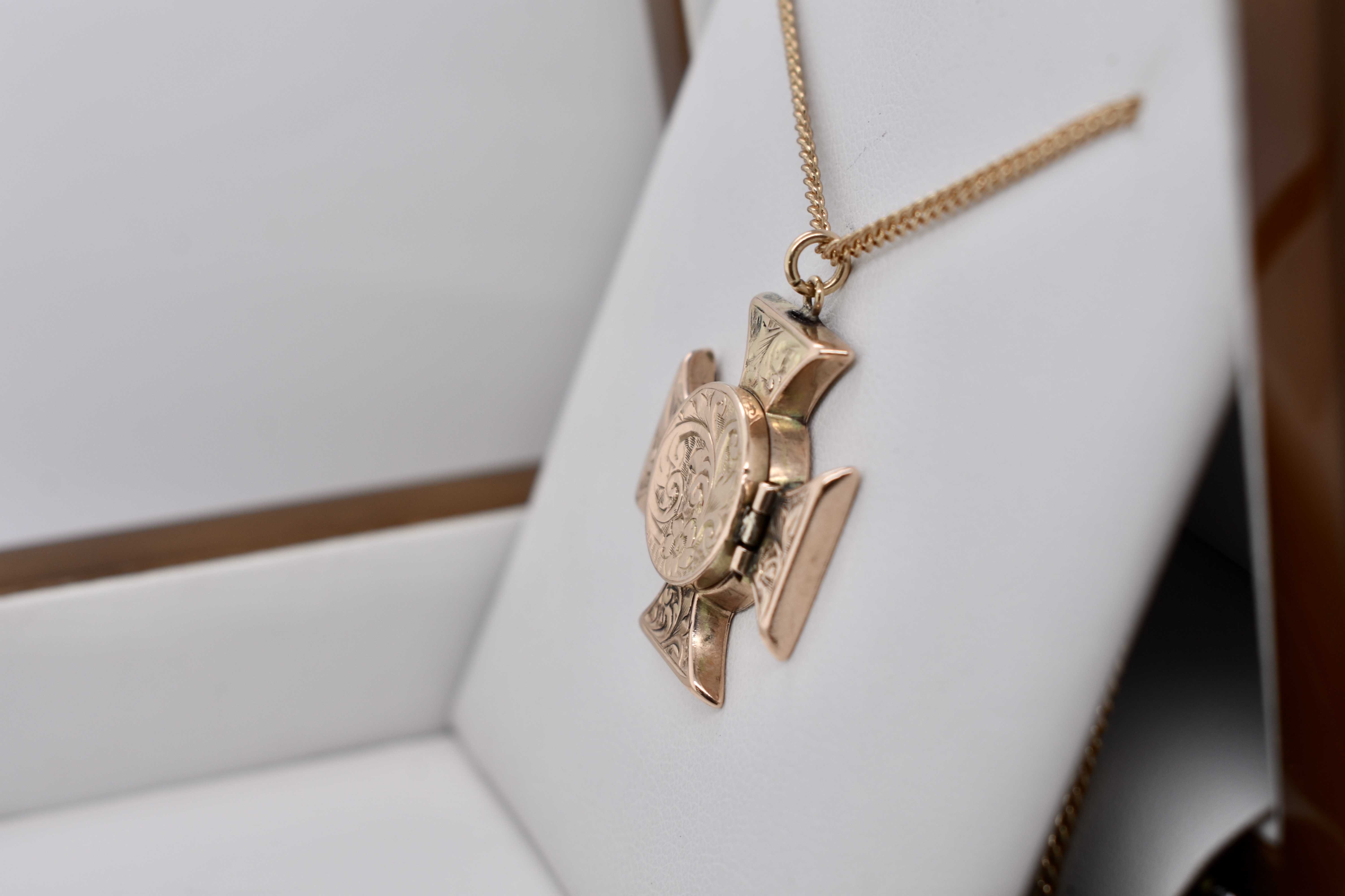 Super cool Maltese cross locket, measuring 25x25mm, beautifully crafted in 9ct yellow gold. This antique locket features scroll engraved details on both sides and is hallmarked Chester 1897. Weighing 3.13 grams. Chains available for separate purchase.