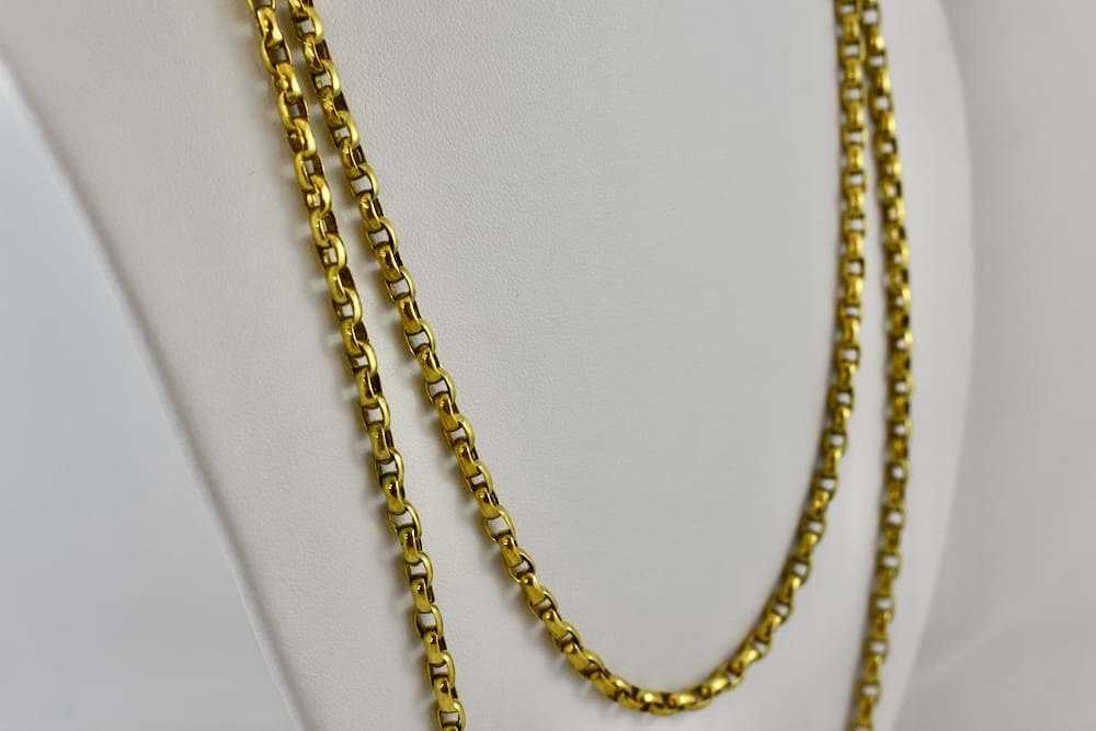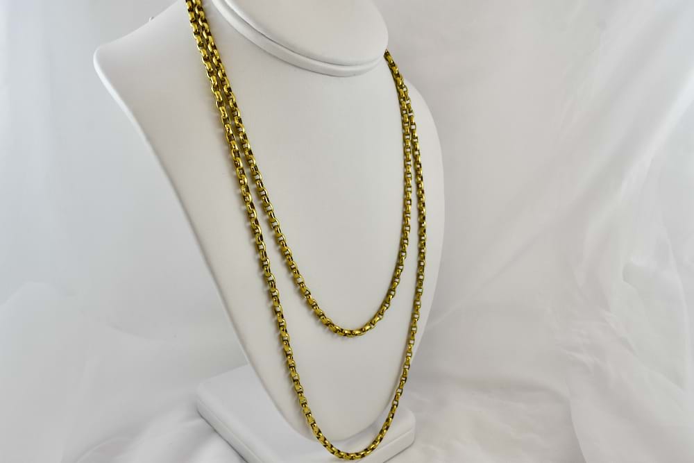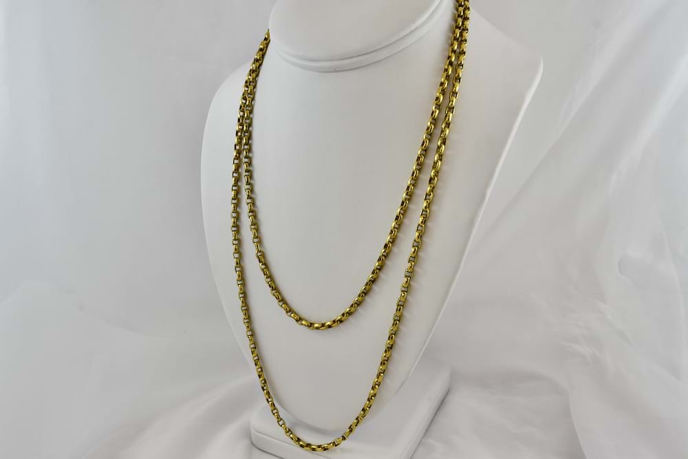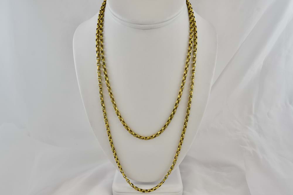 This striking antique 9ct yellow gold muff chain is dating back to the late Victorian era, featuring large open links which are 3.5mm wide. The chain measures 106cm in length and weighs 25.48 grams, with one swivel which is perfect for hanging a spinner or vesta case from. Vesta case pictured is available for separate purchase
