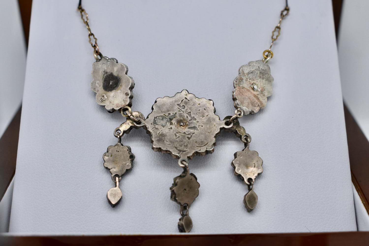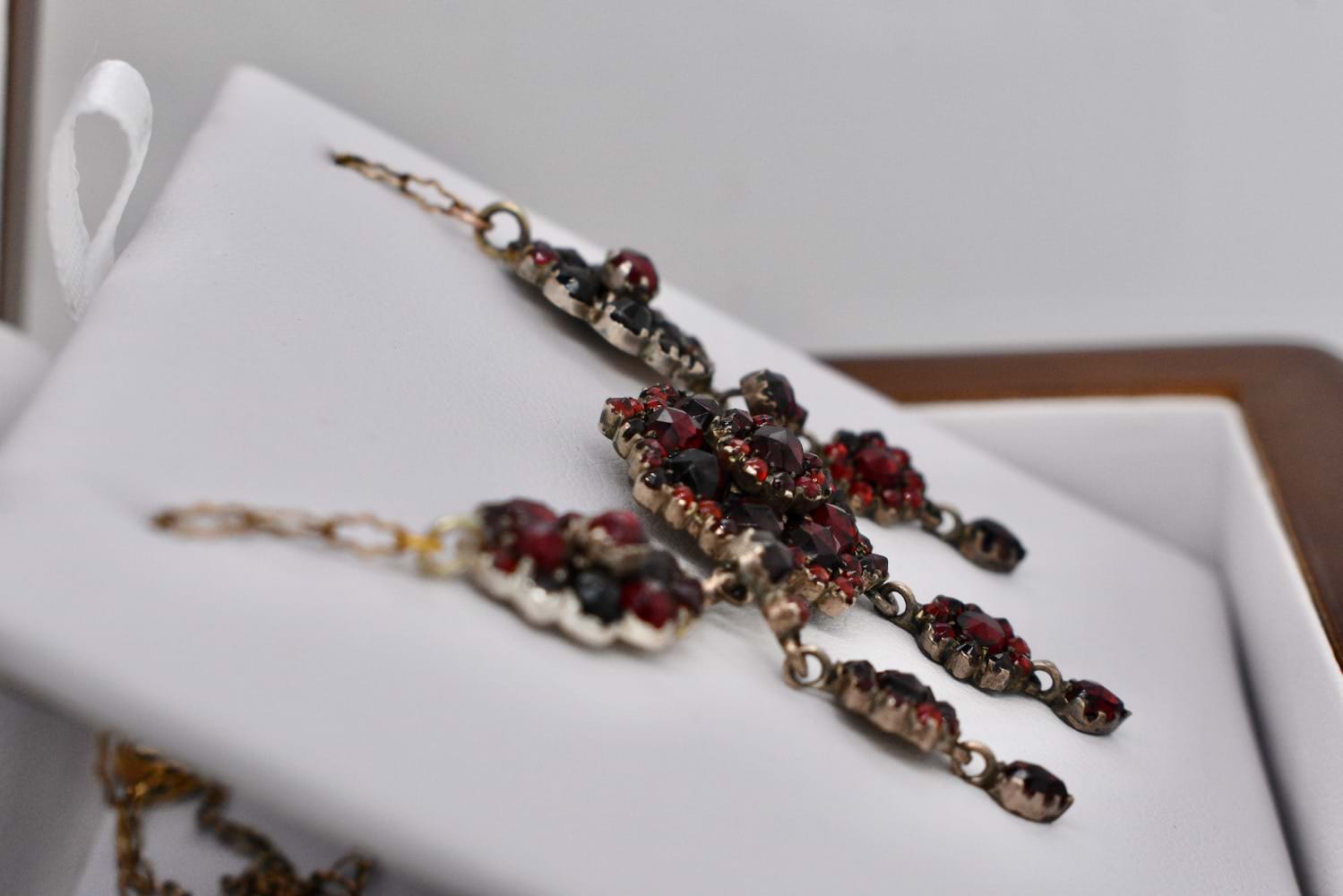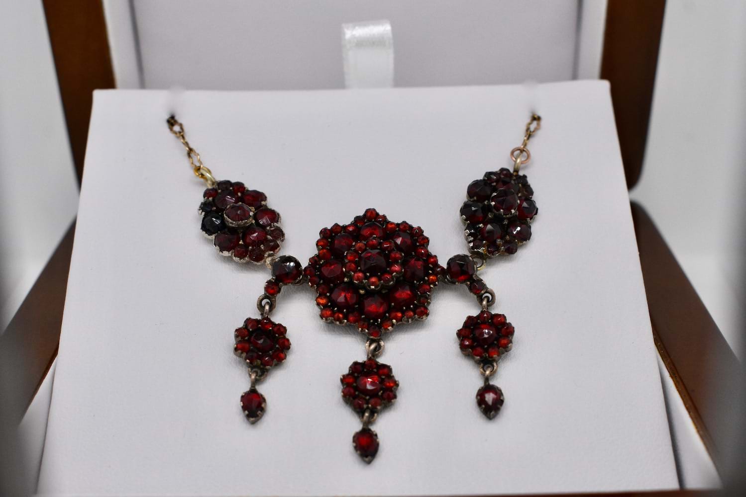 Beautiful antique necklace feature three large rosette clusters of rose cut Bohemian garnets with articulated smaller cluster drops. Set in rolled gold and white metal the chain measures 47cm, with a total of 120 garnets. Dated circa 1870's. Independent Valuation Supplied