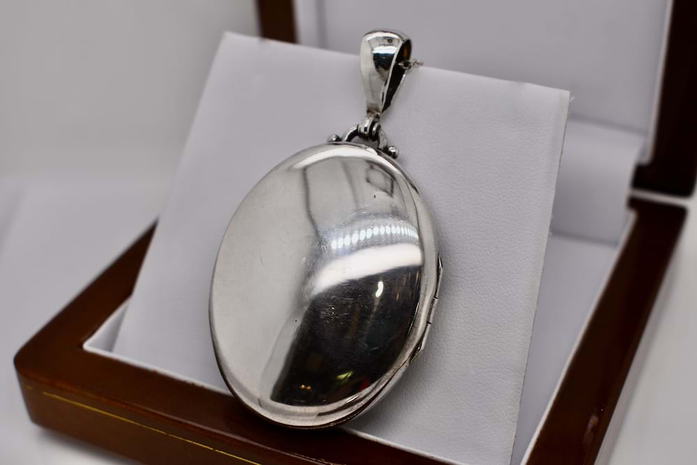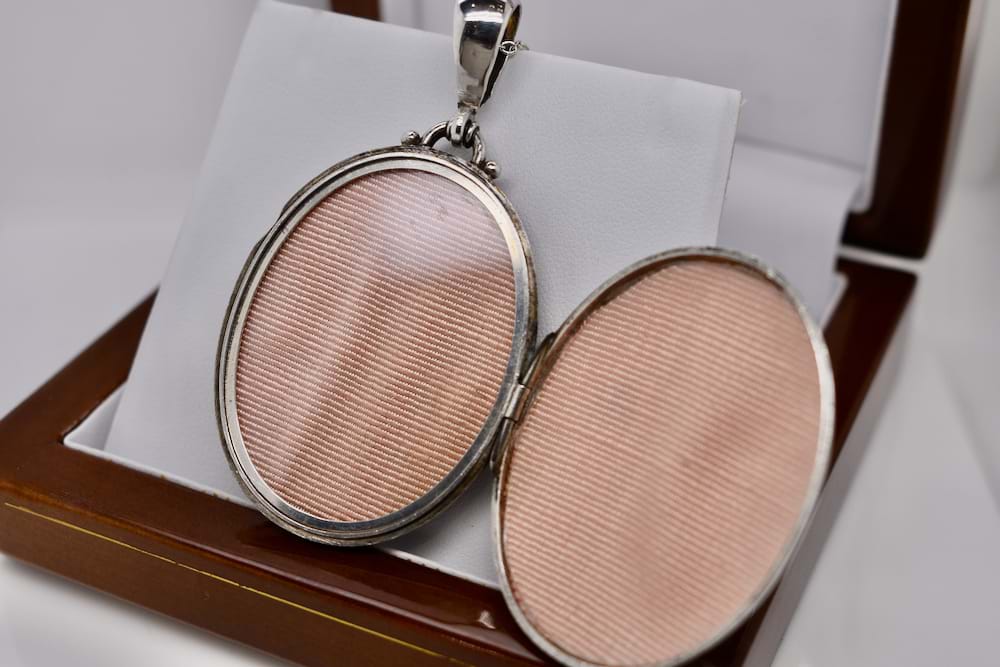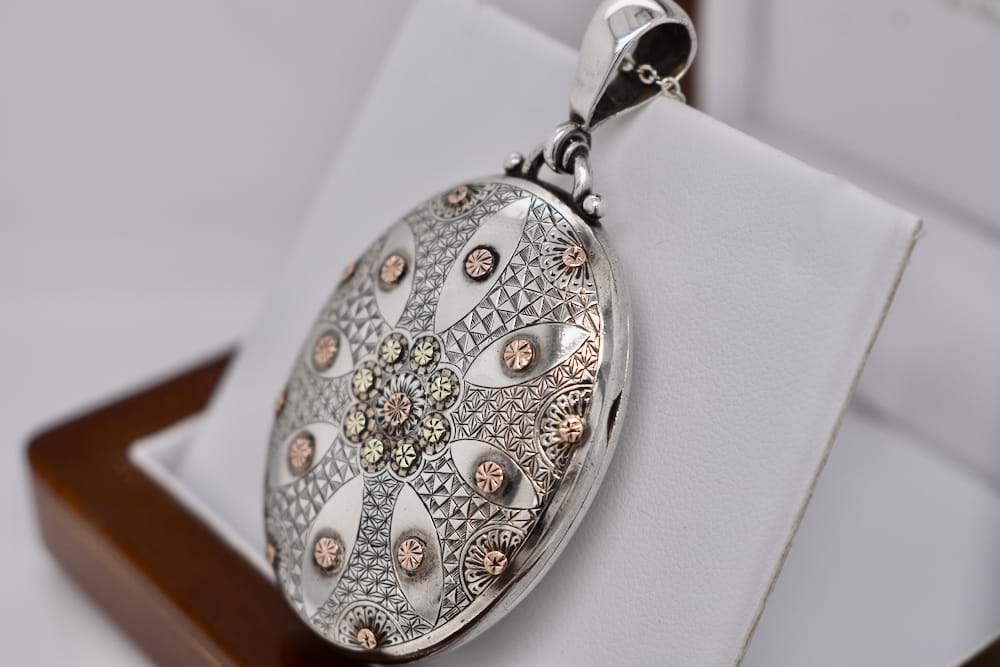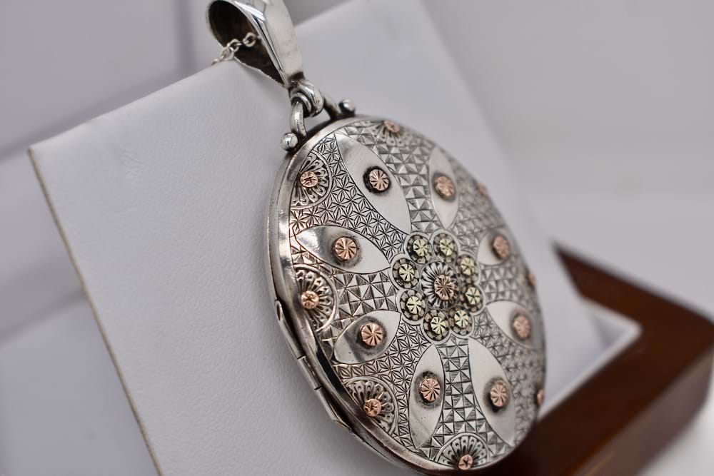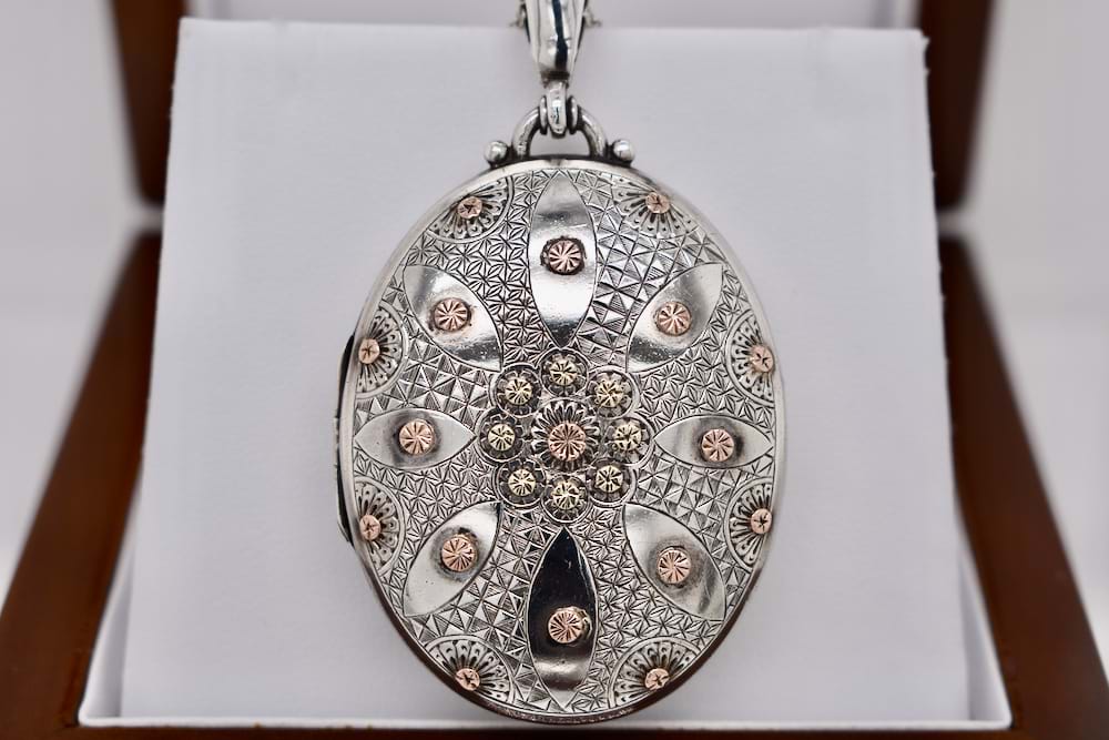A gorgeous sterling silver oval locket embossed with rose and green gold decorations, dated circa 1890's. This unusual and stunning piece makes the perfect addition to a silver collar or chain. Locket measures approx 43x35mm plus the bale. Independent Valuation Supplied