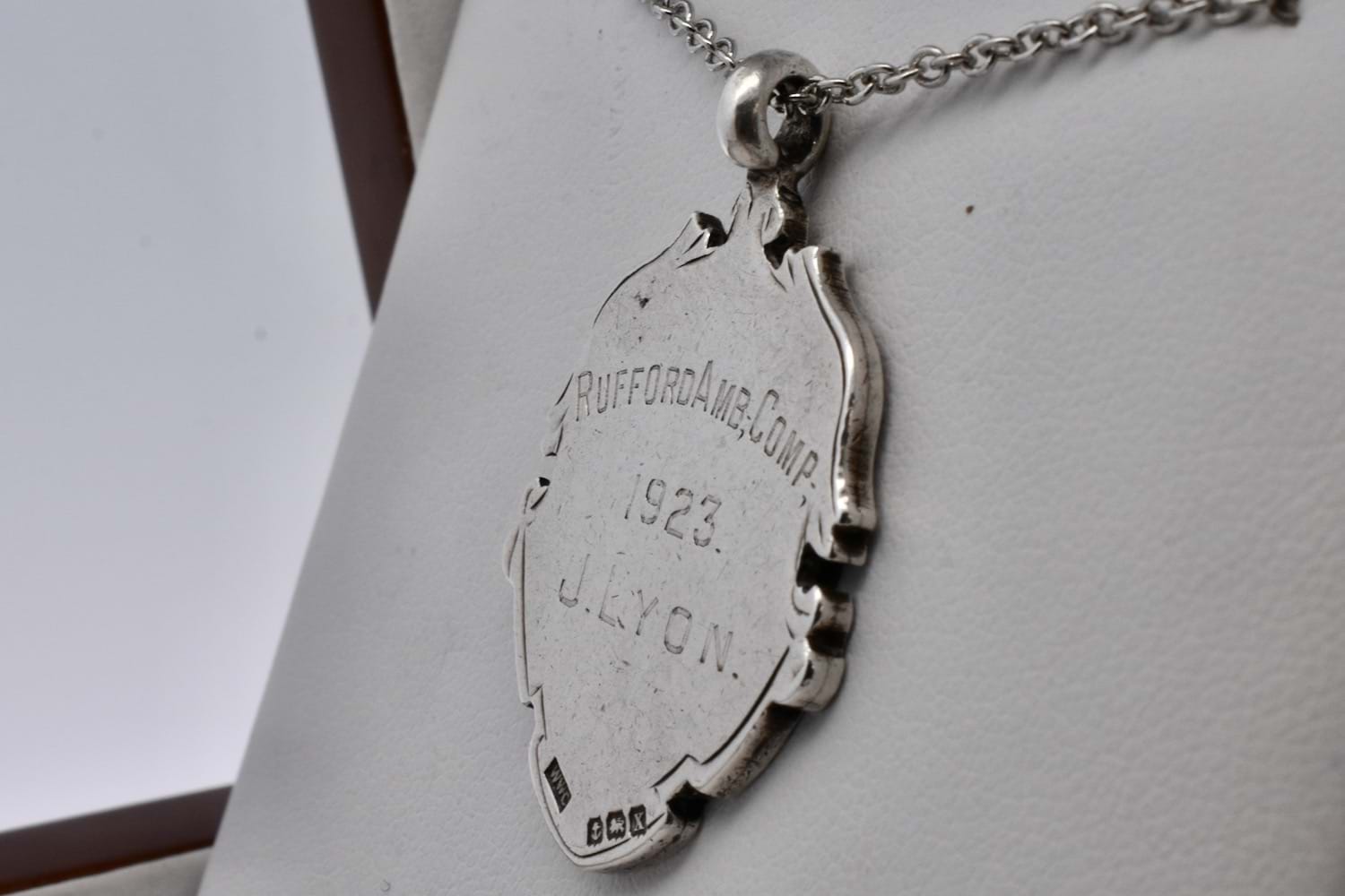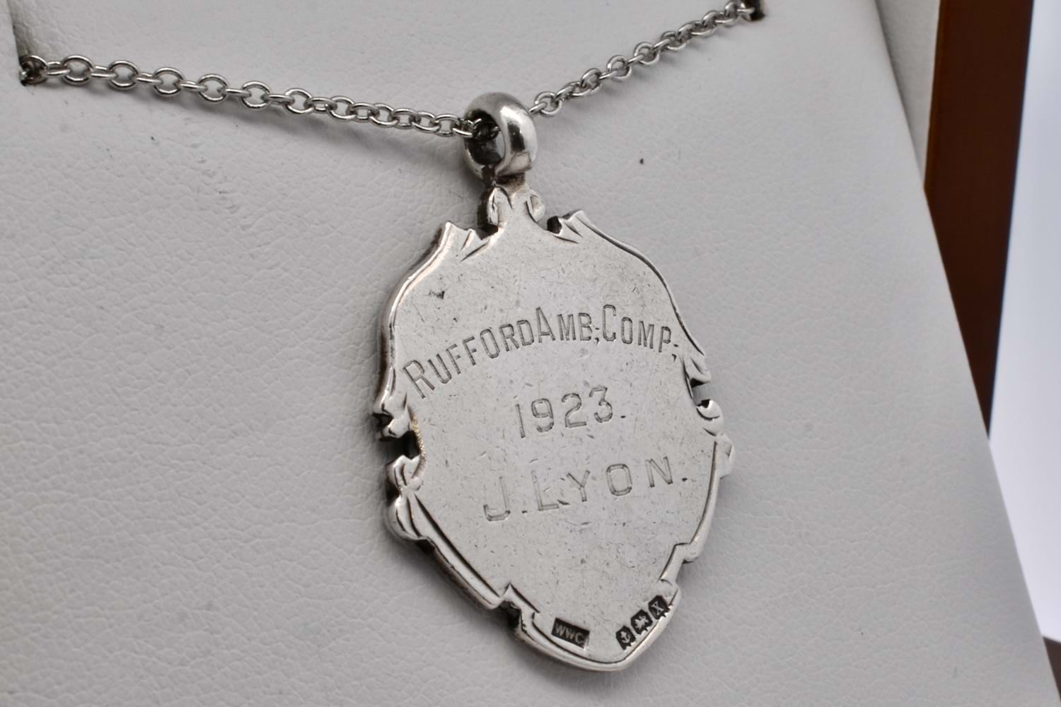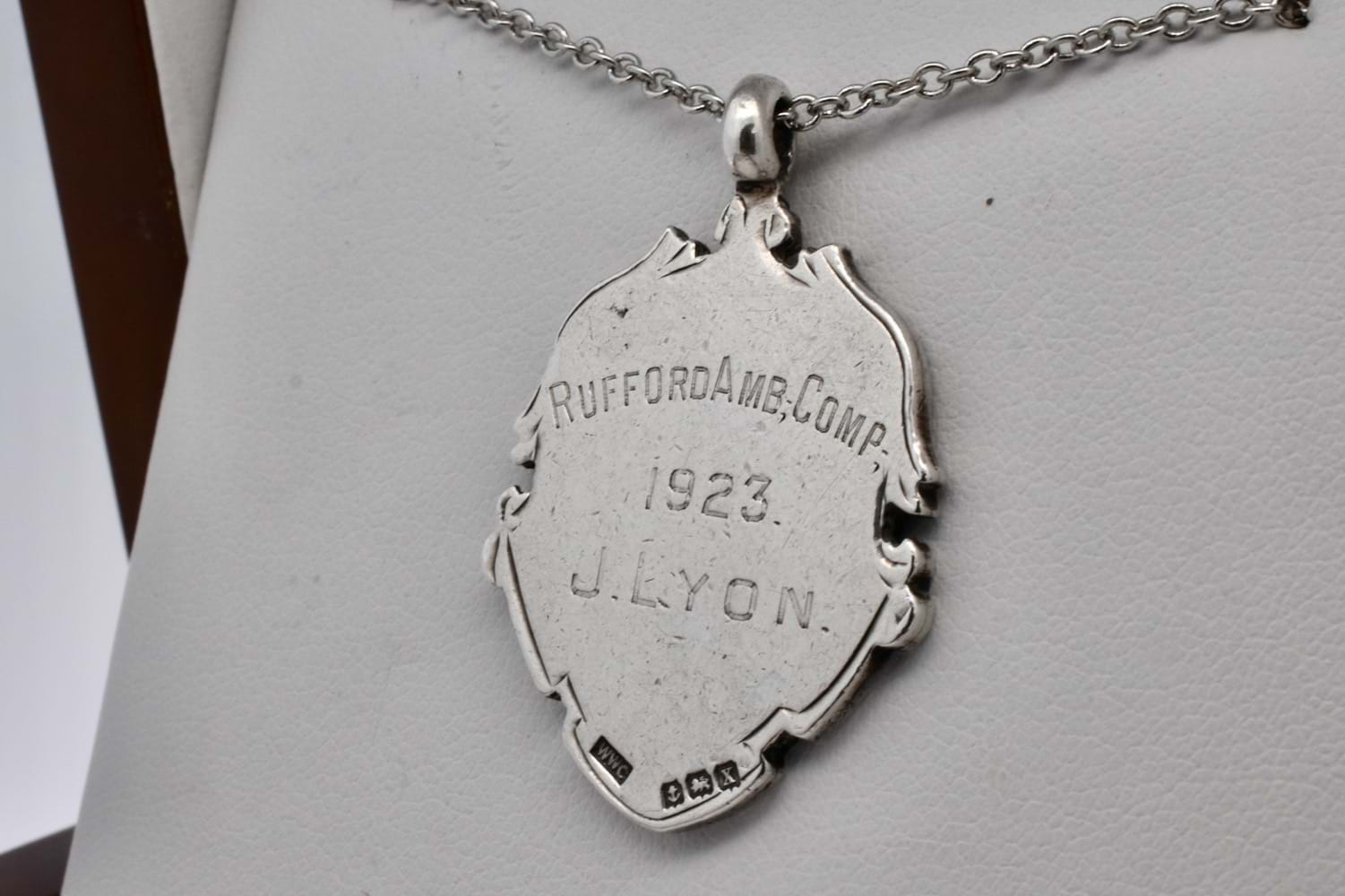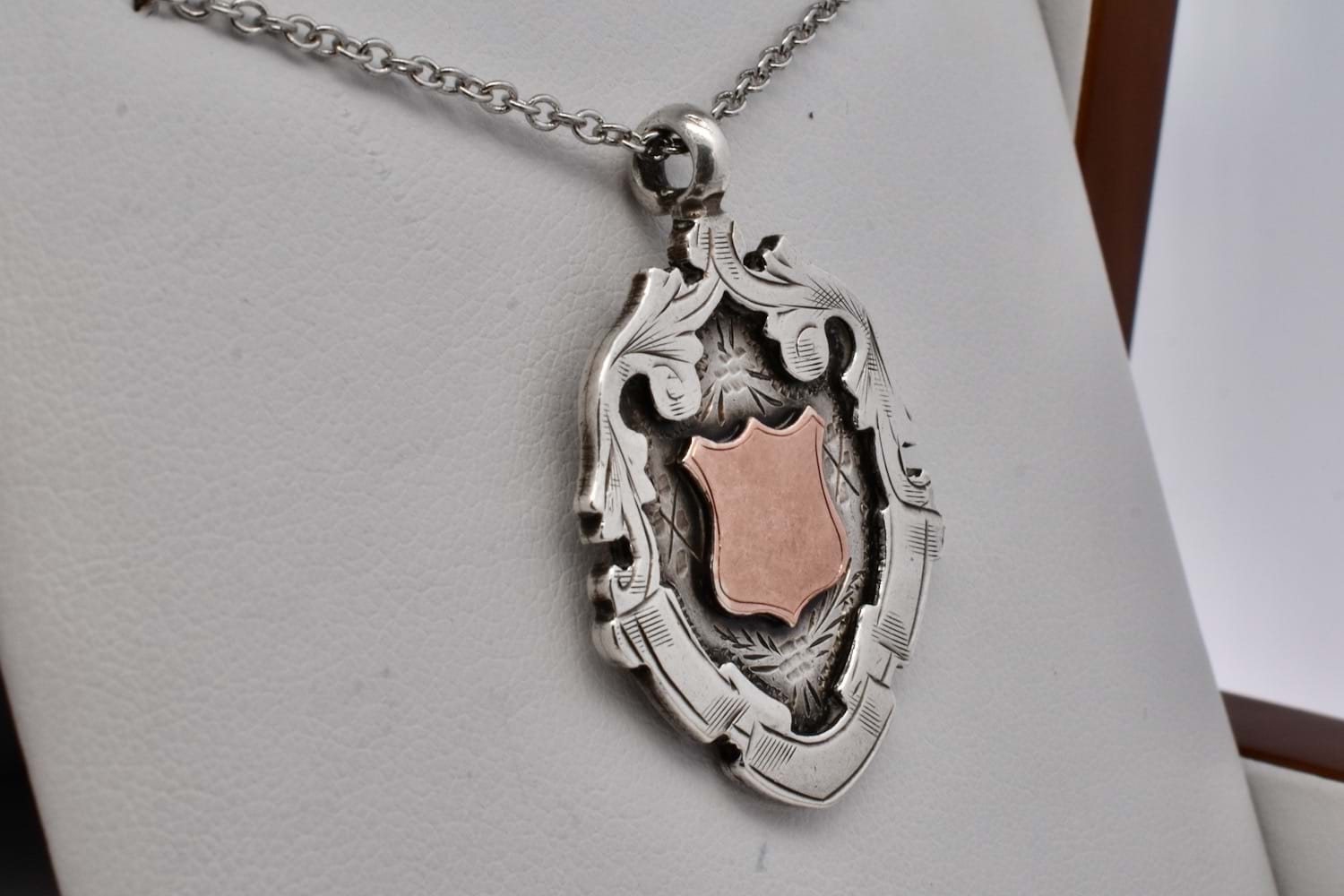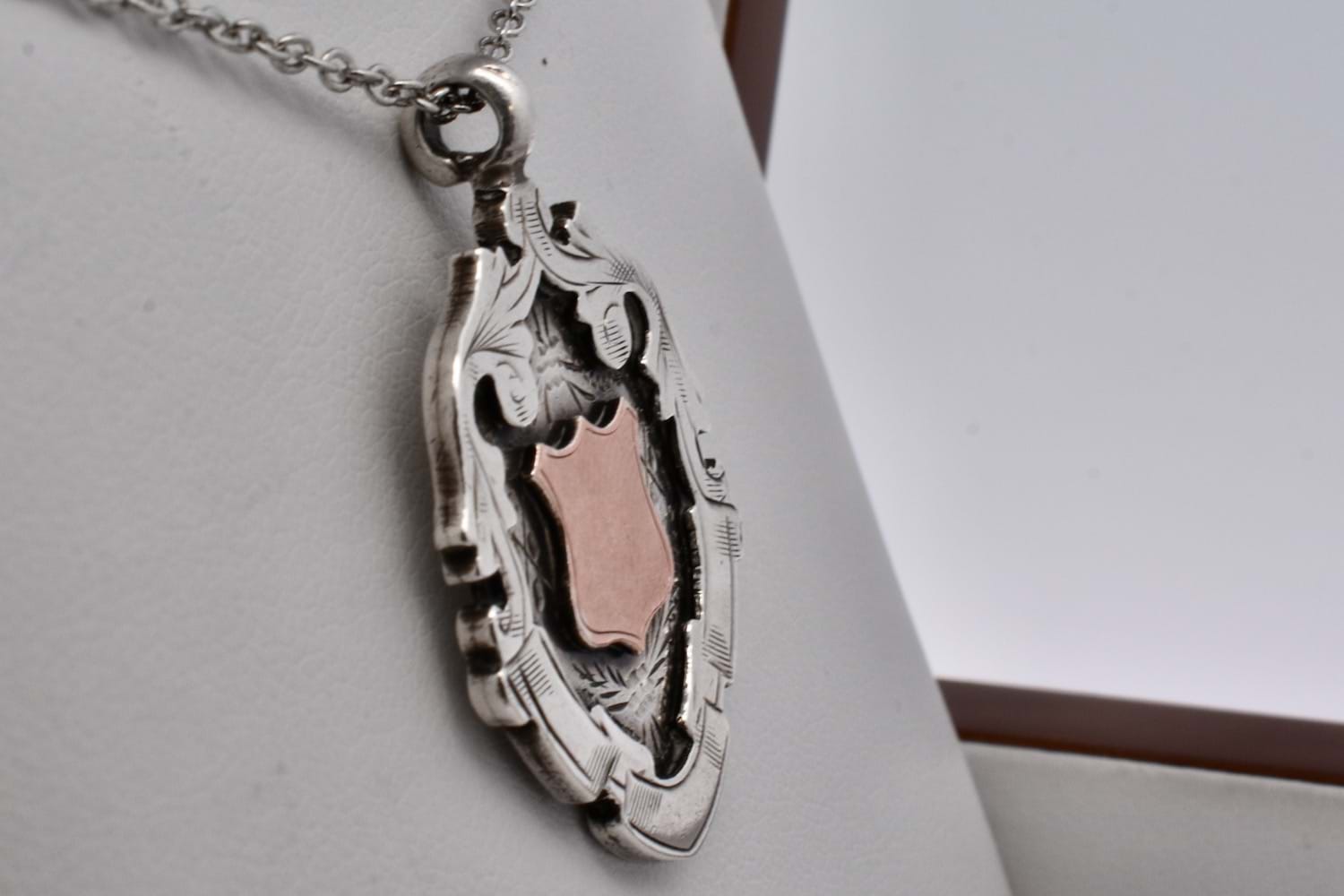 This gorgeous antique shield is made from sterling silver with a centre 9ct rose gold piece, with scroll and floral motif engraving in an elongated shield shape. The back is engraved "Rufford Amb. Corp 1923 J. Lyon" and hallmarked Birmingham 1922. Chains available for separate purchase