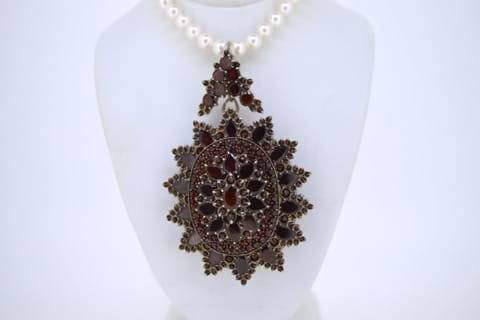 An eye catching antique piece featuring Bohemian garnets in a cluster design, which can be worn as both a pendant or a brooch. Circa 1900