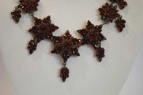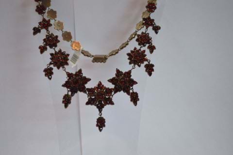 A striking gold gilt necklace consisting of Bohemian garnets arranged in rosette clusters reverse tapering into a V neckline with a single large cluster as a feature, and nine smaller clusters suspended from the main rosettes. Dated circa 1880's this piece comes complete with an independent valuation.