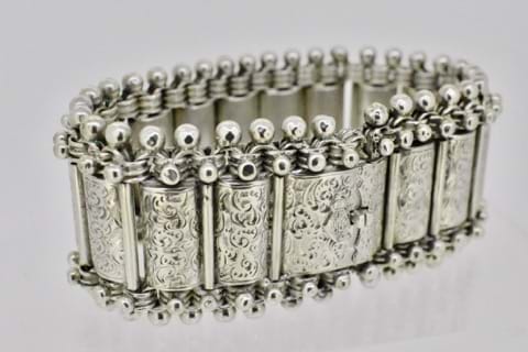 A pair of rare Sterling Silver Victorian Bracelets. Featuring scroll engraving on a domed rectangular center piece with double row ball edges, each bracelet measures 35mm wide and the two can be connected together to be worn as a collar. Registry marks 27 August 1880. Sold as a set. Independent Valuation Supplied