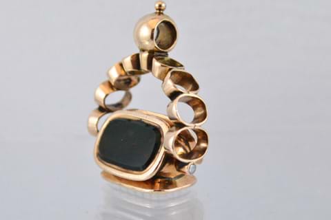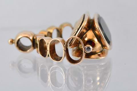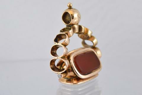 A trio spinner featuring carnelian, bloodstone and an engine turned finish. This rose gold cased spinner is set apart by its unusual arched carved out oval shaped top design. Dated circa 1840 this makes a stunning addition to an antique chain. Independent Valuation Supplied