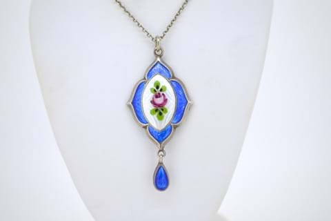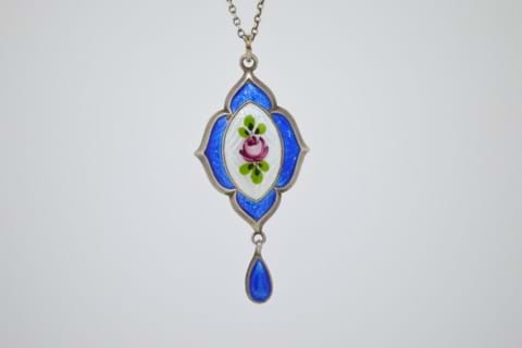 This pretty piece features hand painted blue and white enamel with a pink rose and green leaves in sterling silver on it's original barrel clasp chain. Circa 1930's.
