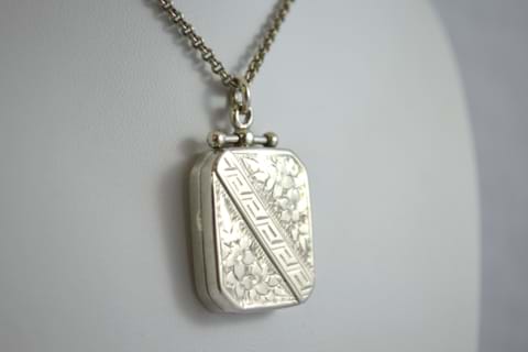 In sterling silver this rectangular locket, dated 1892, is paired pefectly with a long double baby belcher link chain. This piece makes a stunning addition to any outfit, both casual and dressy.