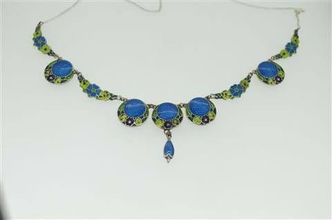 A stunning sterling silver necklace featuring hand painted enamel discs in blue and green tones depicting a floral design. This beautiful necklace is a great gift for the next birthday, Christmas, anniversary or just because!