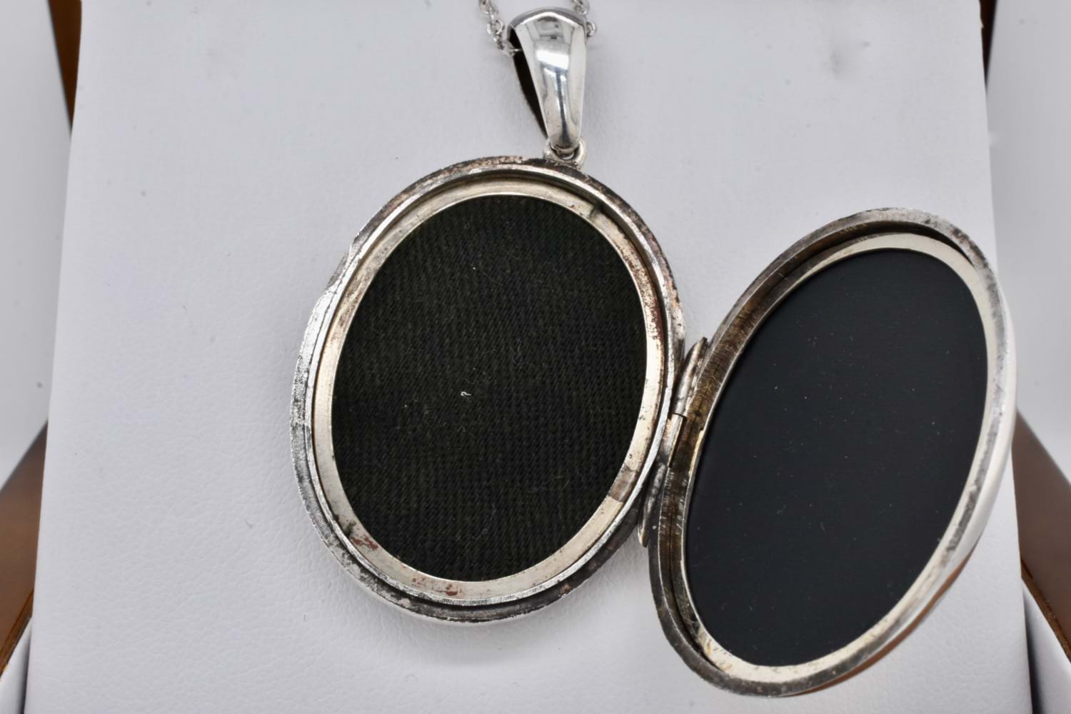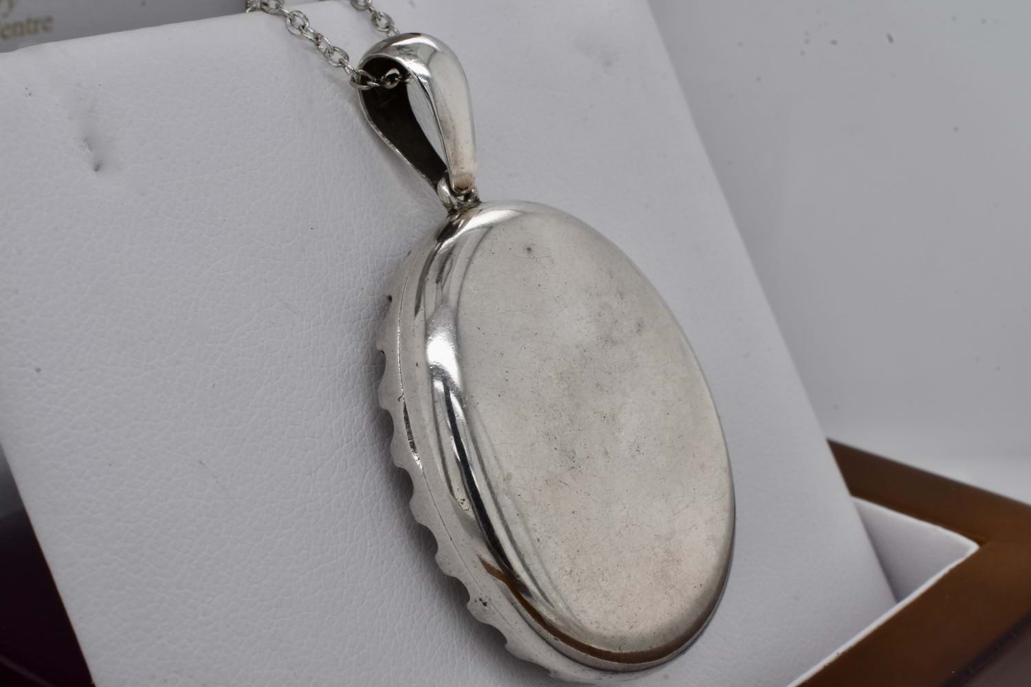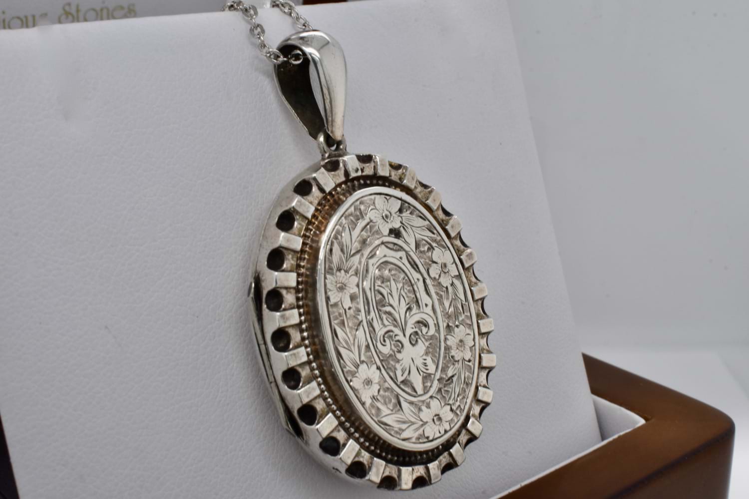 Classic Victorian photo locket in sterling silver with intricate engraving. Dated circa 1890. Measures: 37x30mm