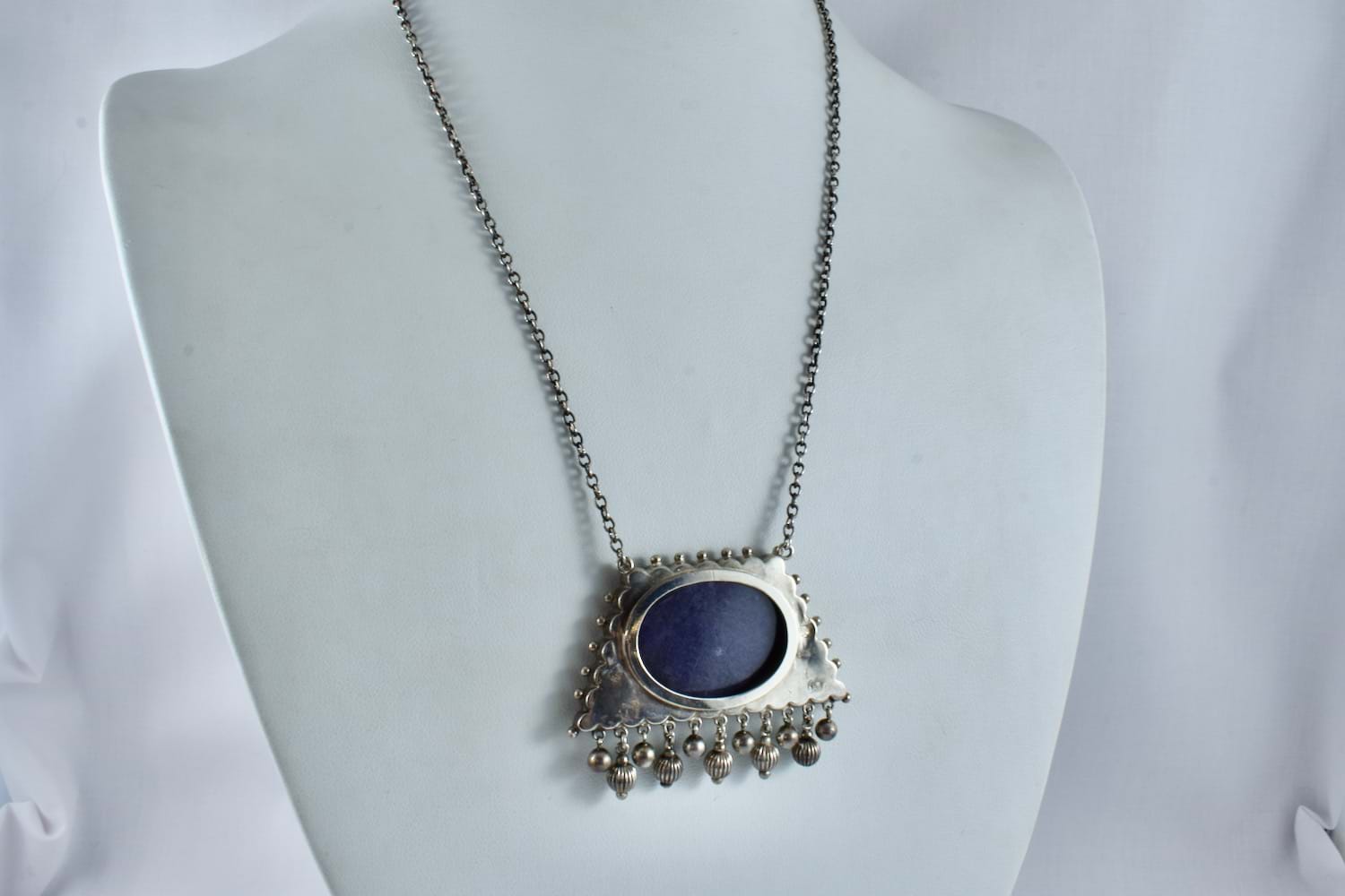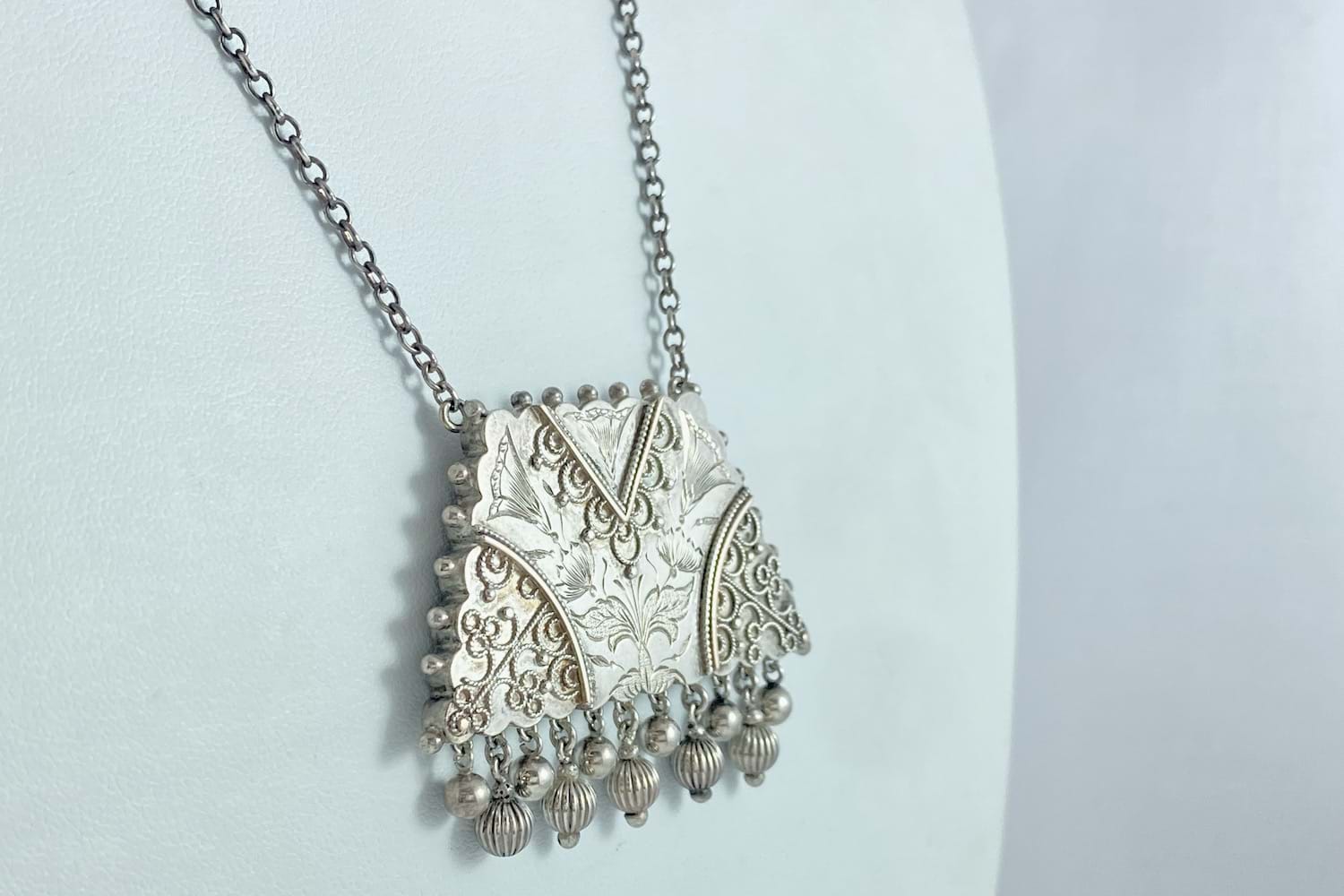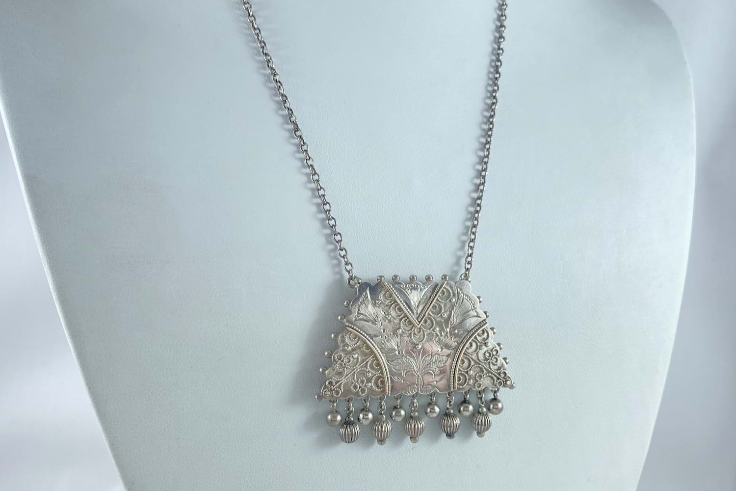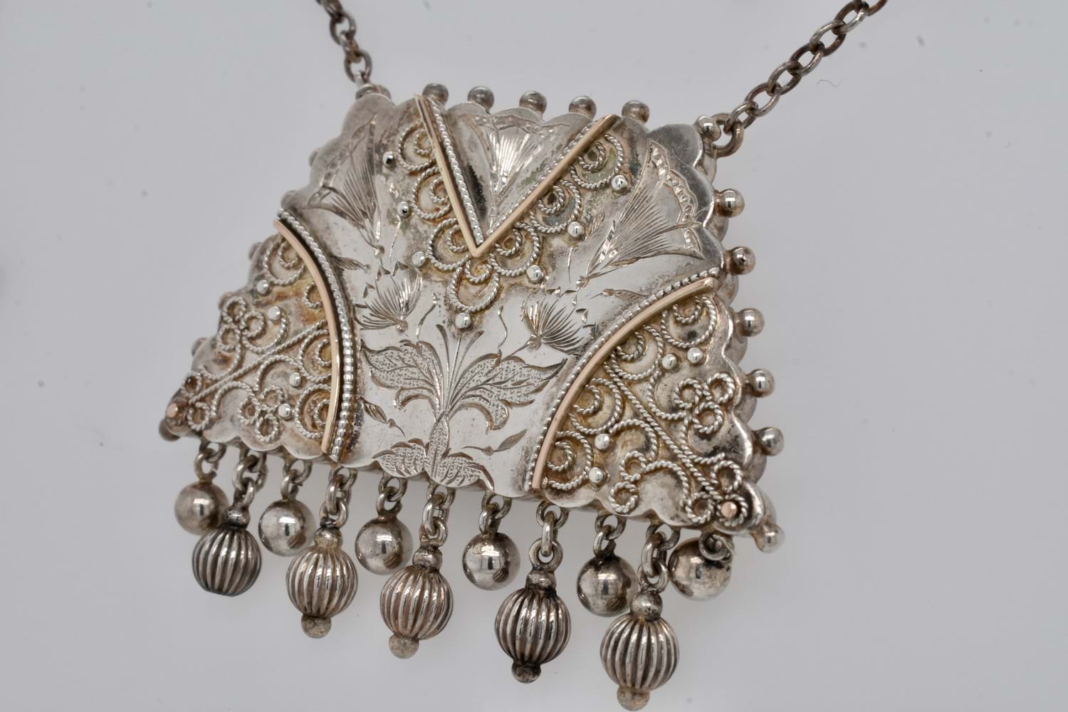 This striking Victorian necklace has been crafted in sterling silver and a features a purse style locket with intricate engraving and wire overlay and polished/grooved tassel drops with a glass locket backing. Suspended from a cable link chain, total length is 47cm.