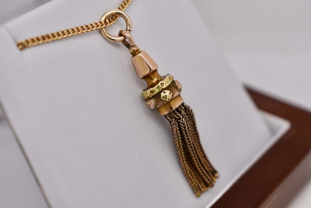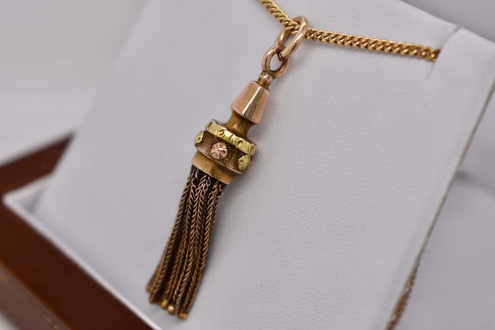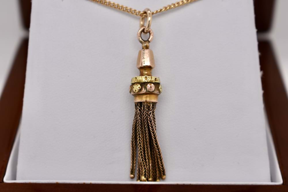 An antique 15ct gold tassel with accents of rose and green gold and a 9ct yellow gold jump ring bale. Dated circa 1900 this pendant would make a beautiful addition to a fine gold chain. Independent Valuation Supplied. Pendant measures 8.25mm wide and 45mm long. Chains are available for separate purchase