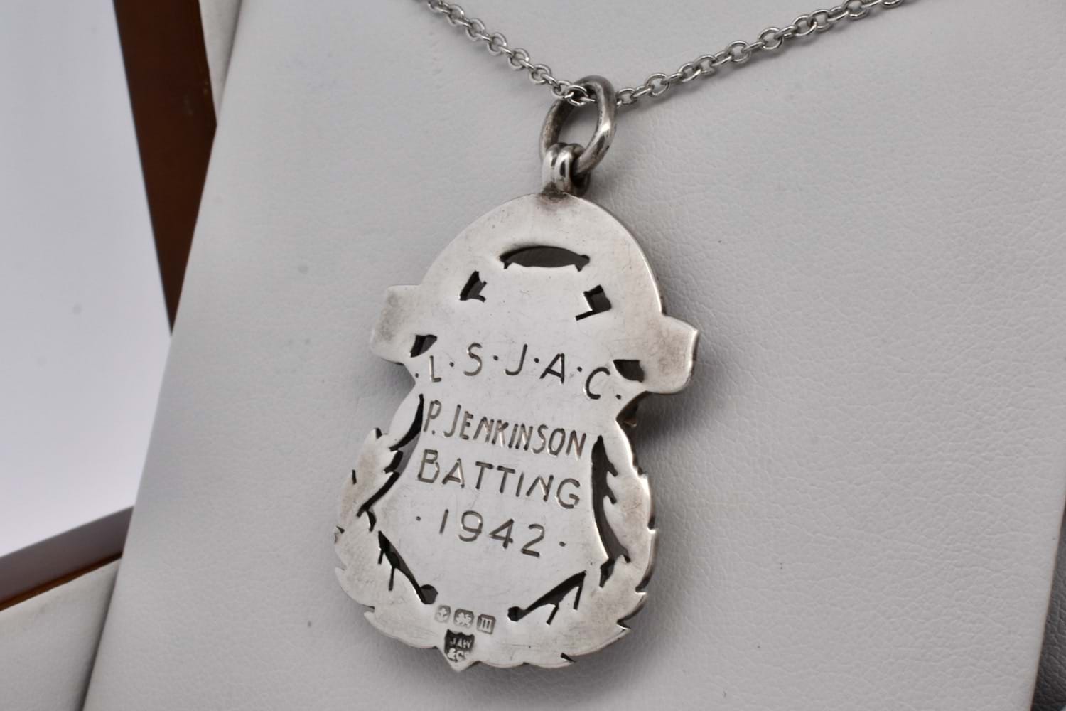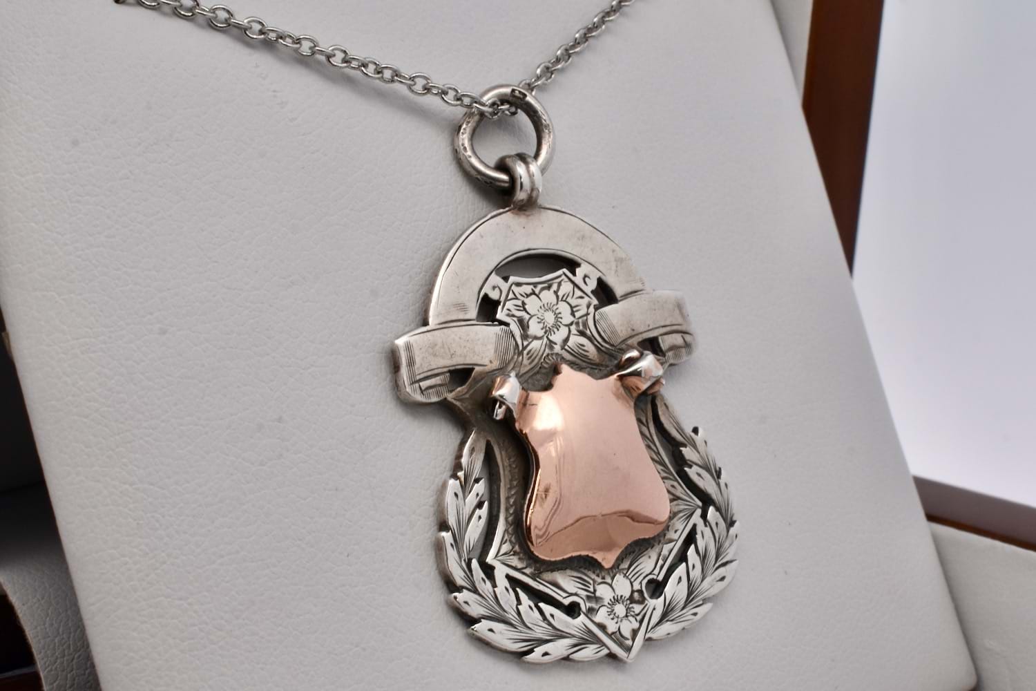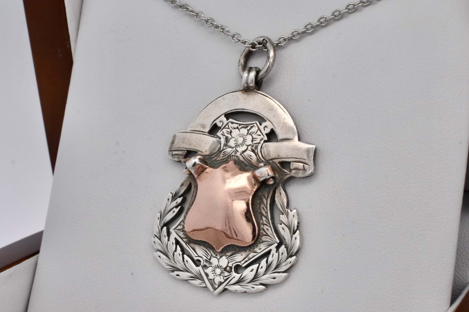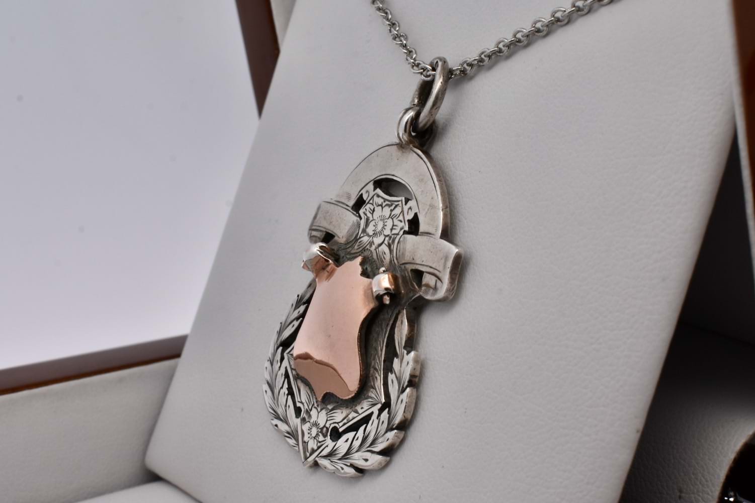 A beautifully detailed and intricate antique shield with contrasting sterling silver and rose gold accent centre piece, in the shape of a rounded shield with engraved leaf and floral motifs with plain puffy centre piece. The back of the shield is engraved "L•S•J•A•C P Jenkinson Batting 1942" and hallmarked Jaw & Co Birmingham 1911. Chains available for separate purchase