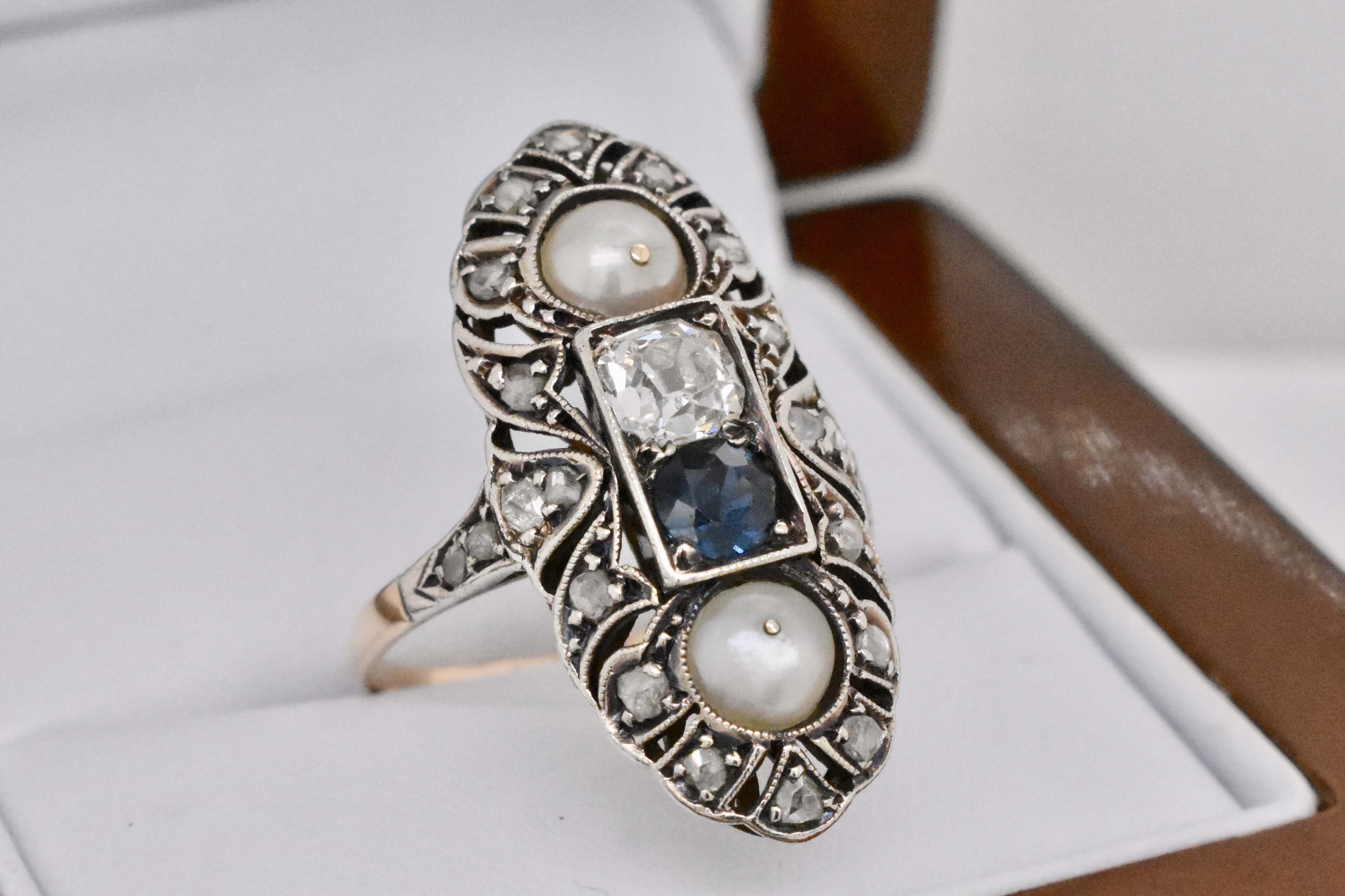SOLD Antique 18ct Yellow Gold Sapphire & Seed Pearl Bridge Ring Birmingham 1901 (P)