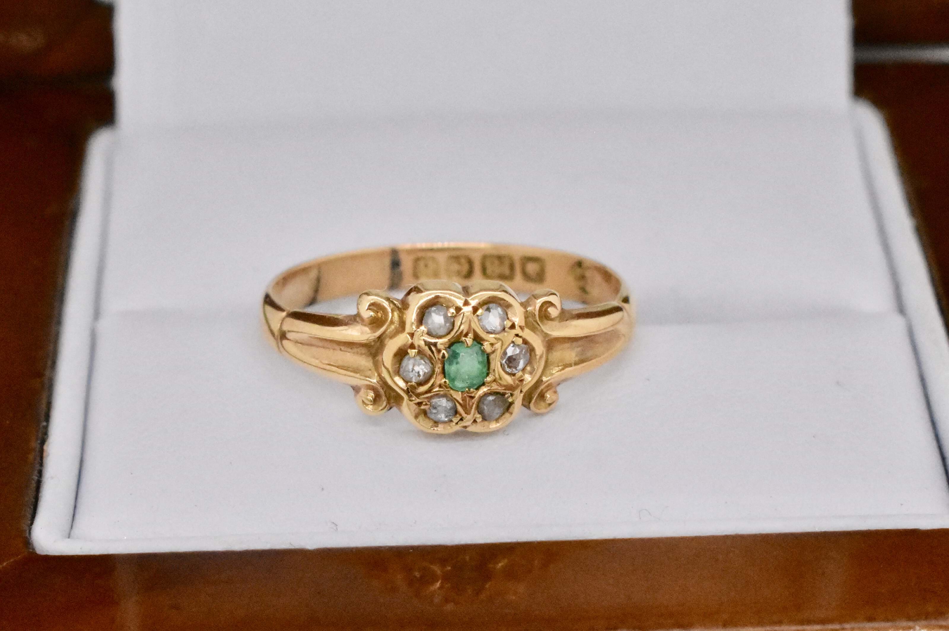 SOLD Antique 18ct Yellow Gold 0.20ct Emerald & 0.30ct Diamond Cluster Ring