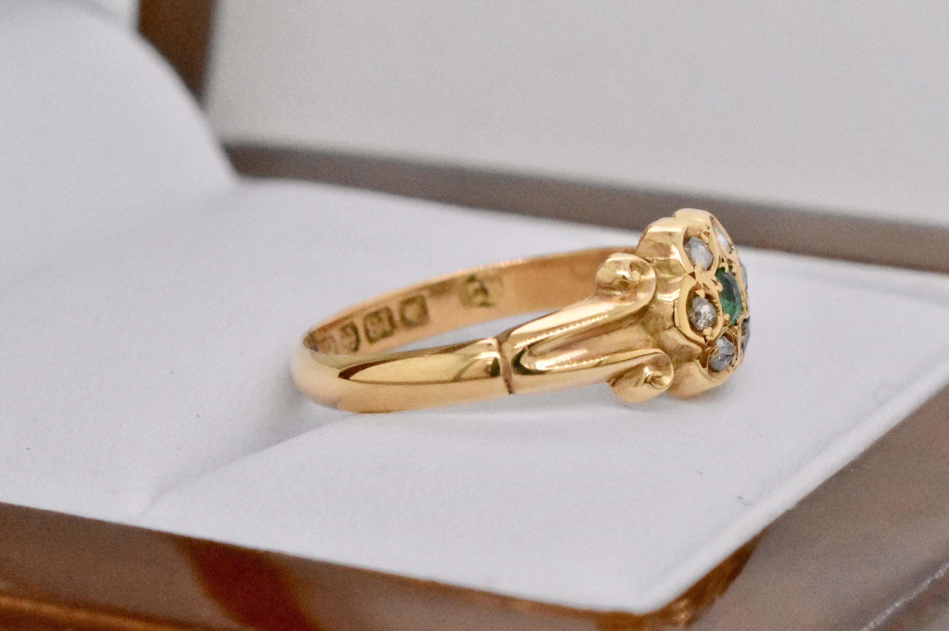 This beautiful antique ring was handcrafted in 1907 in 18ct yellow gold and features six rose cut diamonds surrounding an oval emerald in a daisy design. The diamonds total 0.04cts and the emerald 0.05cts. Independent Valuation Supplied