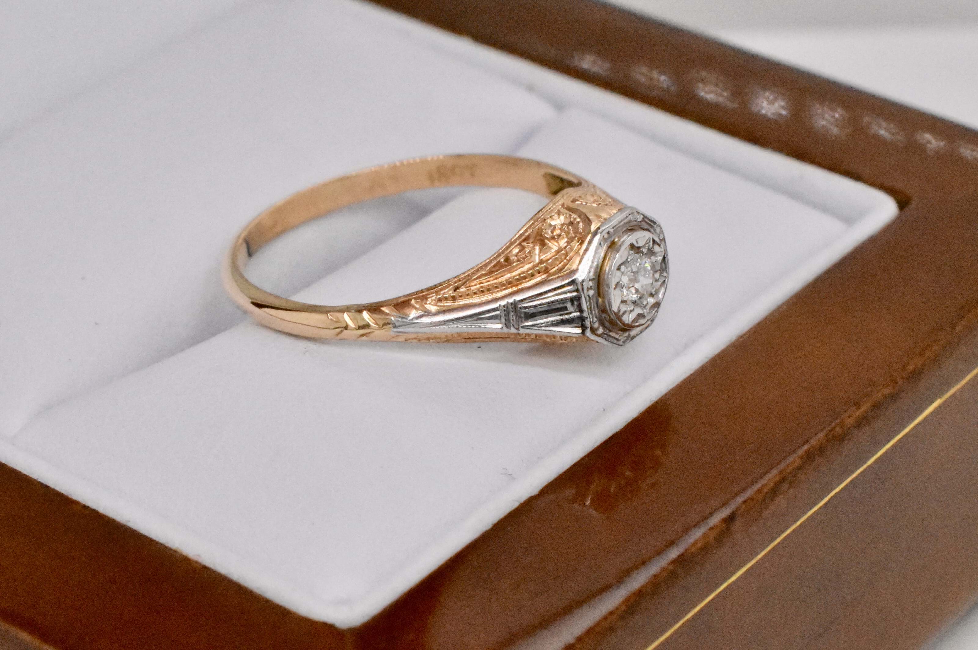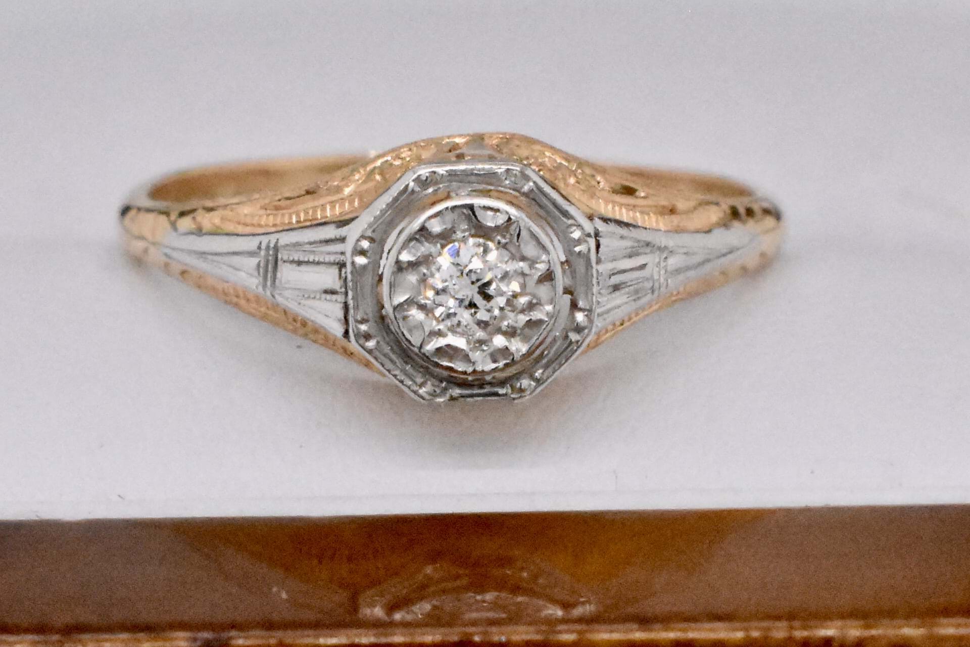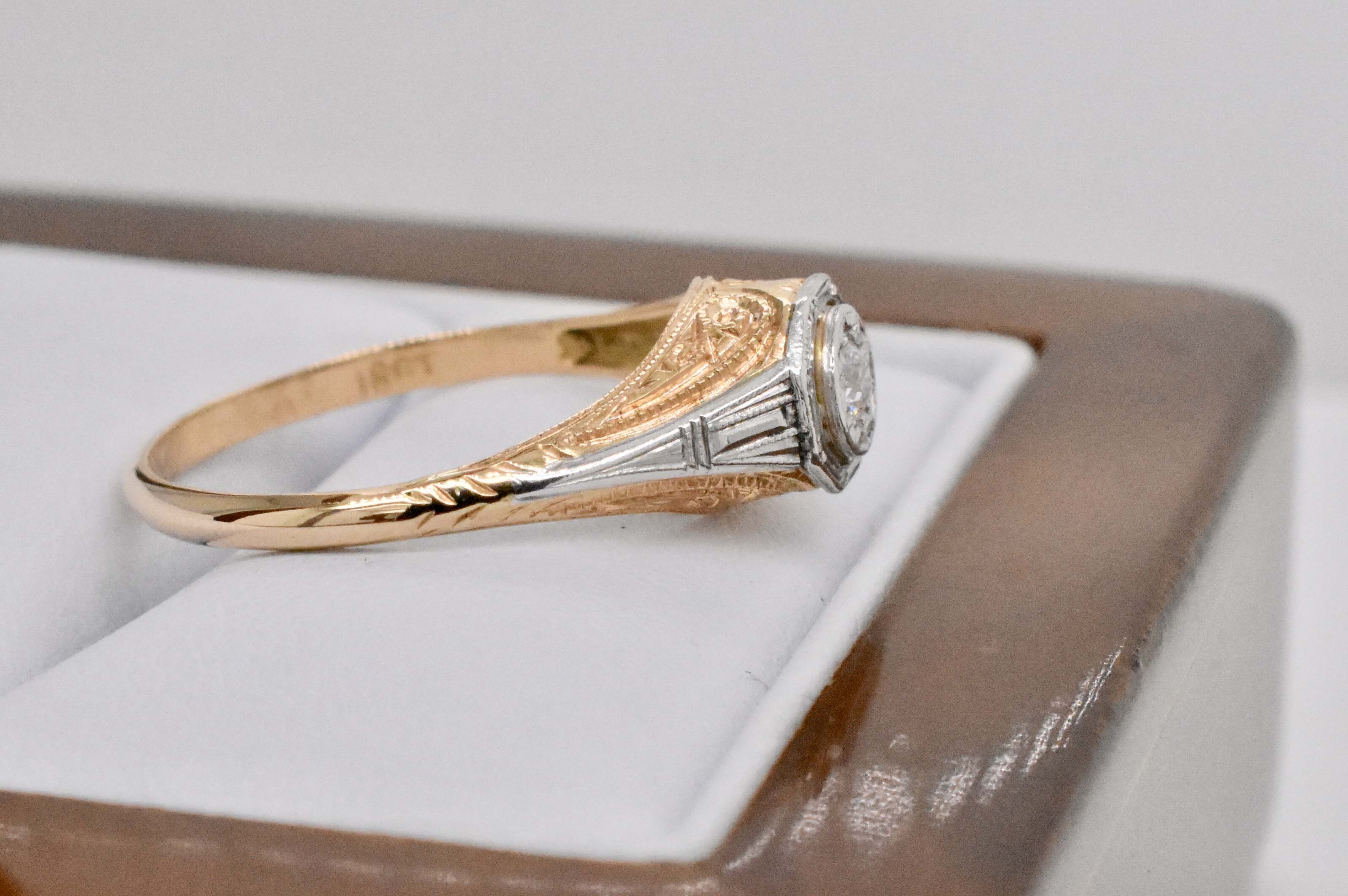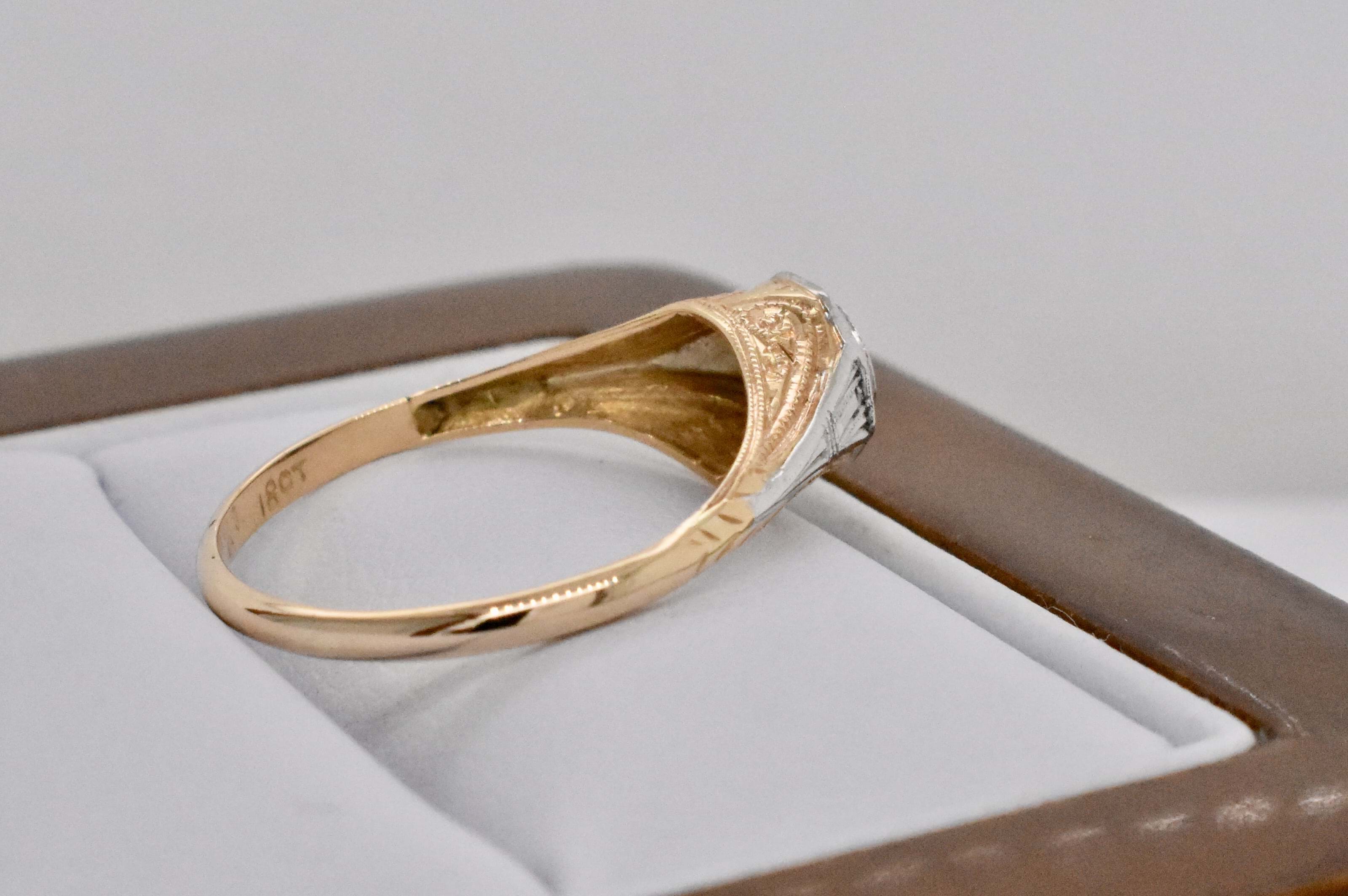 Handmade around 1910 this beautiful 18ct gold ring is in yellow gold with lovely highlights of white gold on the shoulders & on the top where the 0.08ct Old European Cut diamond is bezel set in the centre of the ring. Independent Valuation Supplied