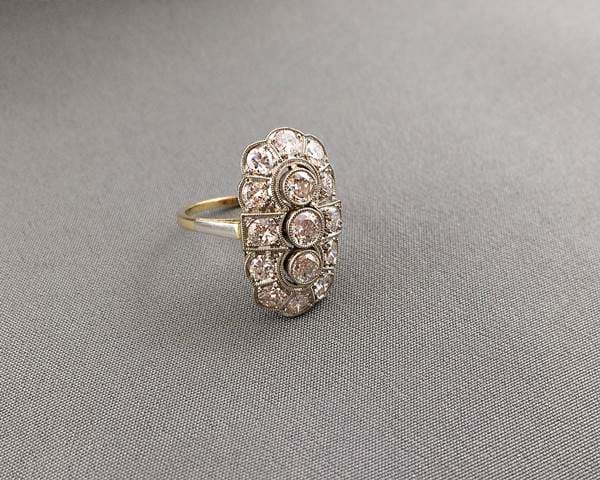 An impeccable 14ct yellow gold and platinum Art Deco Ring, featuring 1.80cts of semi-modern cut Diamonds. Independent Valuation supplied.