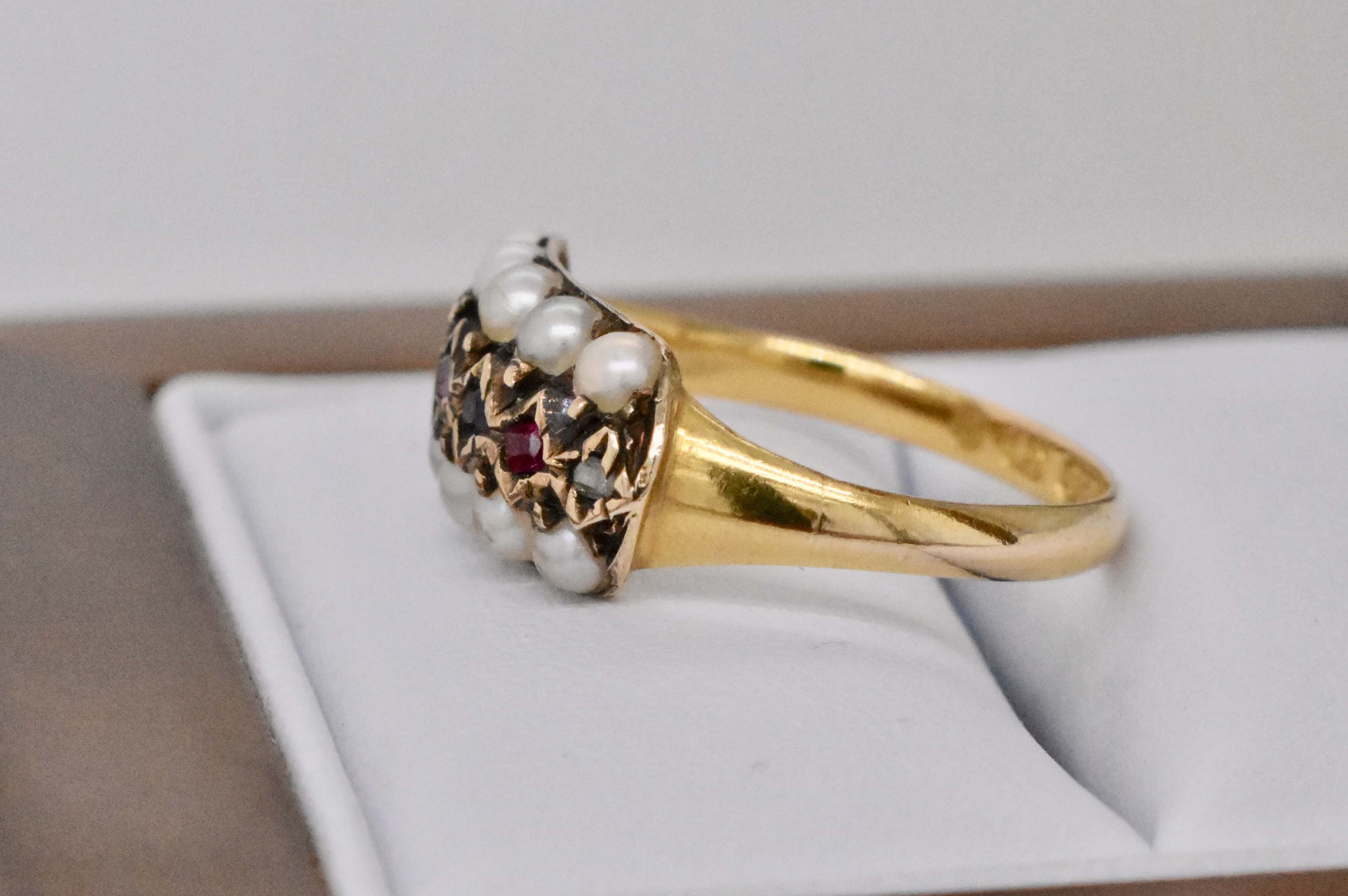 15ct Gold REGARD & Pearl Ring Hallmarked Birmingham 1874. Fun Fact: In the romantic era of the 1750s to the early 1900s, some the most favoured jewellery items to both give and receive, were gem set pieces designed to spell sentimental words such as “Regard” and “Dearest”.These words were acronyms, spelled using the first letter of each gemstone, for example, “REGARD” was spelled using an R for ruby, E for emerald, G for garnet, A for amethyst, R for ruby again and D for diamond. Independent Valuation Supplied. Finger size M