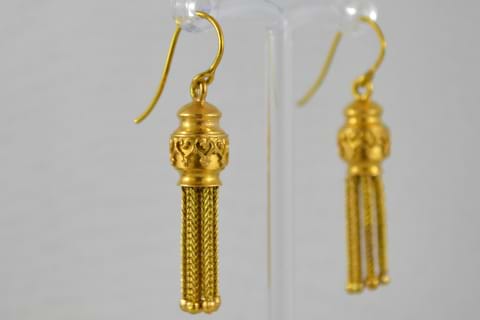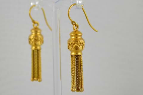 Rare and stunning. These 18ct yellow gold tassel earrings are a rare find and feature an embossed cap with foxtail link chain as the tassels, all suspended from a shepherd hook fitting. Circa 1890's. Independent Valuation Supplied