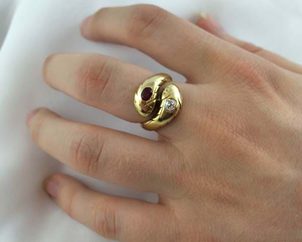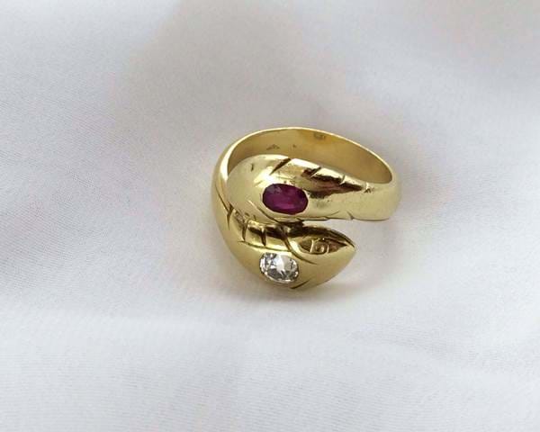 A rare 18ct gold double snake ring, featuring a 0.25ct Ruby & a 0.26ct Diamond. Circa 1880. Independent Valuation supplied.