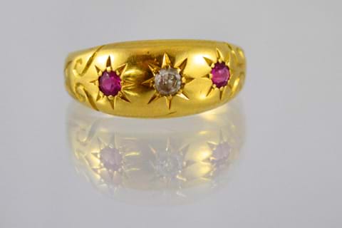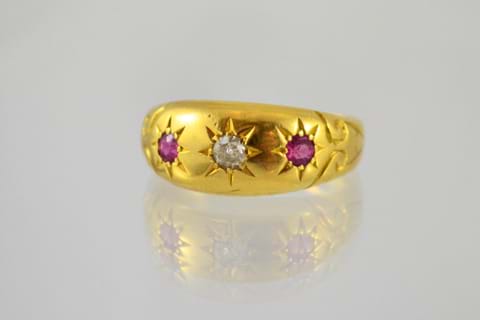 18ct yellow gold 'gypsy' ring featuring two synthetic rubies, star set, on either side of a single cut diamond in the centre. This piece is hallmarked 'Chester 1907' and an Independent Valuation is provided