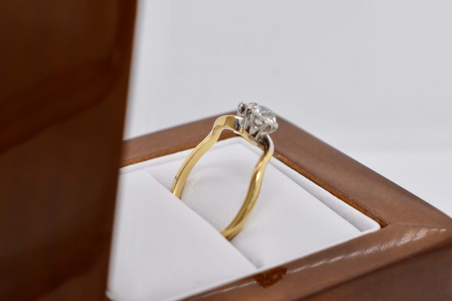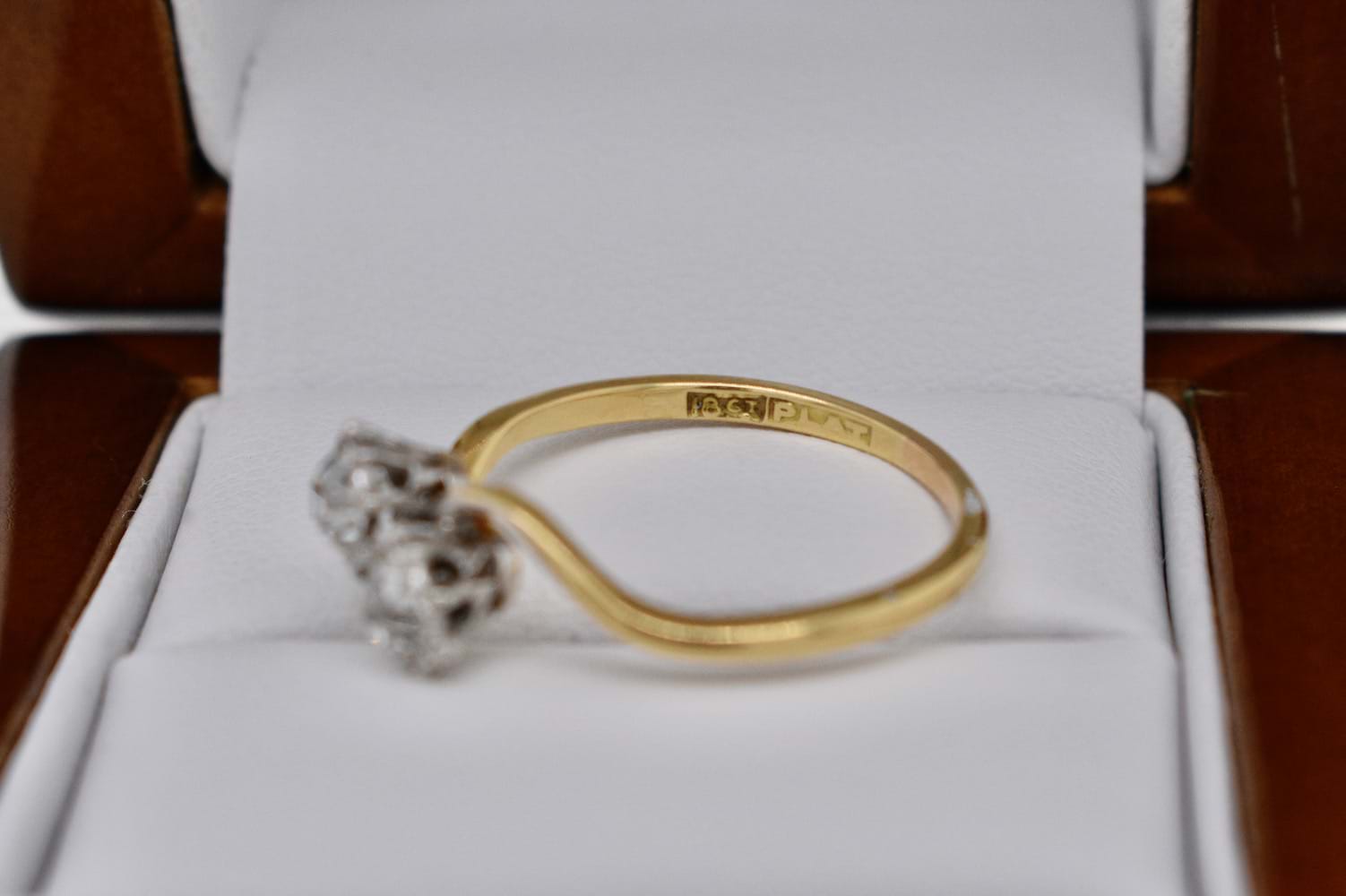 This gorgeous antique diamond ring is dated circa 1910 and has been crafted with an 18ct yellow gold curved band and platinum illusion grain settings featuring two offset old European cut diamonds totalling 0.50cts G/VS. Finger size O+ Independent Valuation Supplied