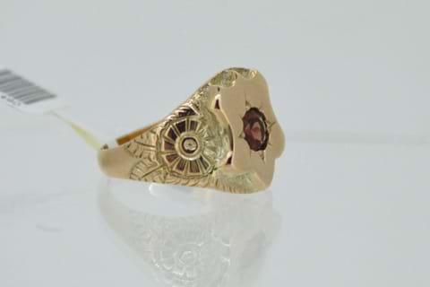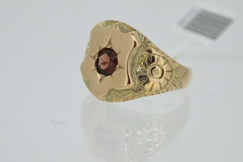 Crafted in 9ct yellow gold this antique shield shape signet ring has a raised plate star set with an almadine garnet in the centre and engraved/embossed raised shoulders. A fantastic piece for the next family heirloom or special occasion gift