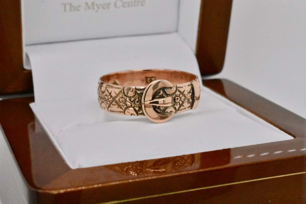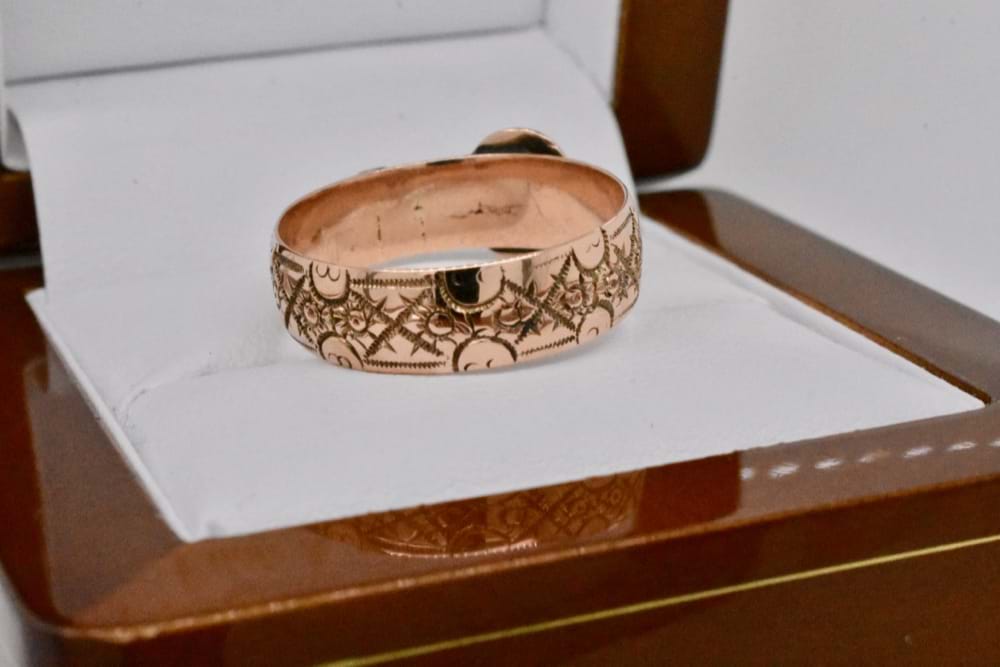 This intricately engraved buckle ring is crafted in 9ct rose gold and is fully hallmarked: London 1888. The buckle motif has been symbolic of loyalty, friendship and love and was particularly prominent in Victorian Jewellery. Independent Valuation Supplied