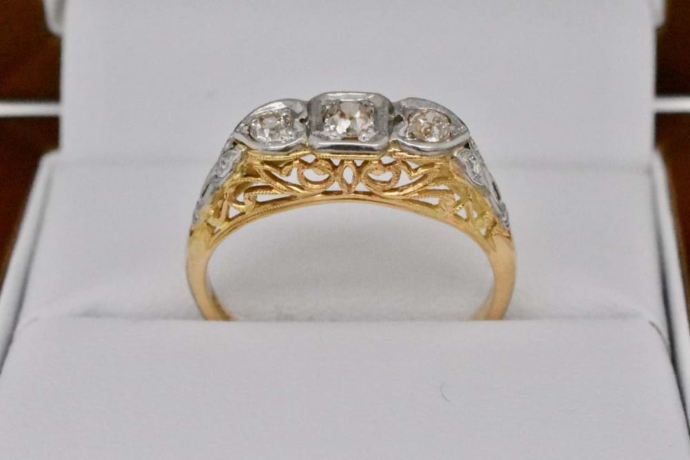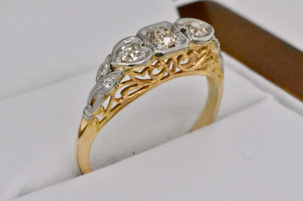This antique bridge ring has all the features of a 1930's bridge with a platinum top and delicate scroll gallery carved out in 18ct yellow gold with three diamonds totalling 0.12cts. Independent Valuation Supplied.