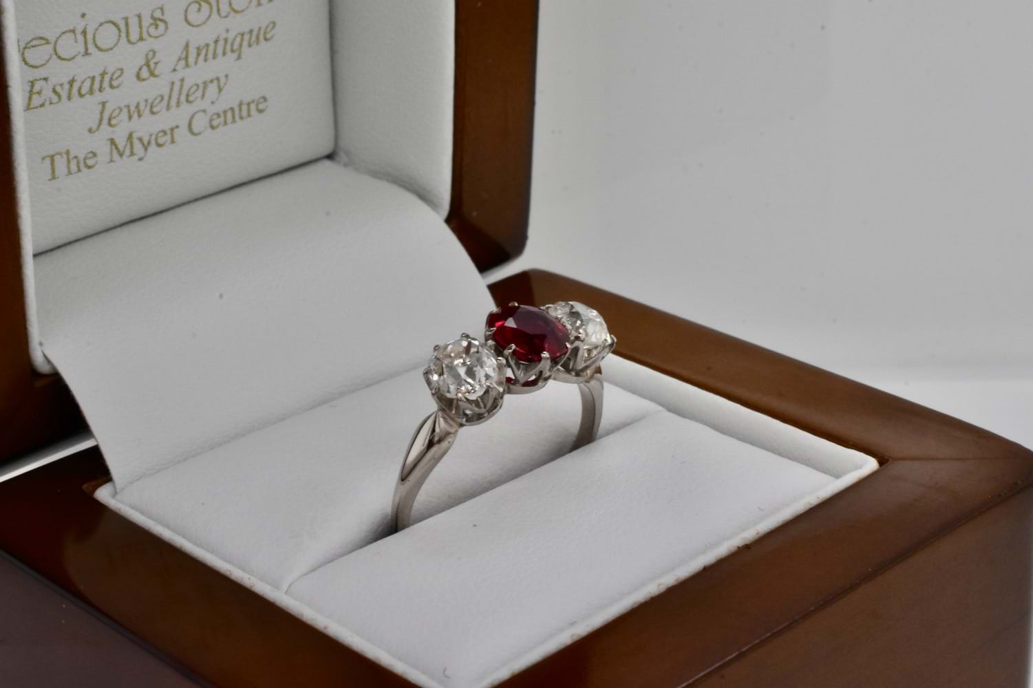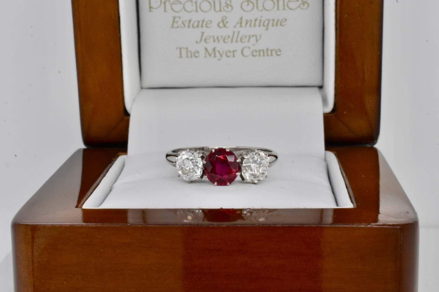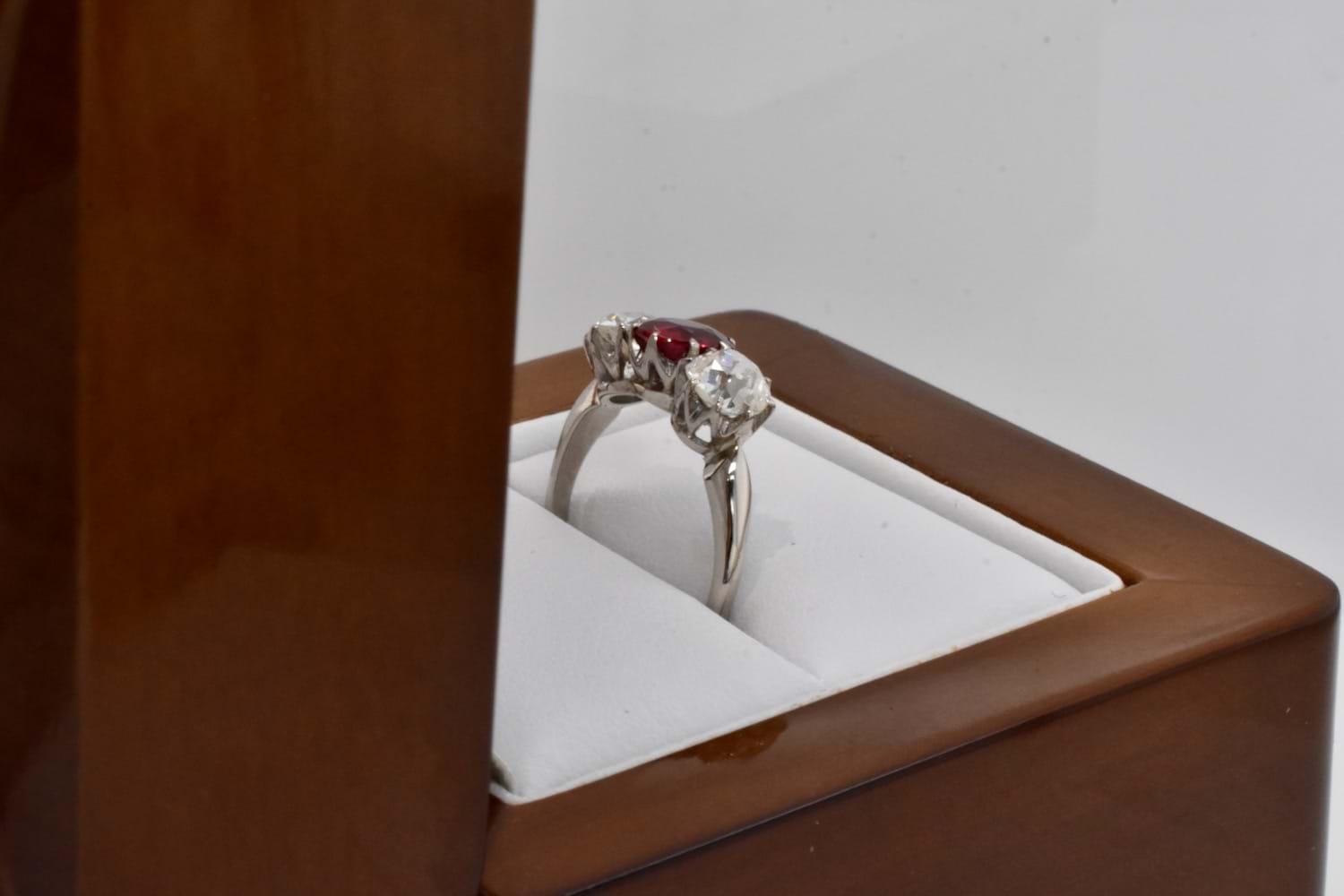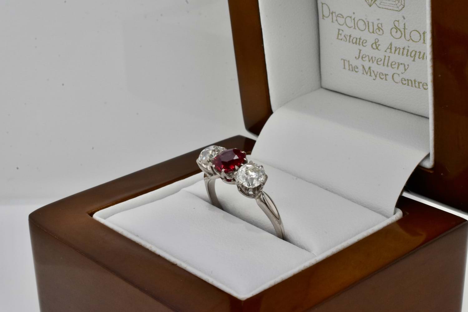This spectacular 1950s trilogy ring has been crafted in 18ct white gold and features a stunning, rare and beautiful cushion cut 1ct Burmese ruby flanked by an antique cushion cut diamond eight claw set on each side. The two diamonds have a beautiful antique scintillation and total 1.25cts (HI/SI2) and the ring is entirely handmade. Finger size O. Independent Valuation & Spectra Gem Lab report stating the ruby is untreated.