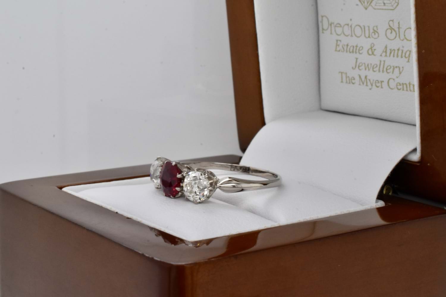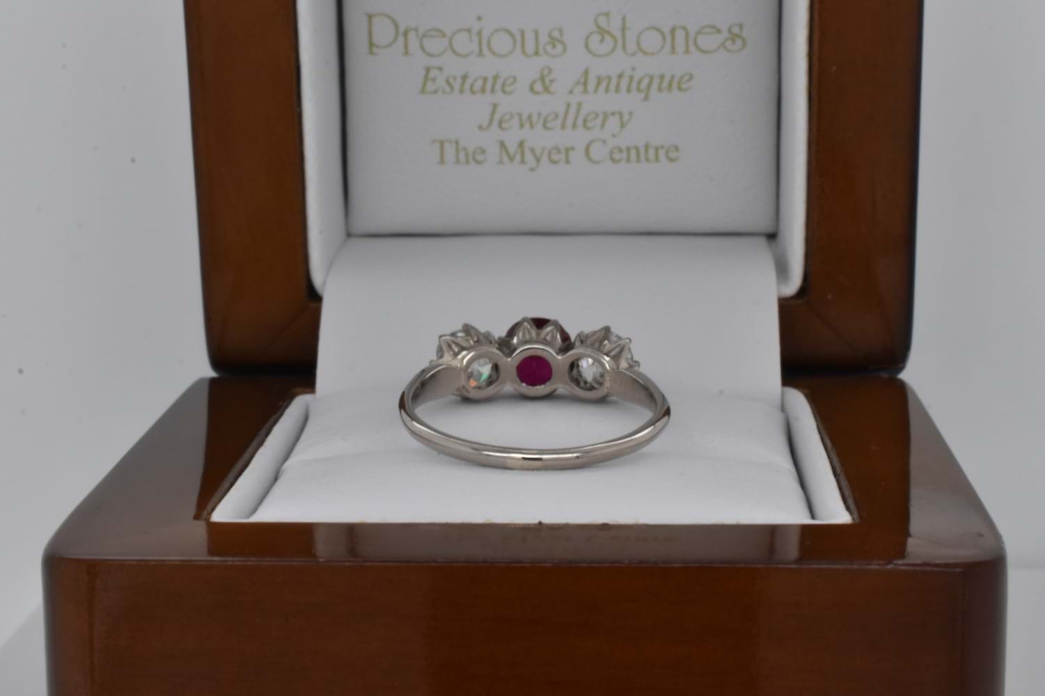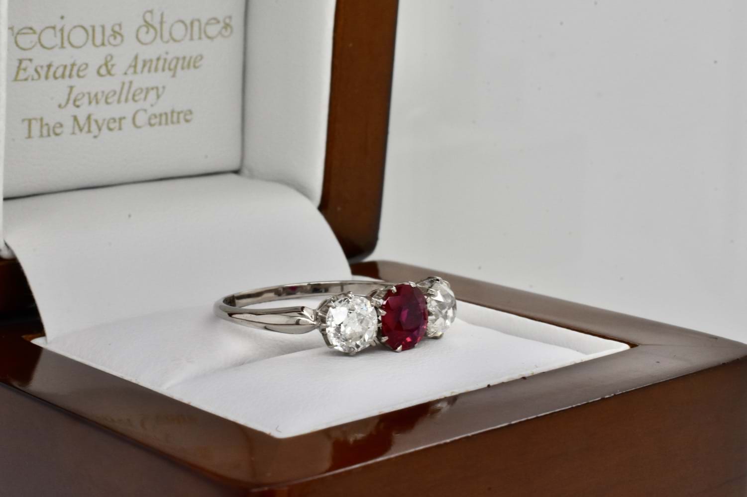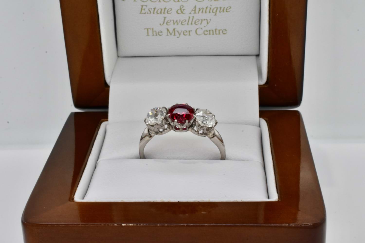 This spectacular 1950s trilogy ring has been crafted in 18ct white gold and features a stunning, rare and beautiful cushion cut 1ct Burmese ruby flanked by an antique cushion cut diamond eight claw set on each side. The two diamonds have a beautiful antique scintillation and total 1.25cts (HI/SI2) and the ring is entirely handmade. Finger size O. Independent Valuation & Spectra Gem Lab report stating the ruby is untreated.