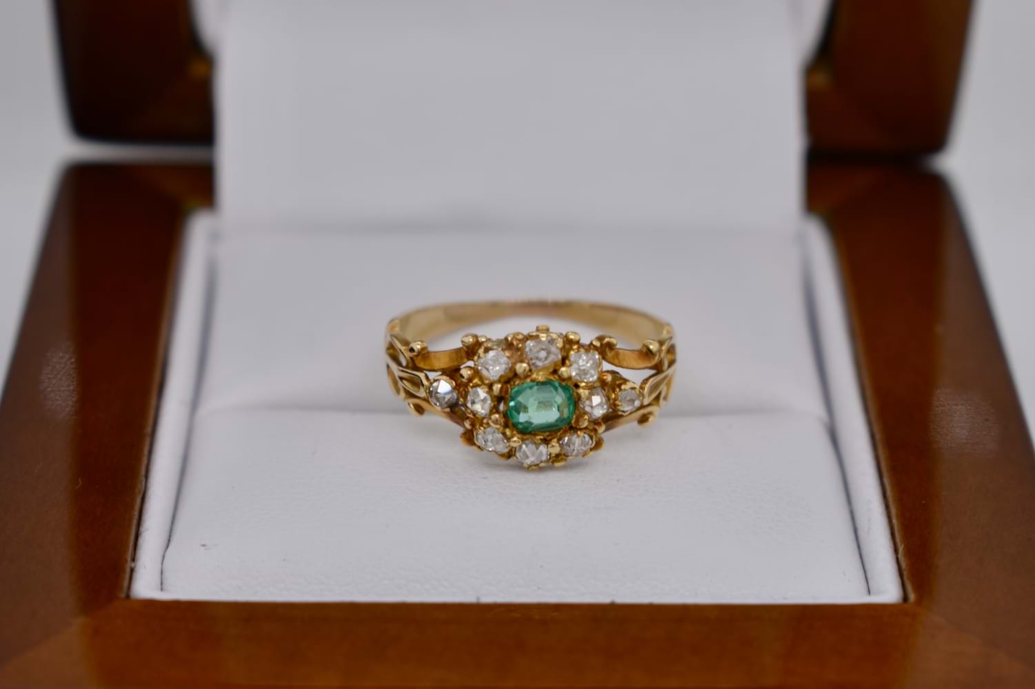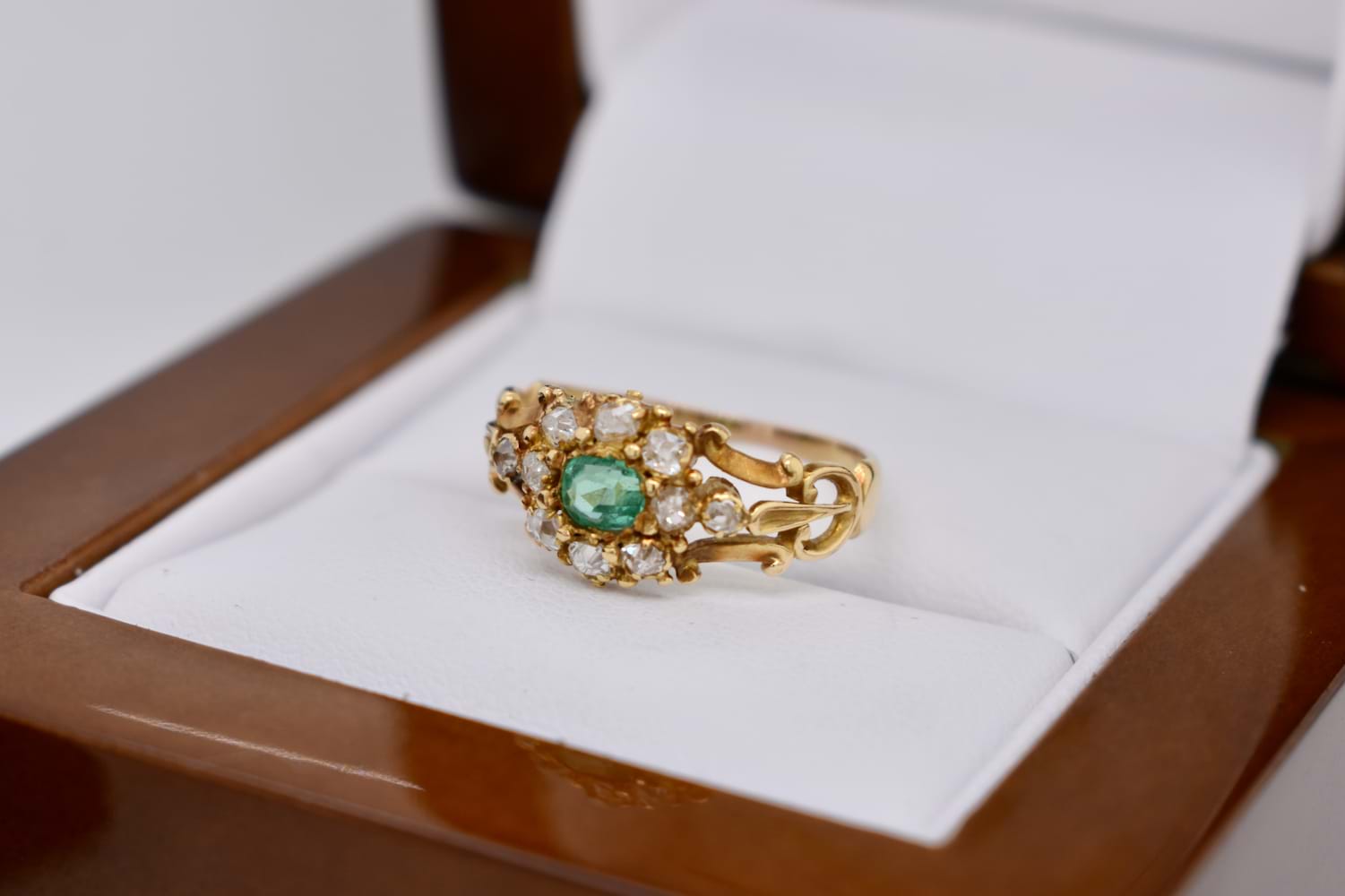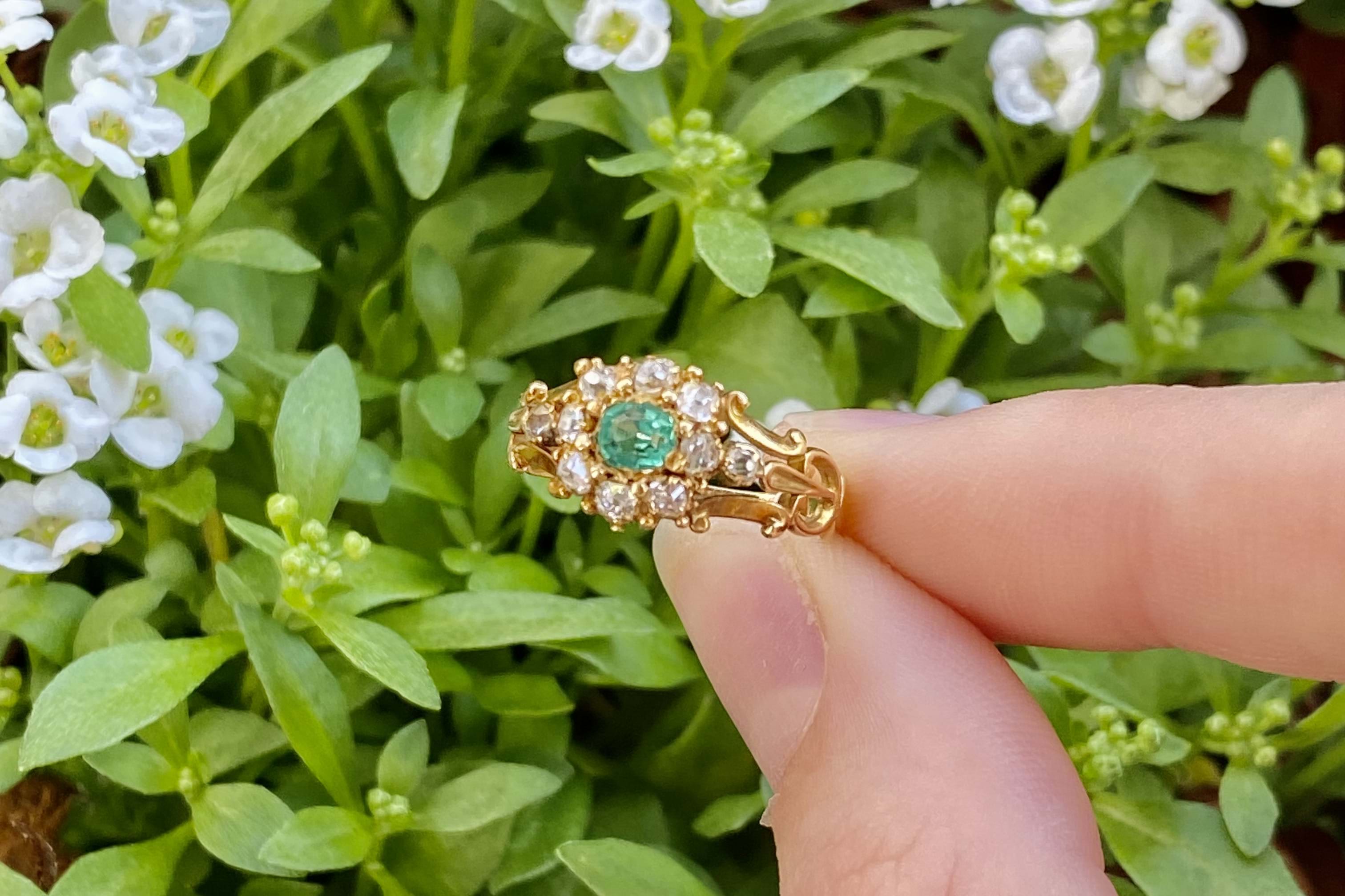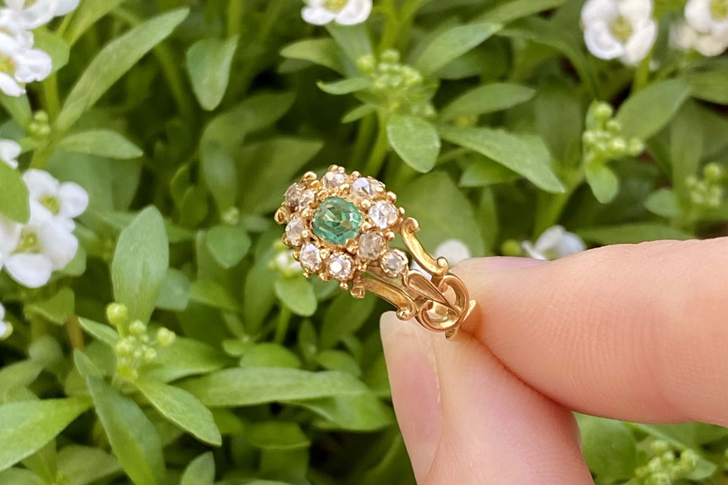 SOLD Antique 18ct Yellow Gold 0.20ct Emerald & 0.30ct Diamond Cluster Ring