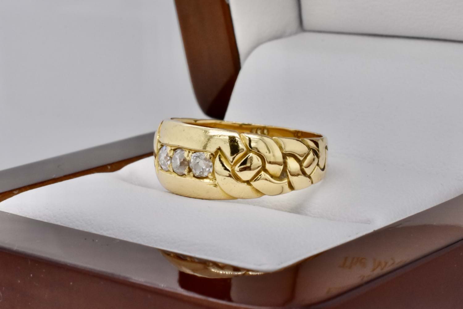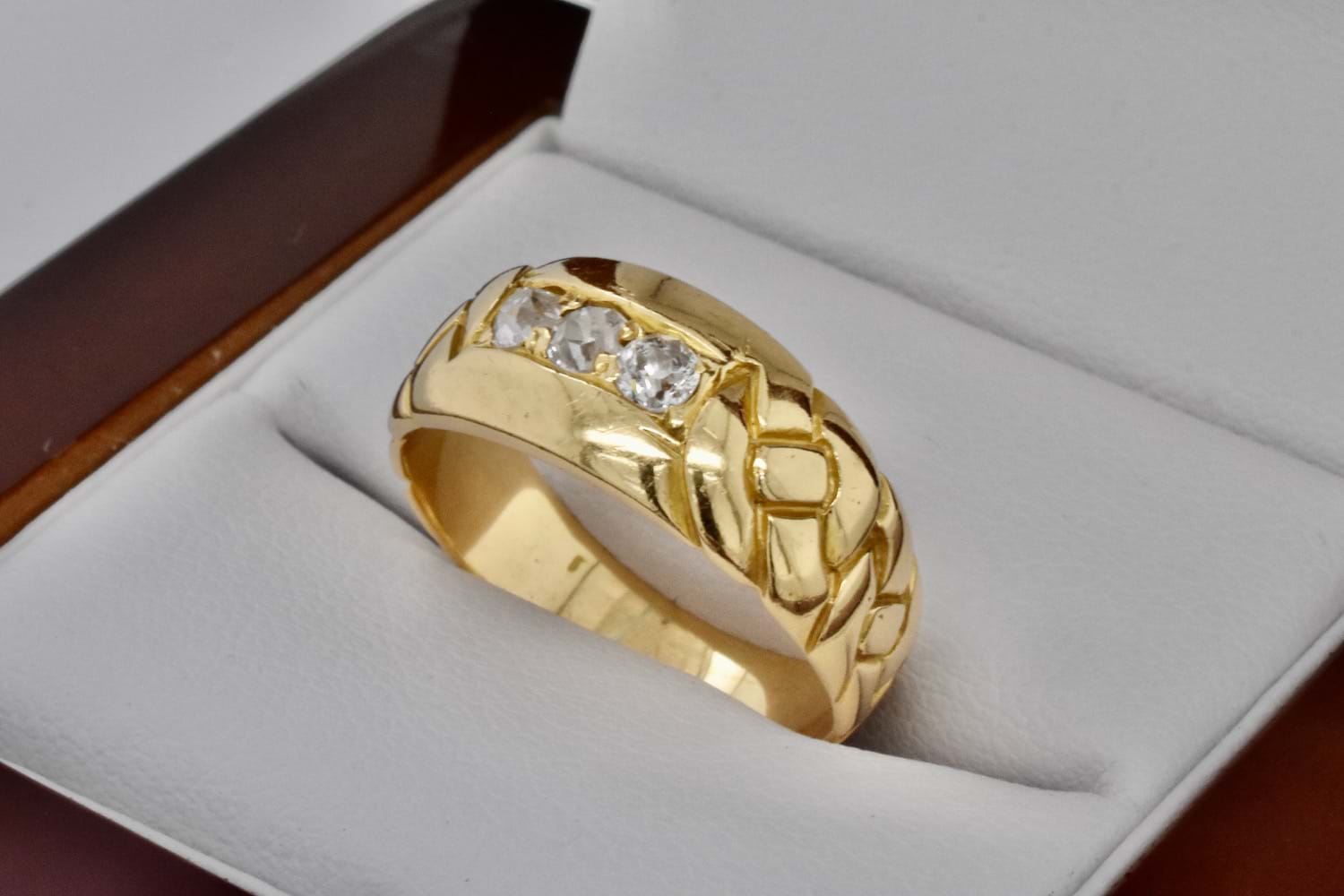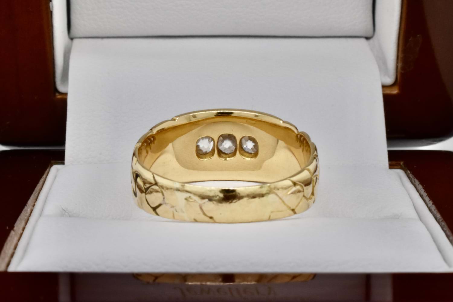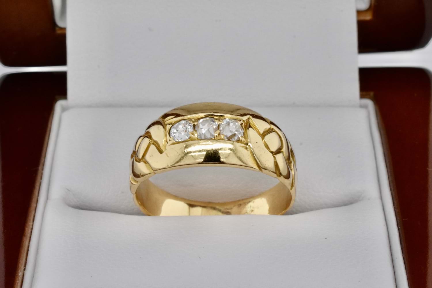 This beautiful antique diamond ring has been crafted in 18ct yellow gold and has an 8mm wide top tapering down to 3.7mm at base. It features three old European cut diamonds grain set totalling 0.27cts (H/SI) with plait style engraving on each side. Finger size N. Independent Valuation Supplied
