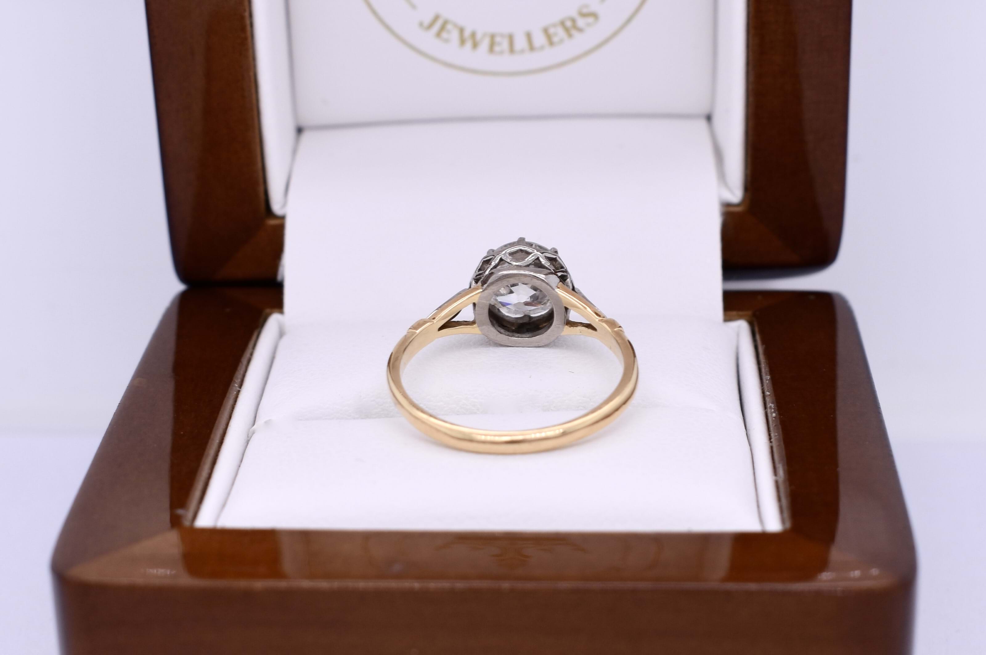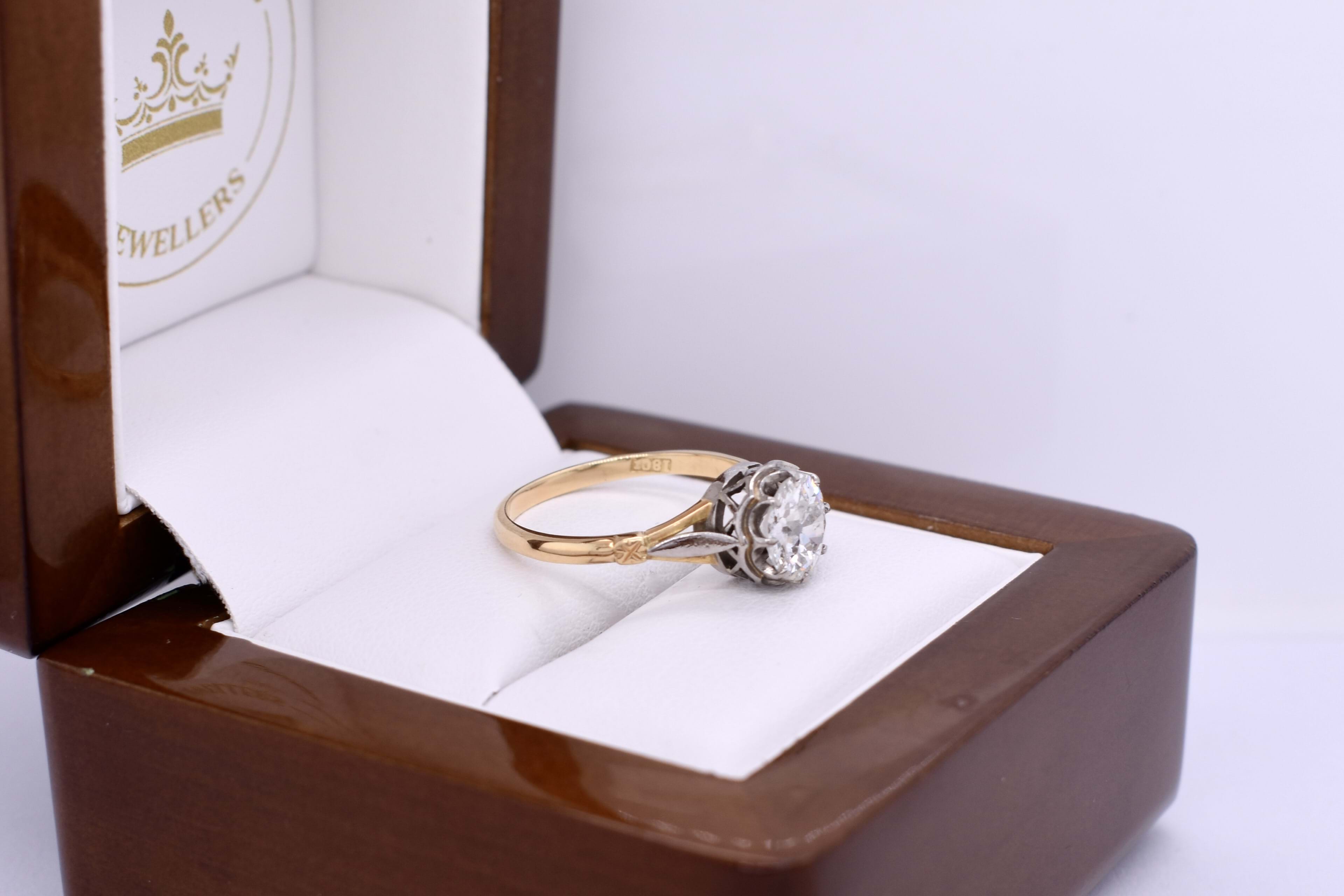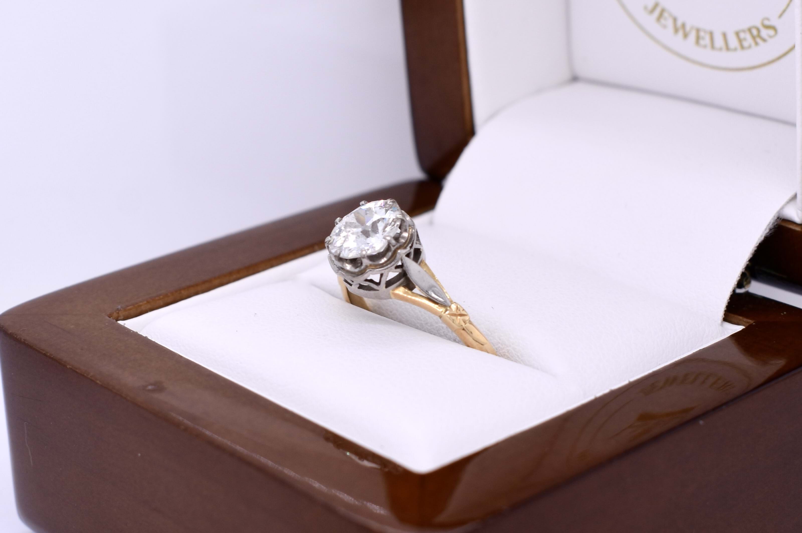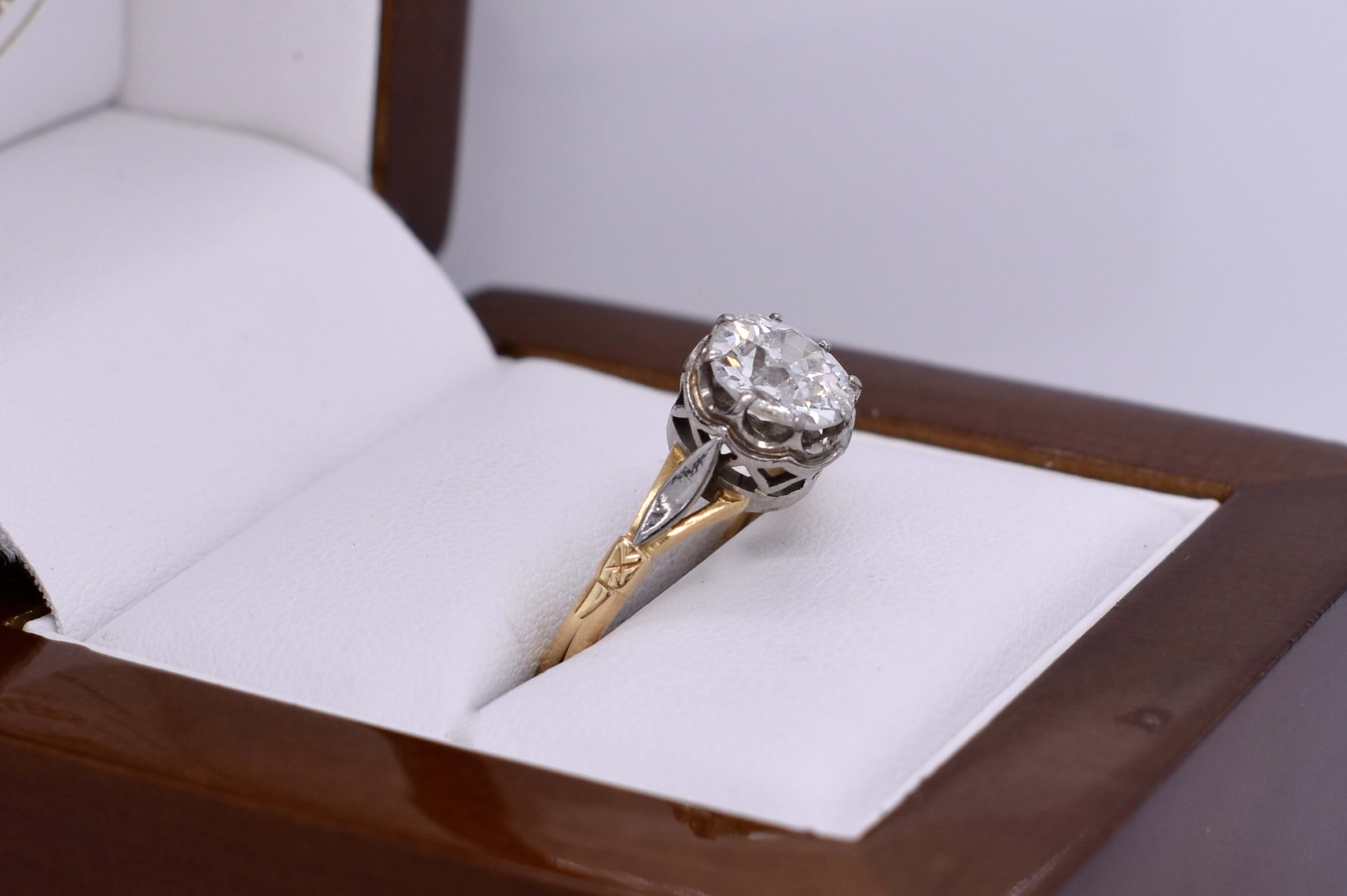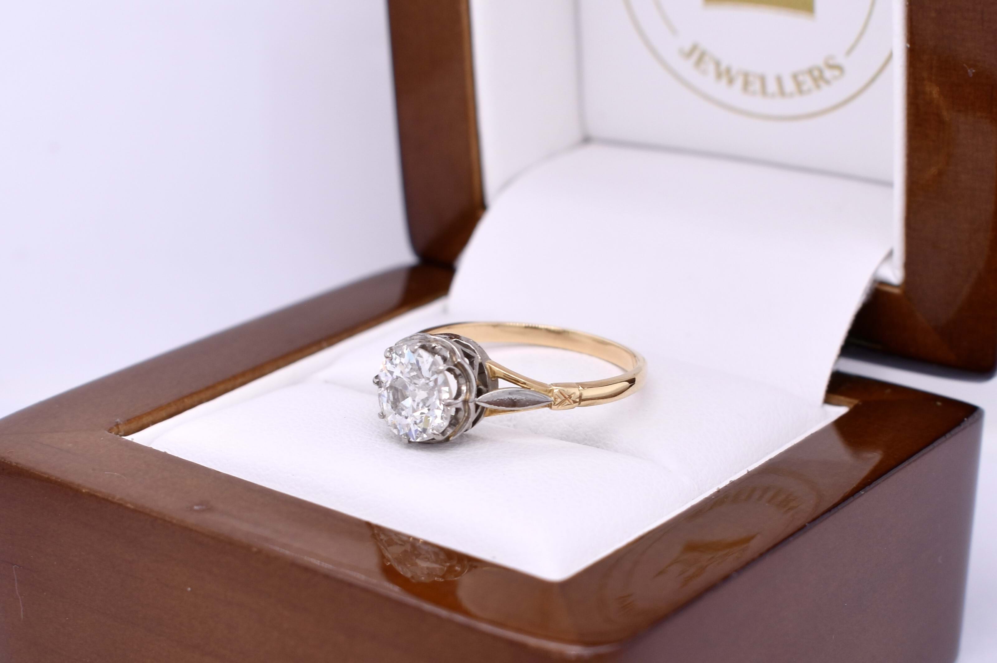 This stunning old European cut diamond, measuring 7.20x7.15x3.95mm, is eight claw set in 18ct white gold claws, with a pierced out collet and white gold leaf style detailing. Finished on a handmade 18ct yellow gold split shoulder 1.75mm band. This beautiful antique diamond equals 1.45ct G P1. Finger size N+. Independent Valuation Supplied