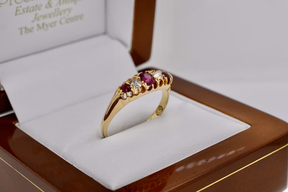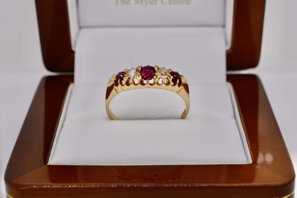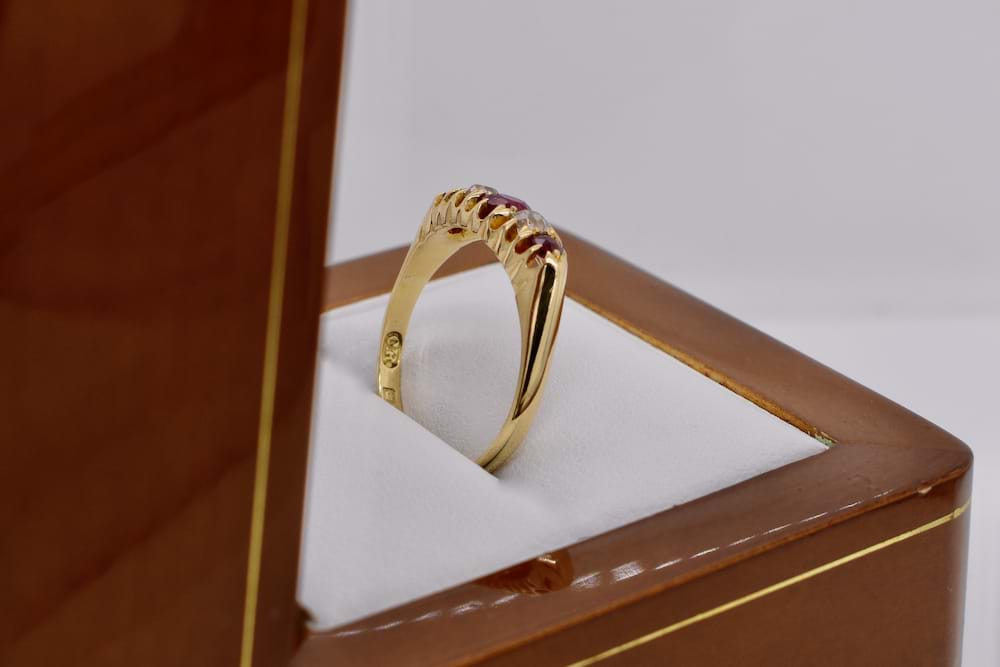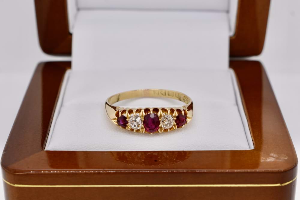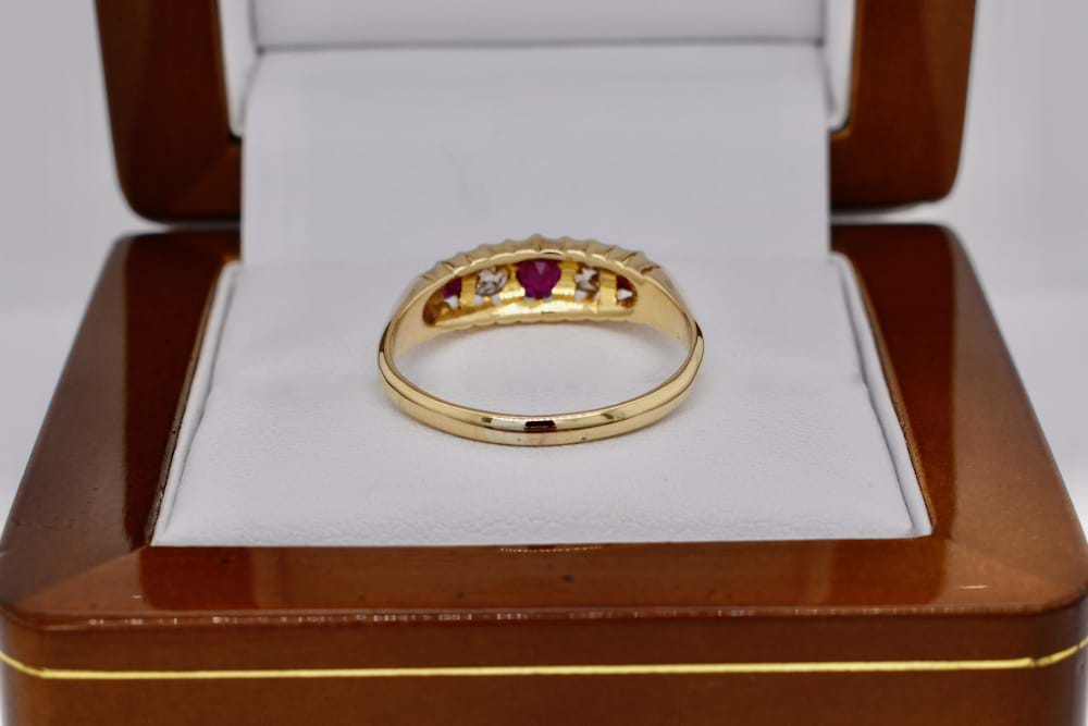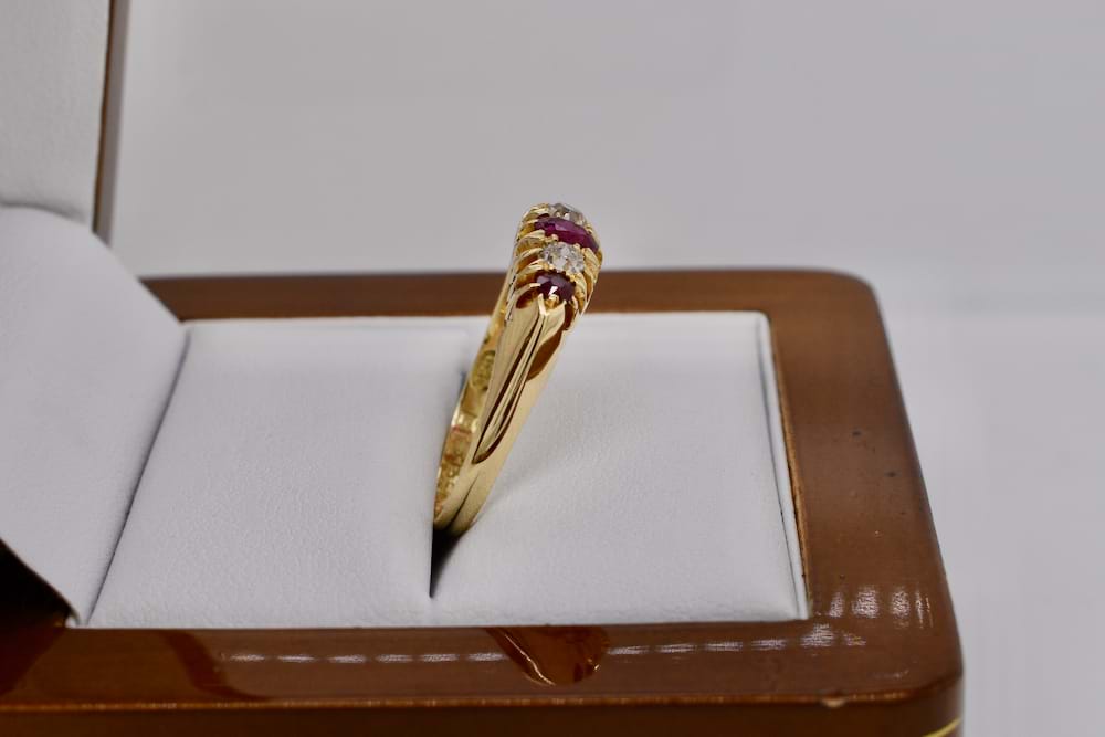 This stunning handmade antique 18ct yellow gold ring is hallmarked 'Chester 1907' and features three purplish red rubies equalling 0.59ct complimented by special old mine cut diamonds two equalling 0.30ct TTLB SI-P1, set into a beautiful bridge style. Finger size R. Independent valuation supplied