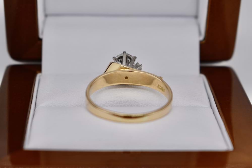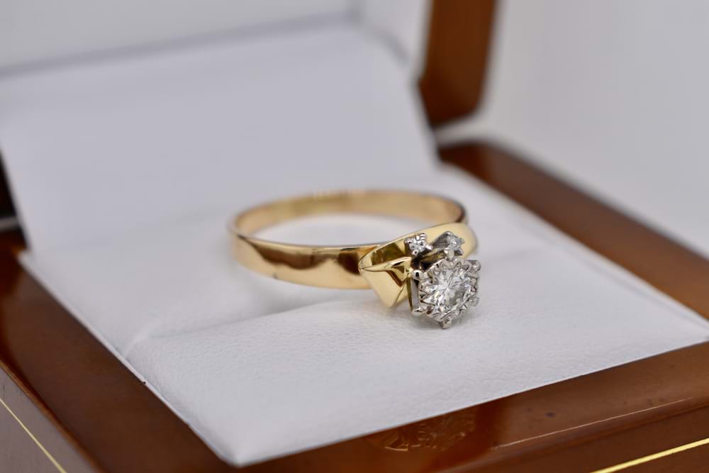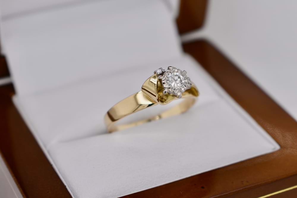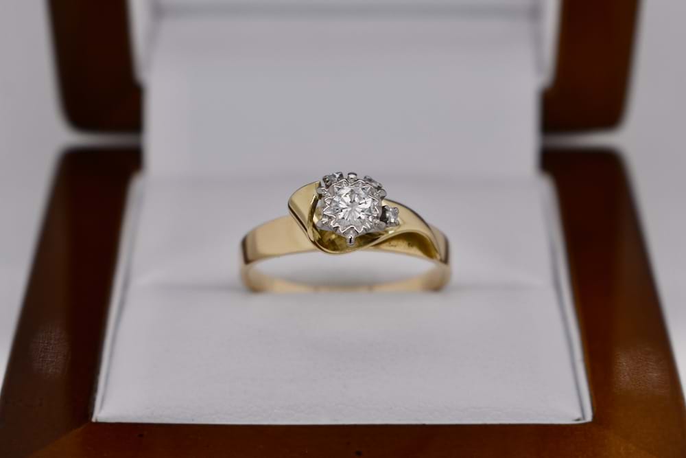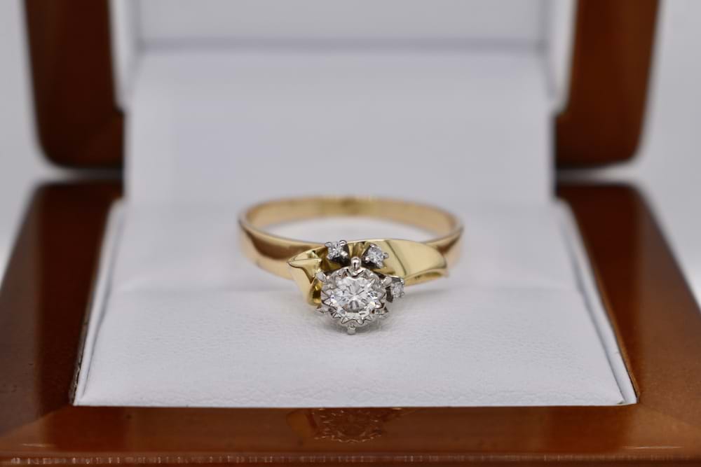This gorgeous antique 18ct yellow gold ring (Circa 1960) features a 0.25ct H/VS diamond in the centre with three H/SI diamonds on the outside. The band features a beautiful scroll detail on the top giving the ring an elegant yet striking look. Finger size S