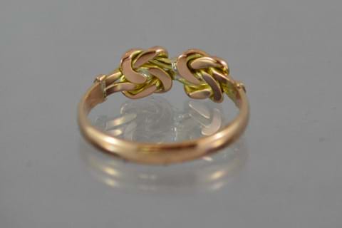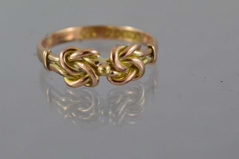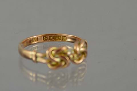 This lovely antique ring is a simple but detailed with a fluid double knot design and is hallmarked "Chester 1901". Crafted in a 9ct "old gold" this ring is not quite yellow or rose in colour and is a testiment to the age of the piece. Independent Valuation Supplied