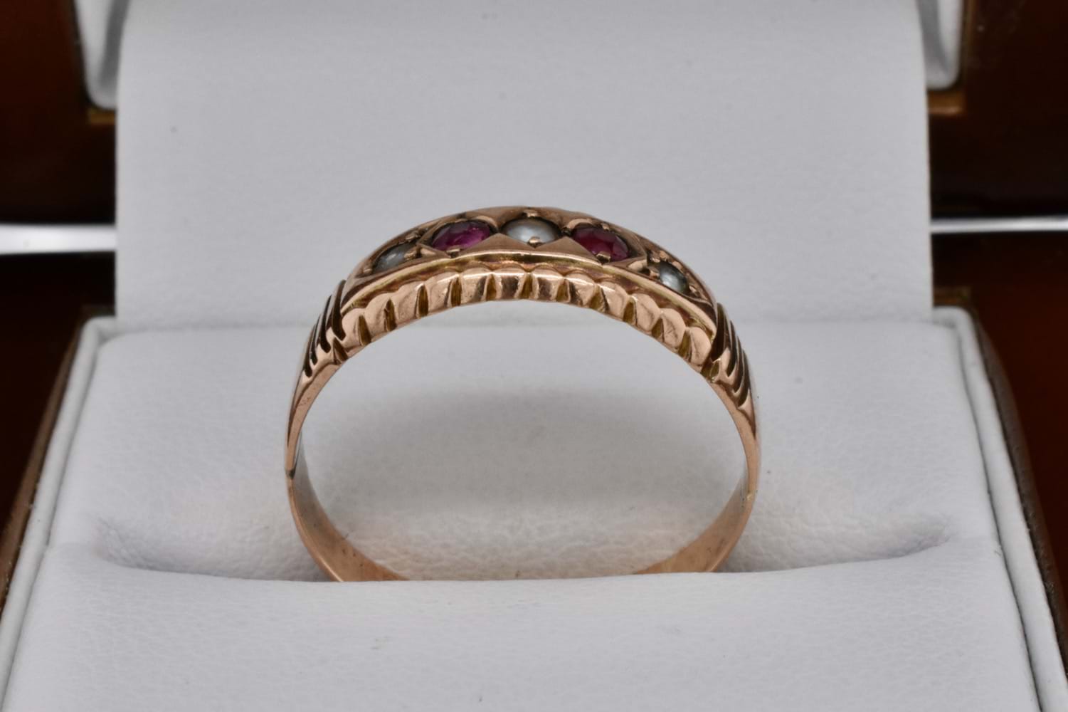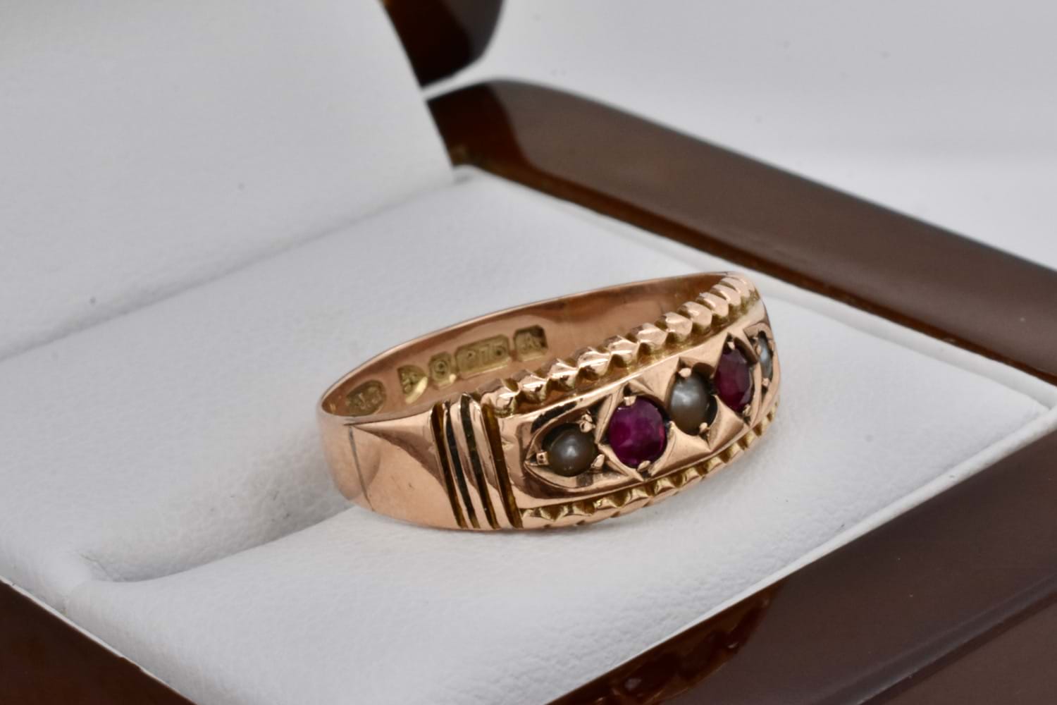 This delightful antique 9ct yellow gold ring features three seed pearls and two garnets grain set in diamond shape bezels with an engraved border. The ring is hallmarked Birmingham 1901. Finger size N.