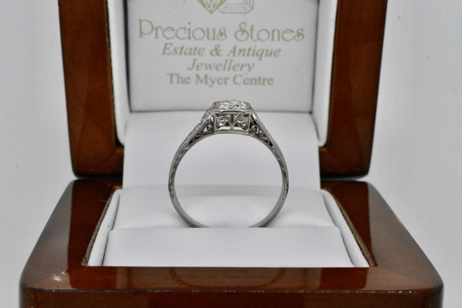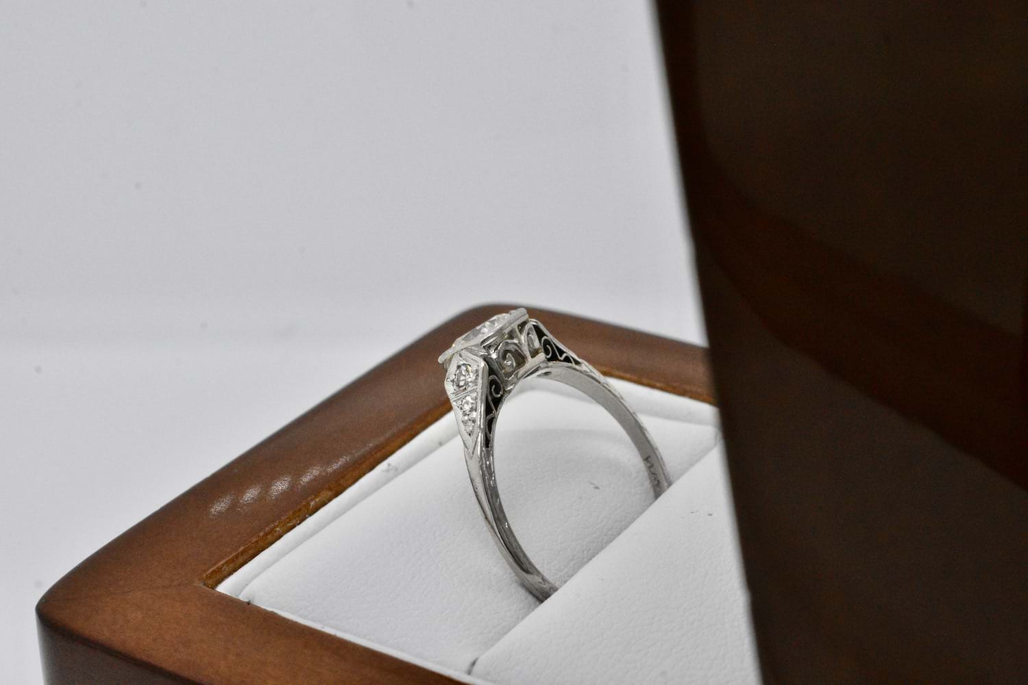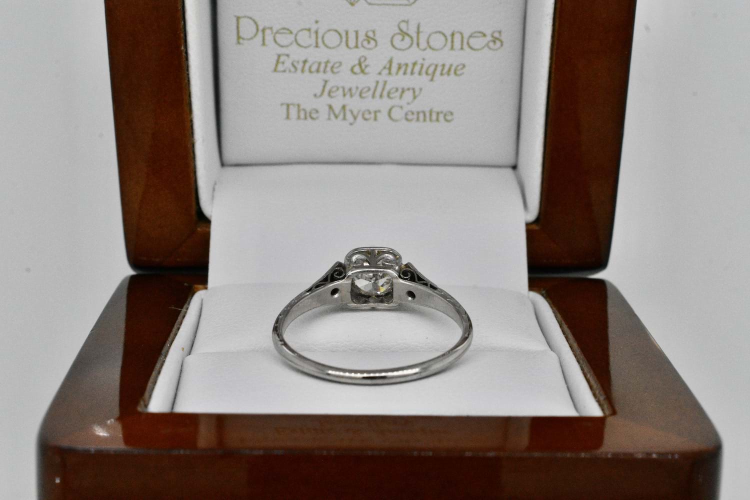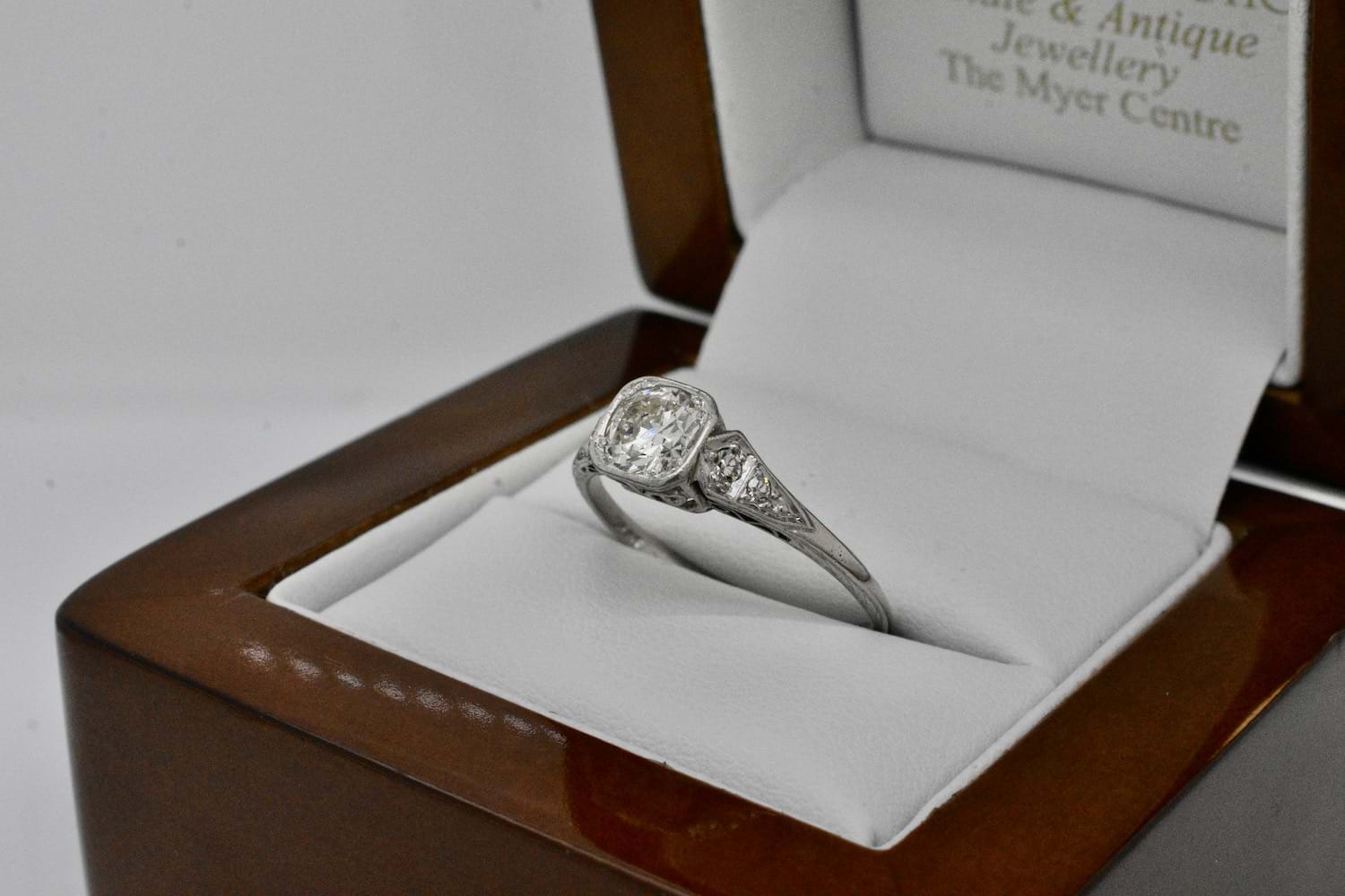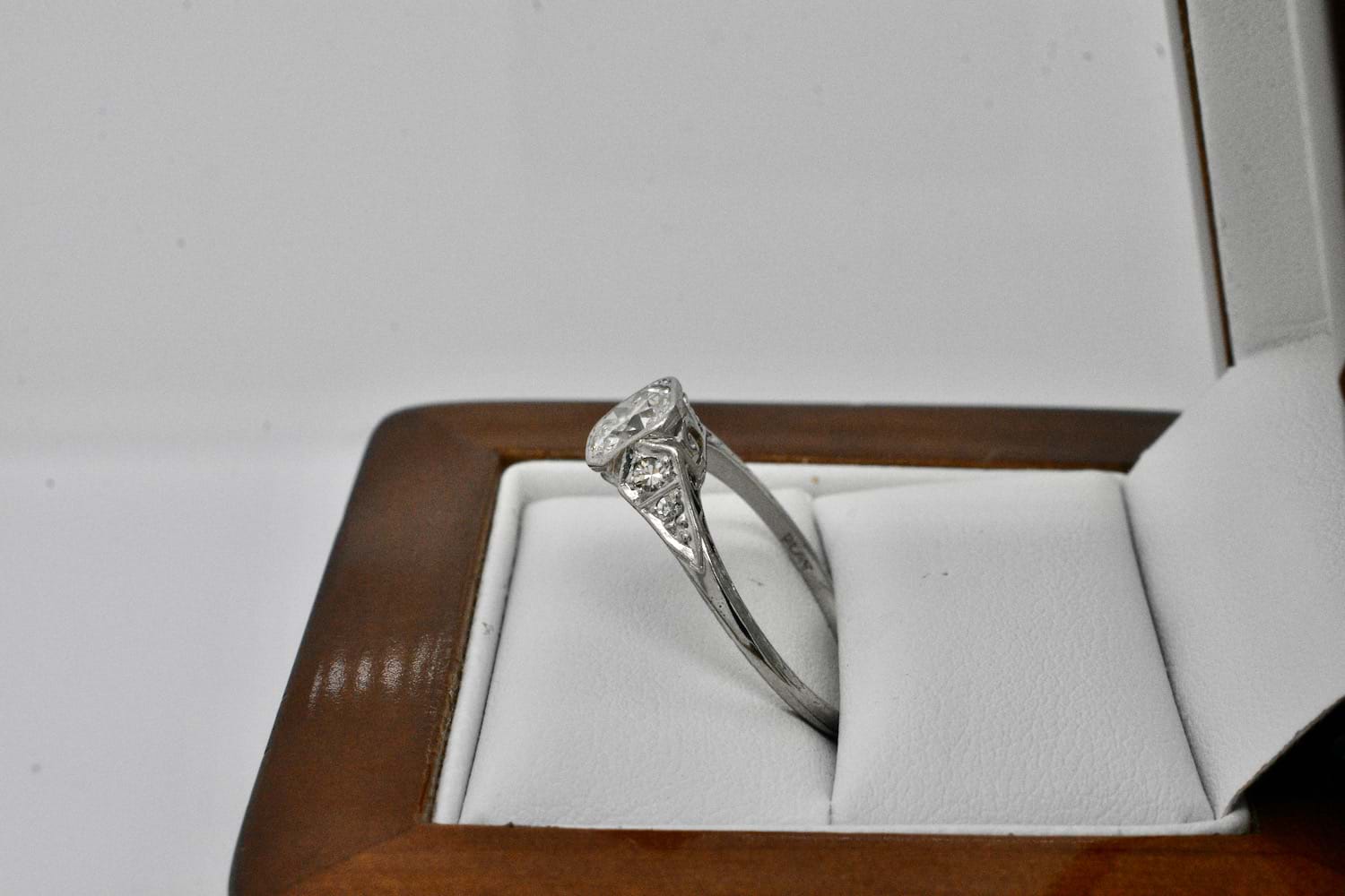 This beautiful and sparkling Art Deco platinum ring features a centre 0.55ct H/VS-SI white, scintillating semi modern cut diamond which was popular of the time, grain set and complimented by two 0.02ct H/VS-SI single cut diamonds on either side for a total of four equalling 0.08ct. The side stones are set into an elegant tapered shield-esque shape with a beautiful scrollwork gallery on a fine tapered band. Circa 1920. Finger size Q. Independent Valuation Supplied