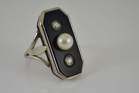 SOLD French 18ct Antique Onyx, Diamond & Pearl Ring