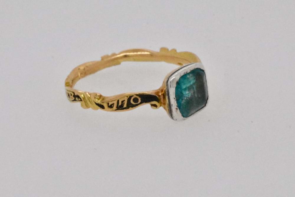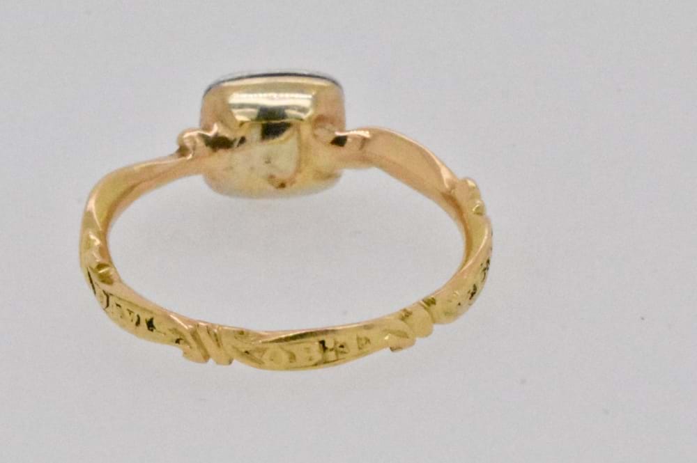 Rare and beautiful. A Georgian memory ring dated circa 1800 featuring an emerald cut emerald in a closed back rub over setting with very worn black enamel on the band. Due to its age the wear is evident on this piece and is available for sale in as is condition. Independent Valuation Supplied