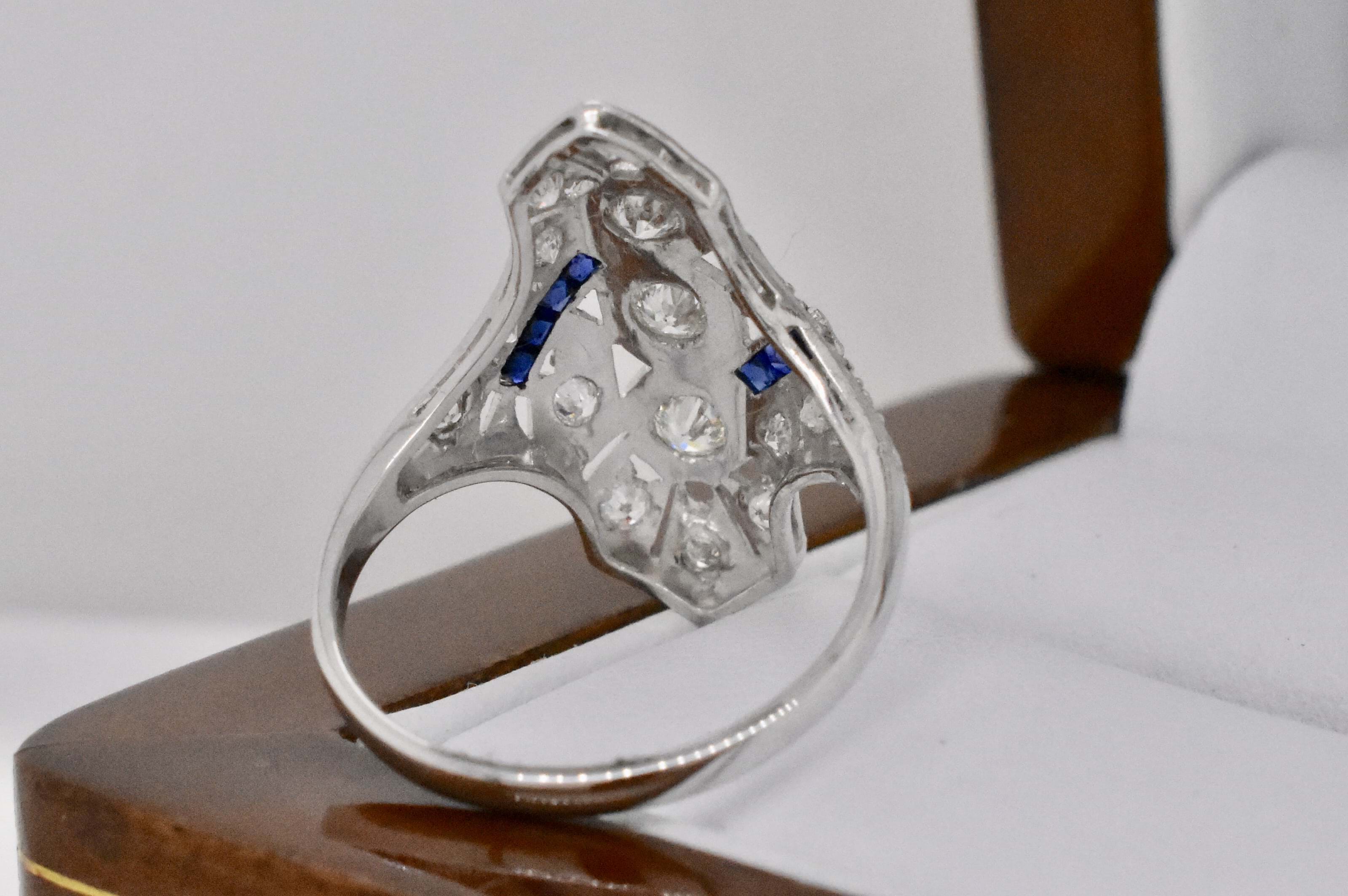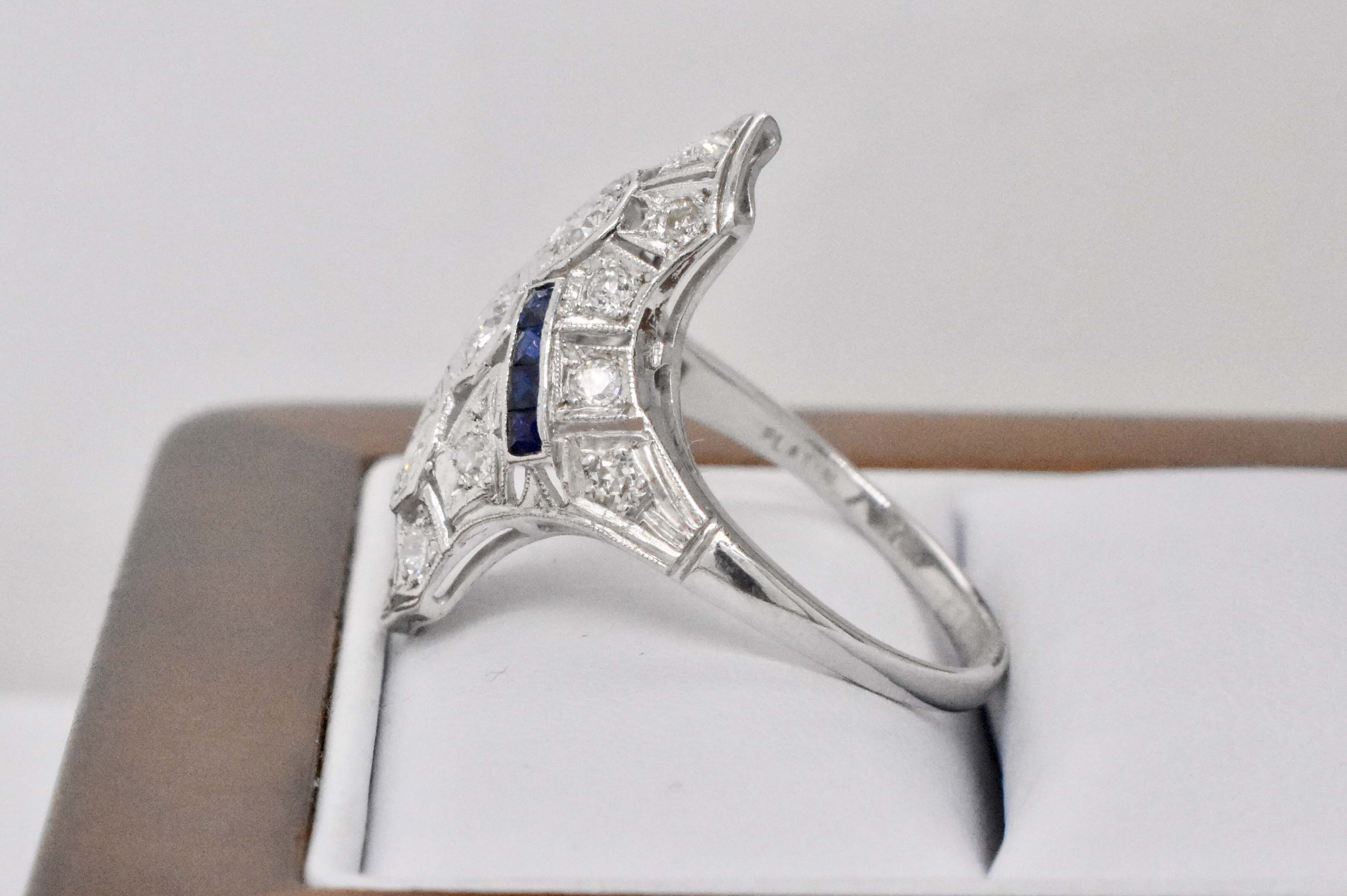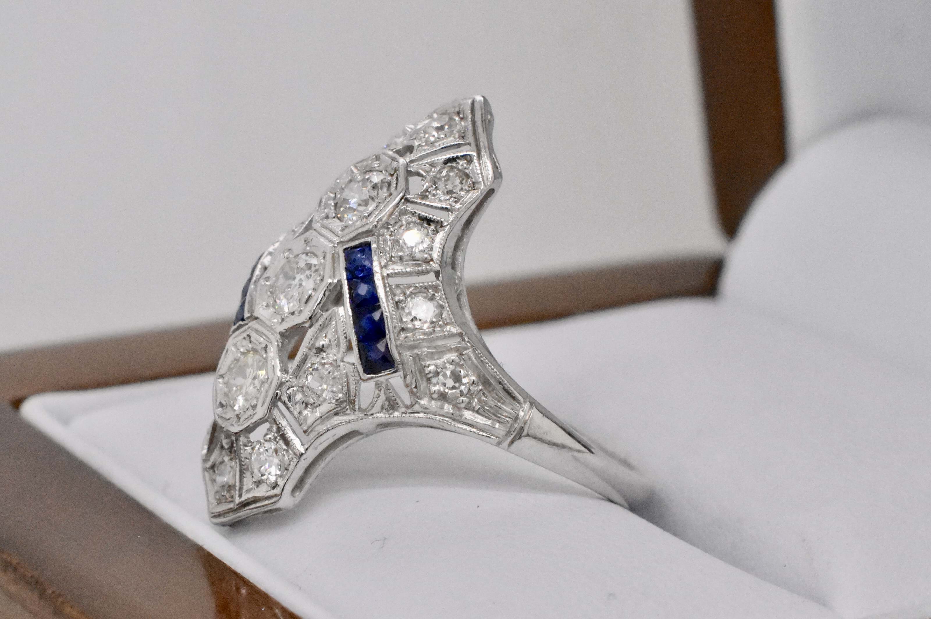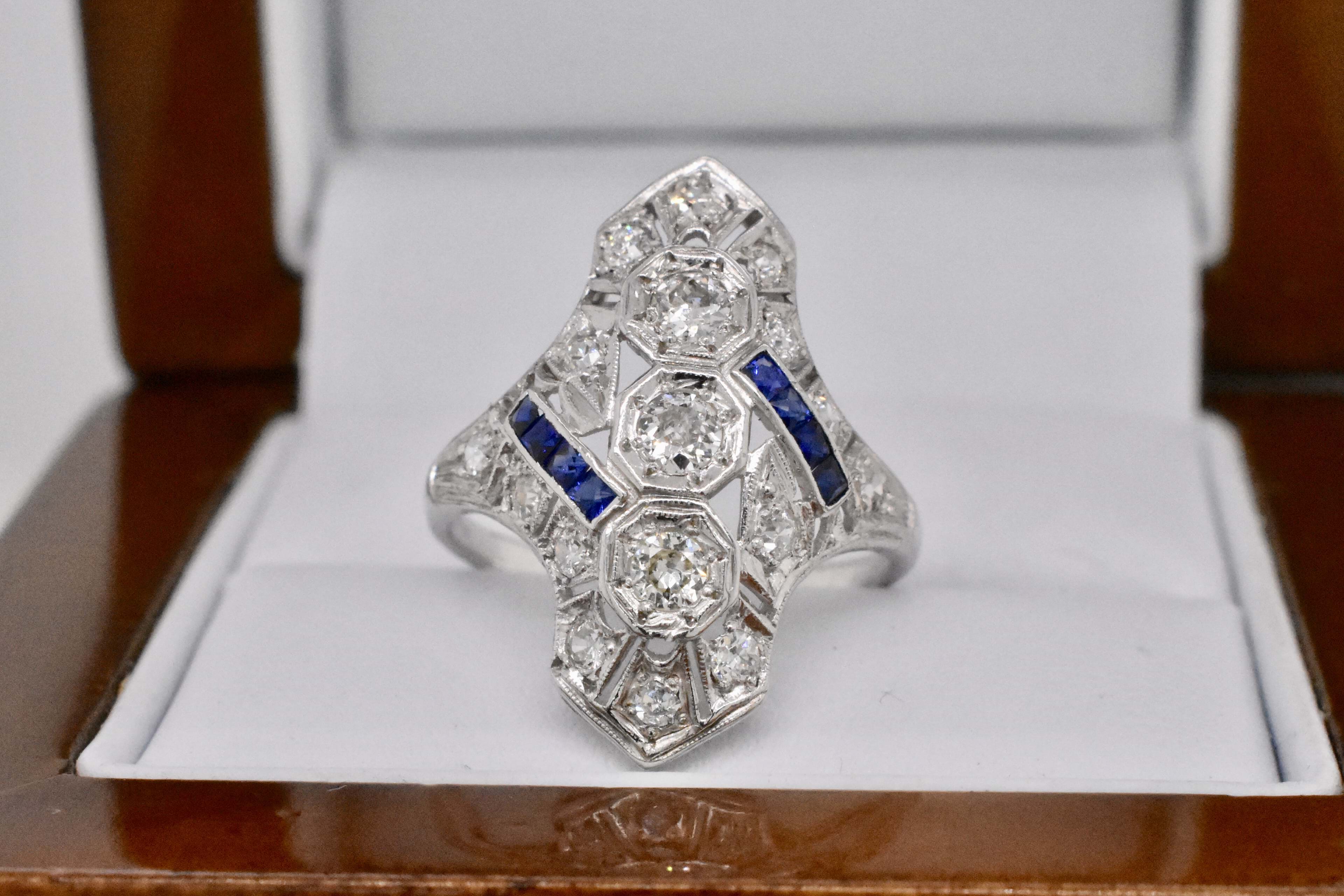 This Platinum original Art Deco ring features 0.16cts of natural blue Sapphires & 0.75cts of Old European cut diamonds. Independent Valuation supplied. Finger size N+