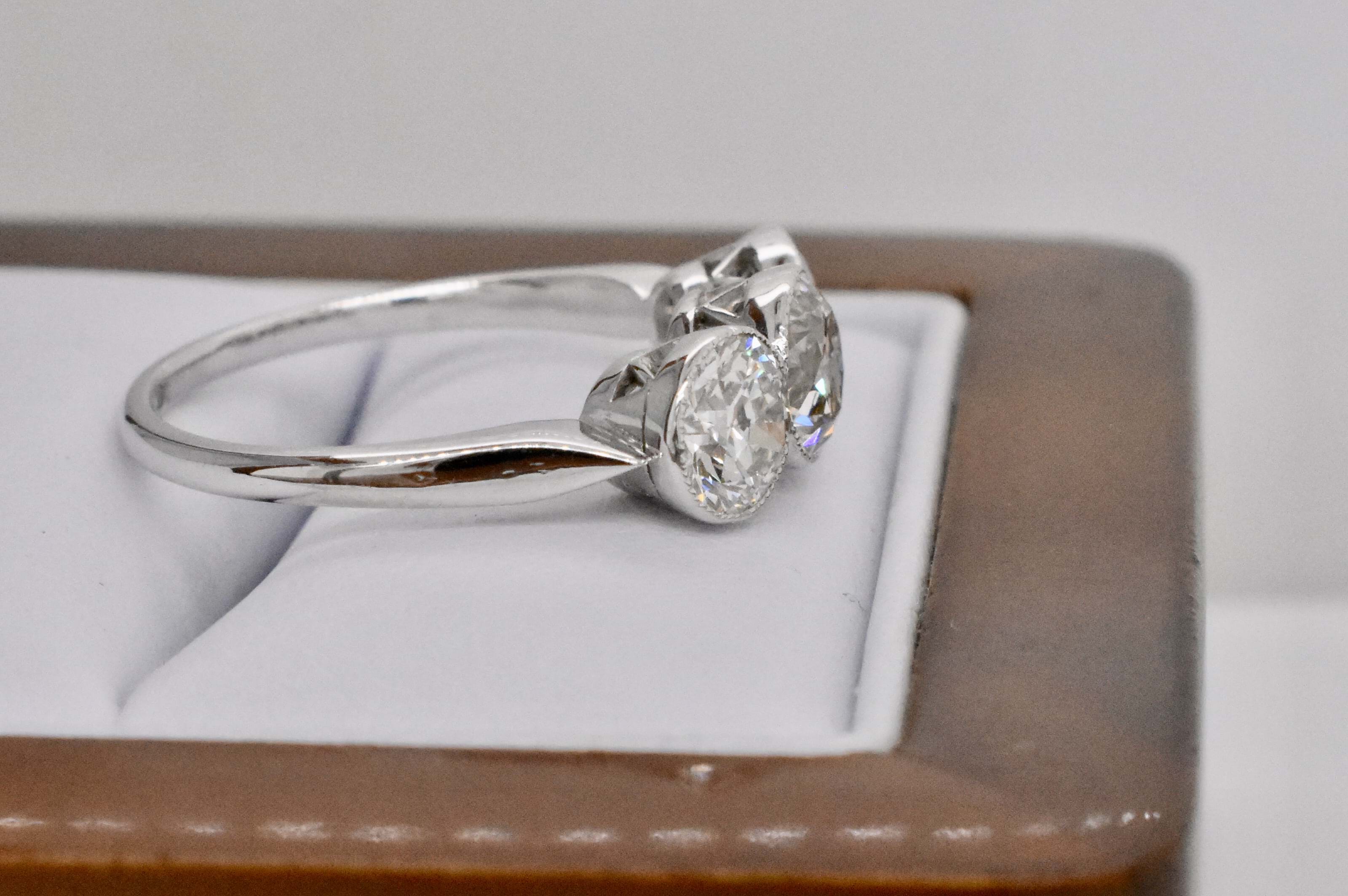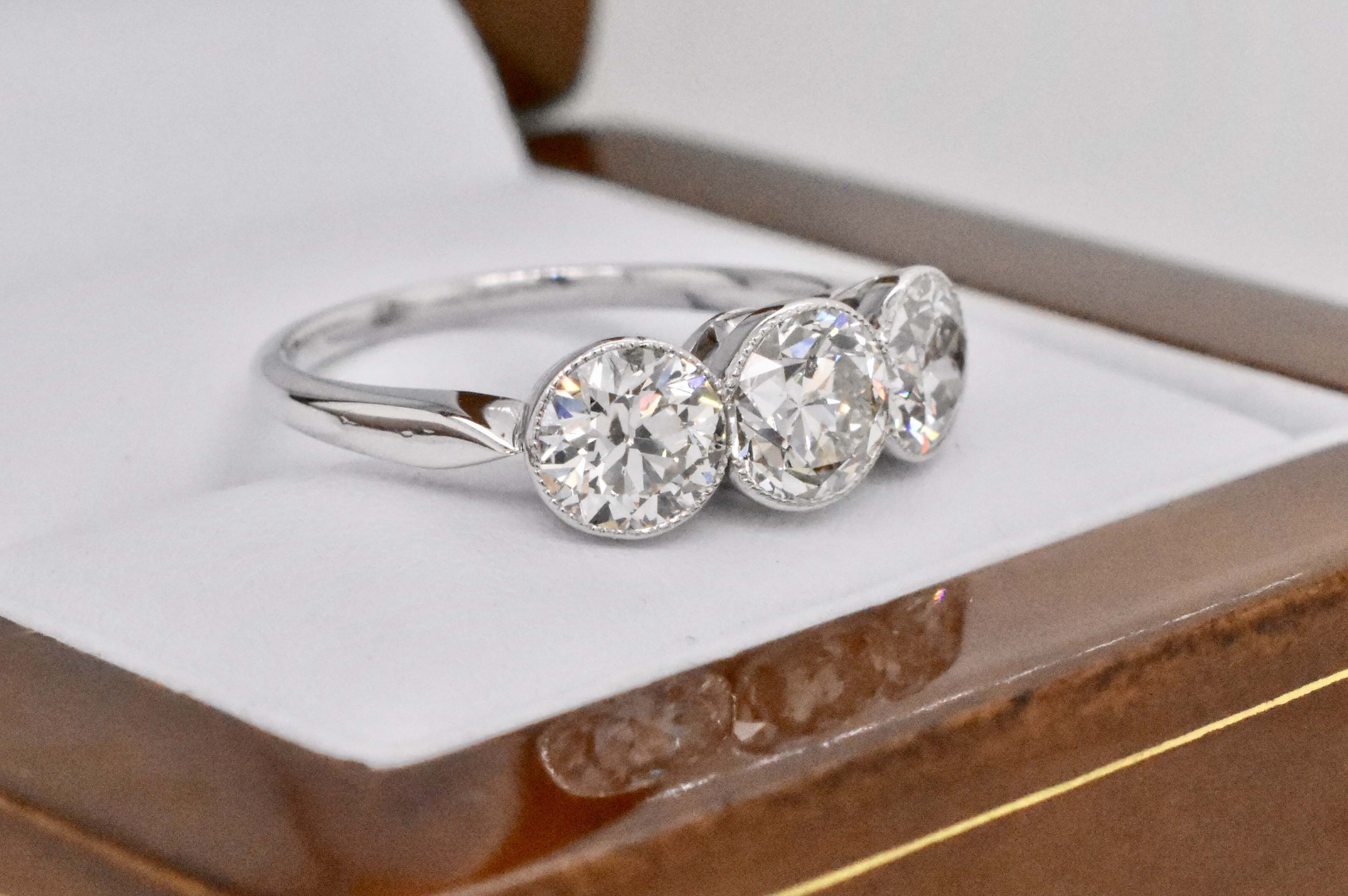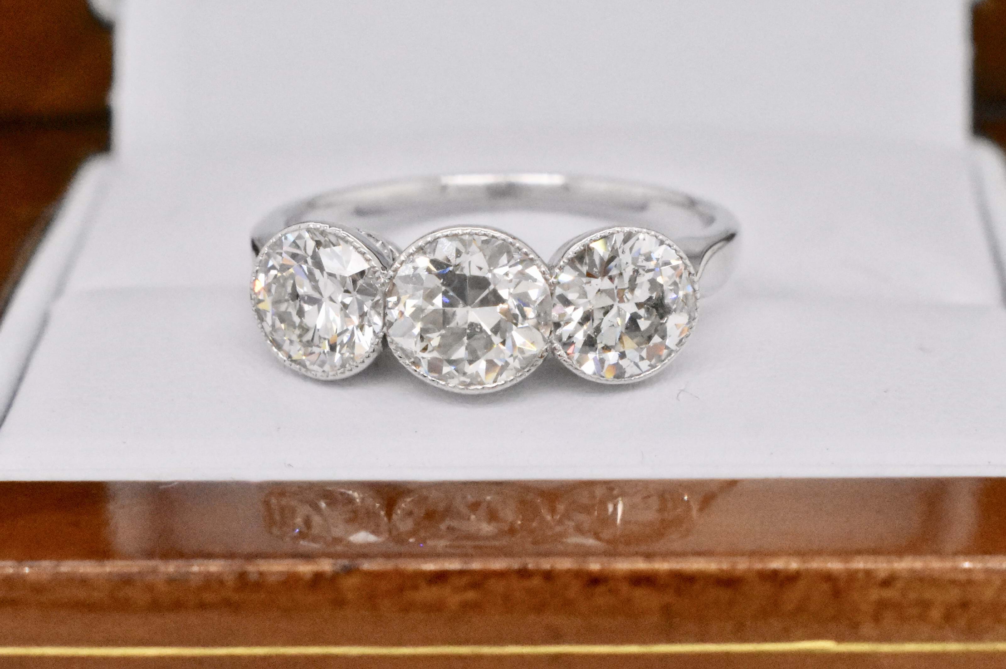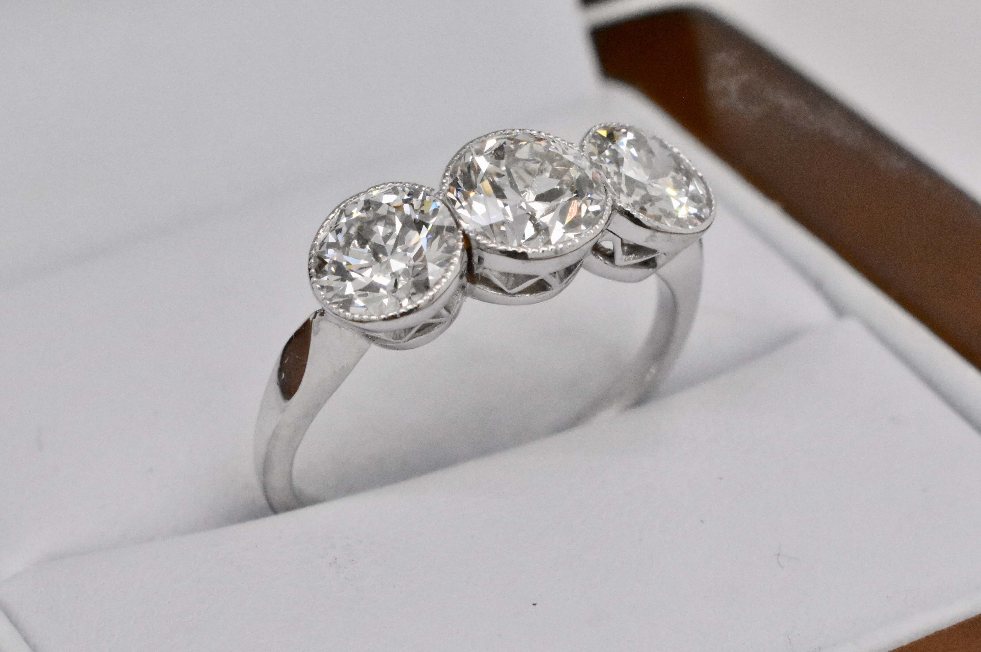 Beautiful platinum three stone ring features a total of 2.70cts of shimmering early modern cut Diamonds. Circa 1940's. Independent Valuation Supplied. Finger size O+