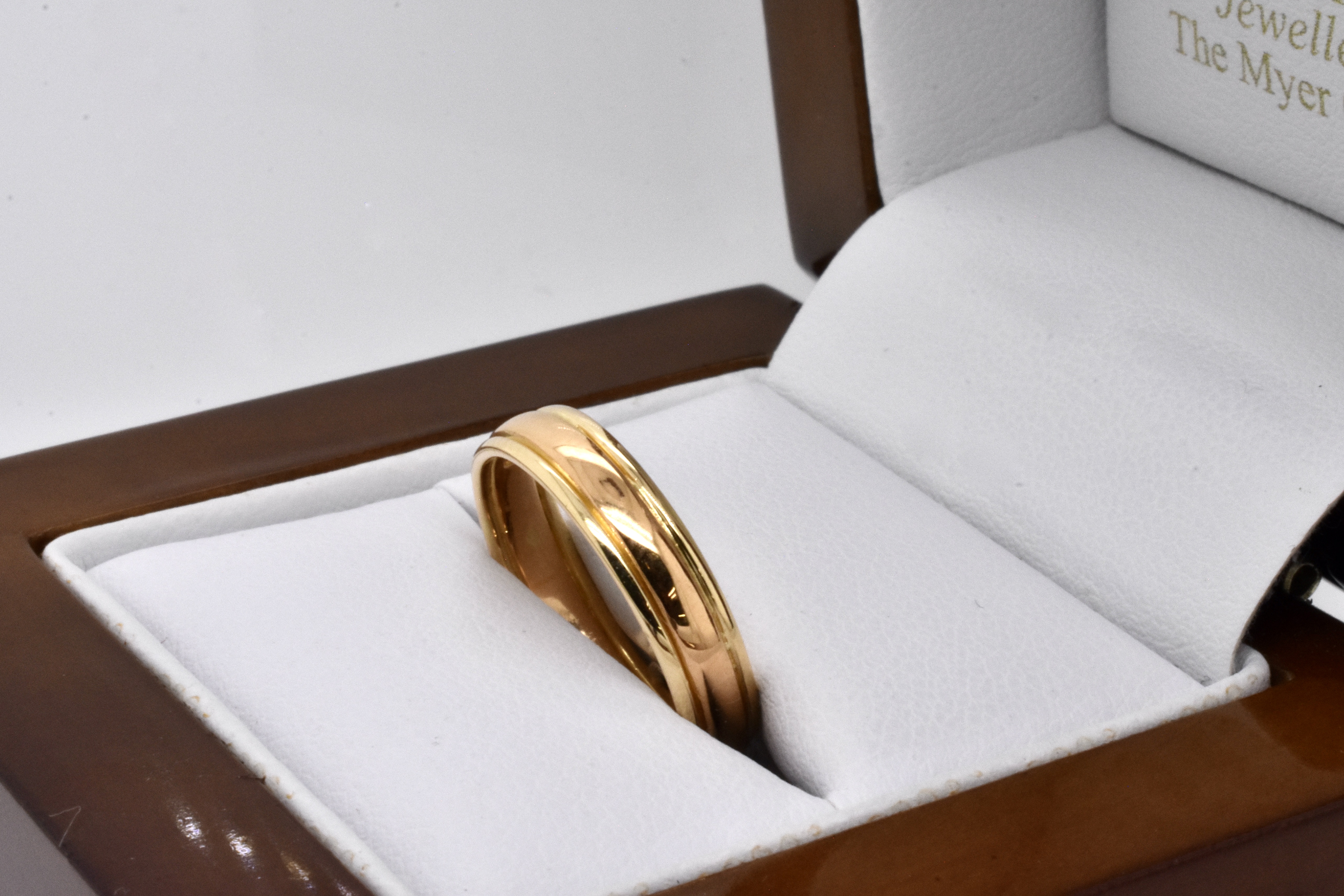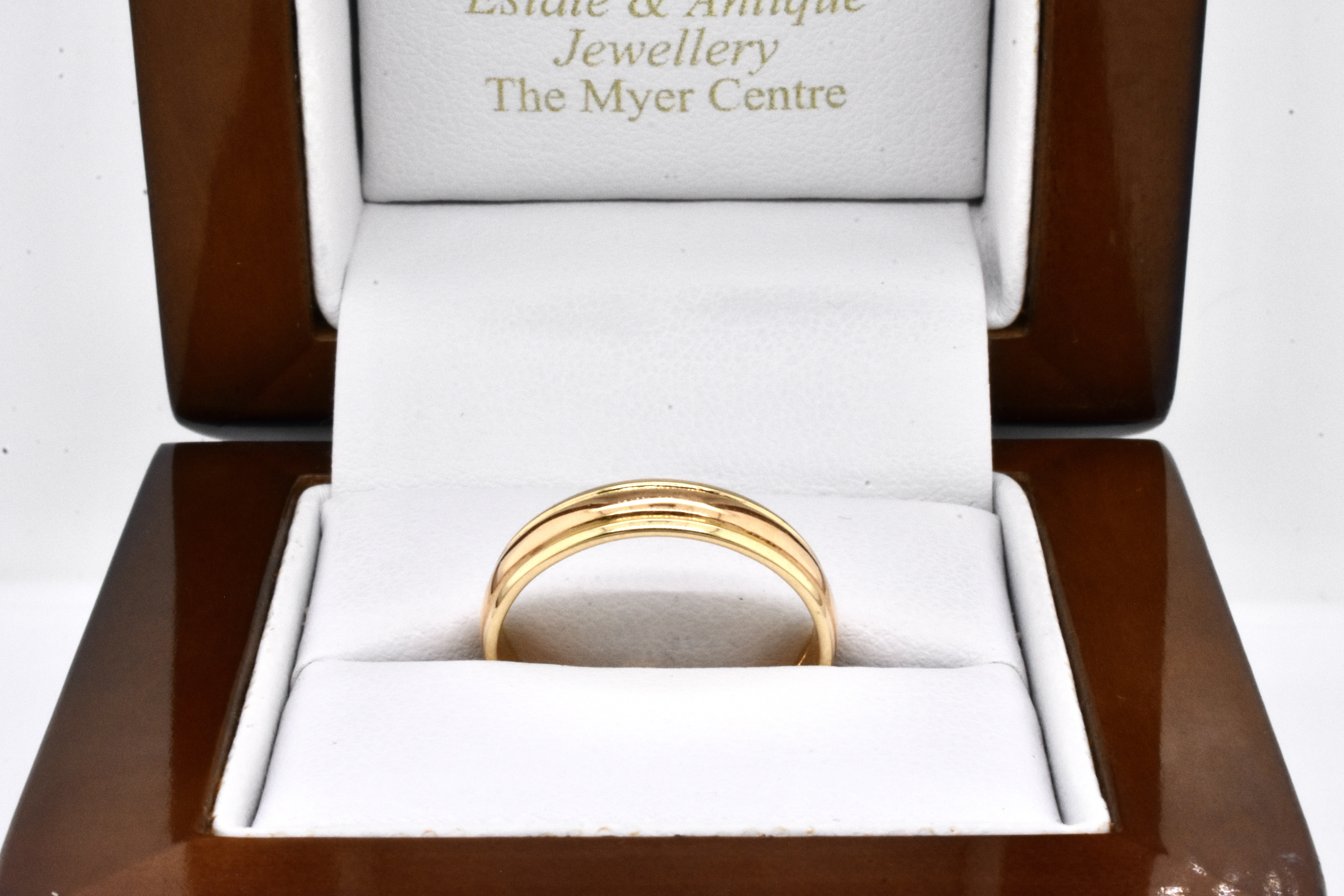 This vintage band has been crafted in 22ct yellow gold and measures 4mm wide with groove detail to either side, hallmarked Birmingham 1951. Finger size L+