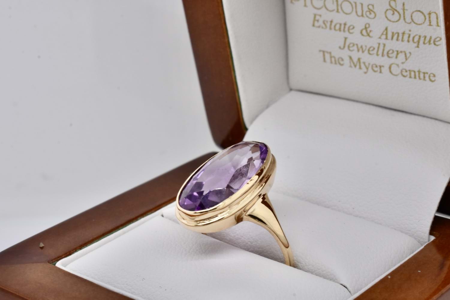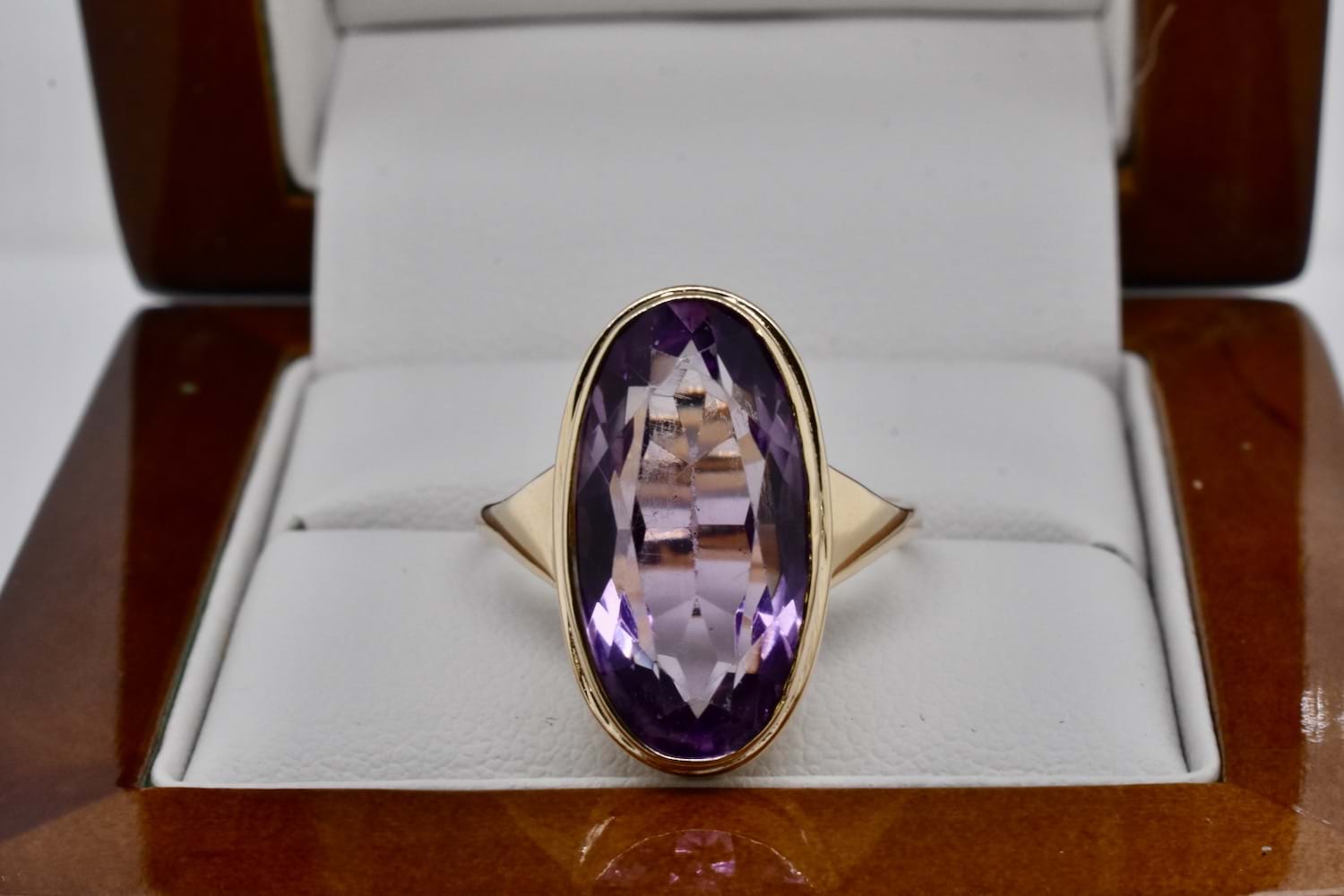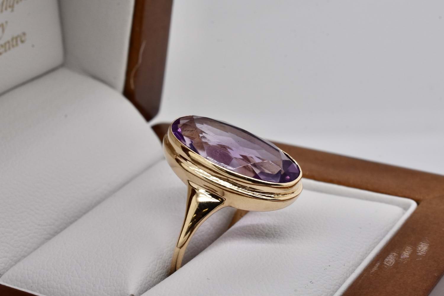 An elegant and elongated vintage ring, made from 9ct yellow gold and set with a pretty, mid purple oval amethyst measuring approx. 18 x 10mm, in a bezel setting with an outer ridge and tapered shoulders with a fine plain band. Circa 1950. Finger size N