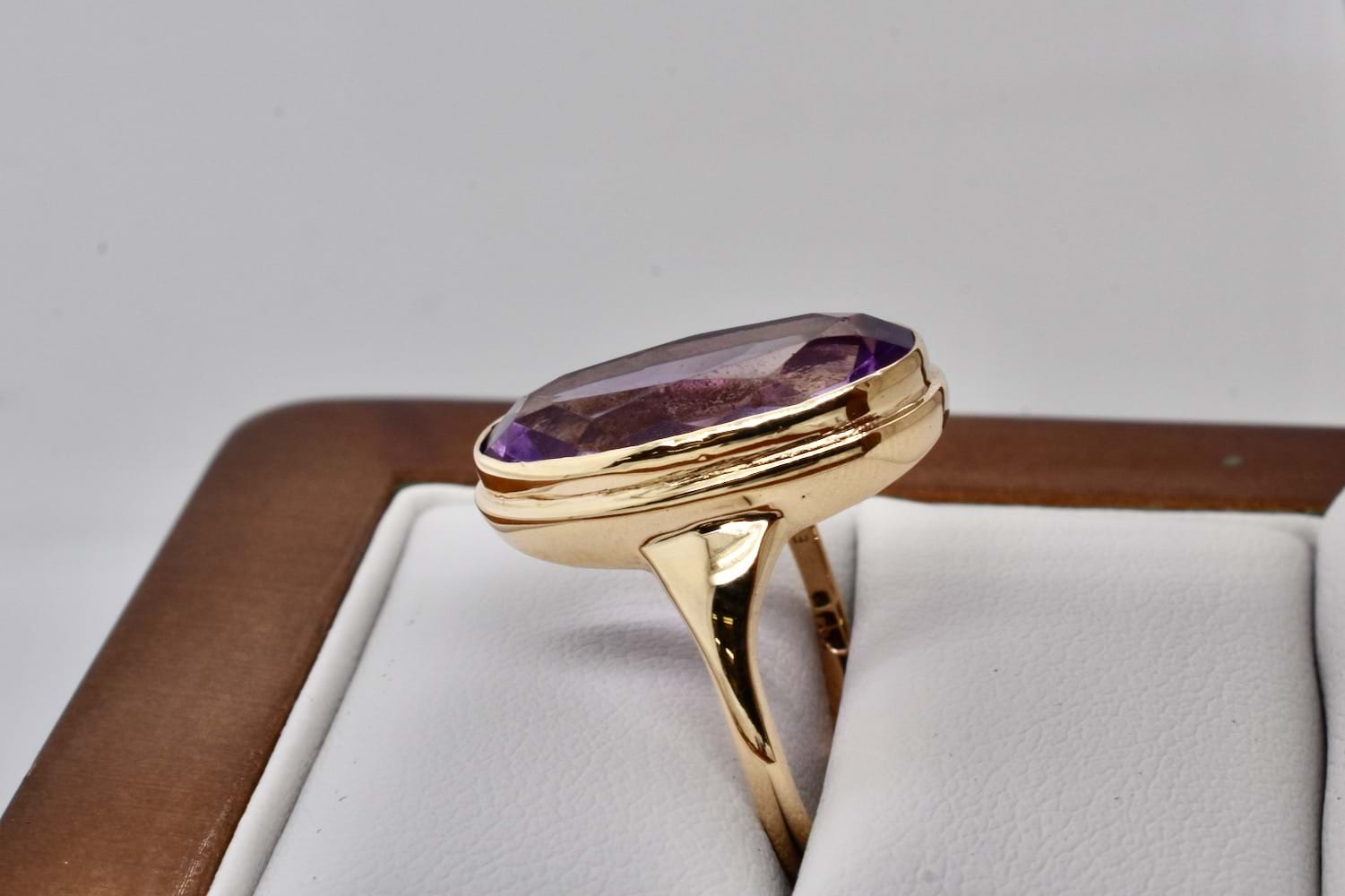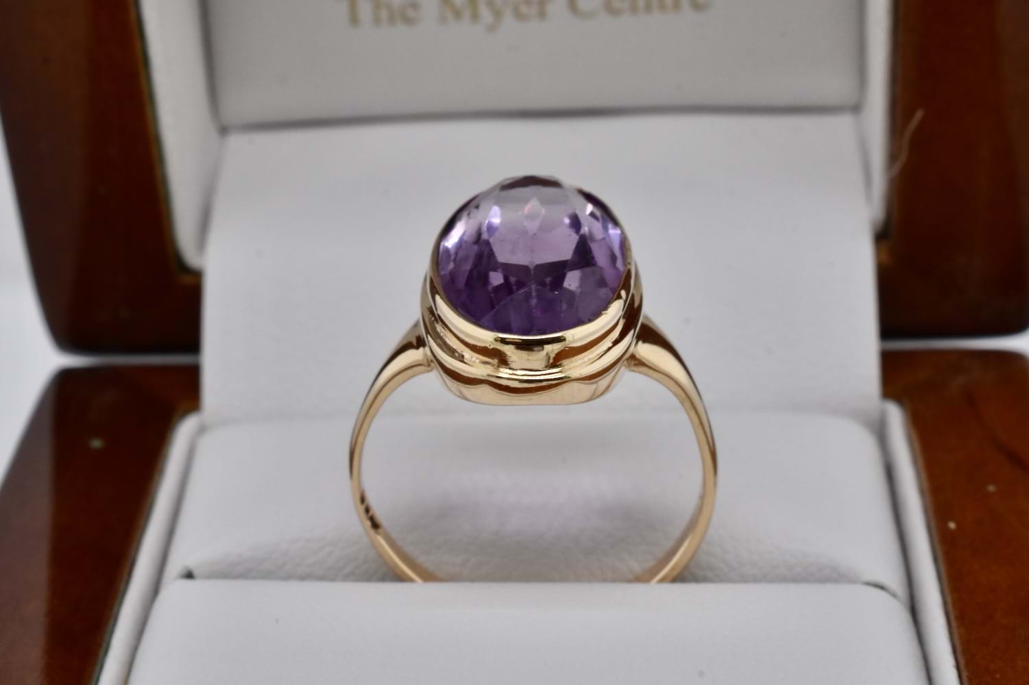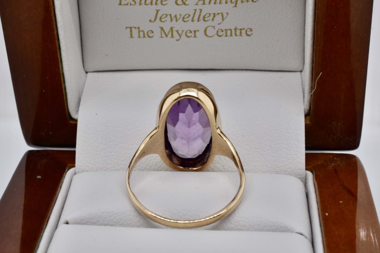 An elegant and elongated vintage ring, made from 9ct yellow gold and set with a pretty, mid purple oval amethyst measuring approx. 18 x 10mm, in a bezel setting with an outer ridge and tapered shoulders with a fine plain band. Circa 1950. Finger size N