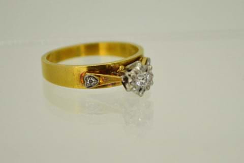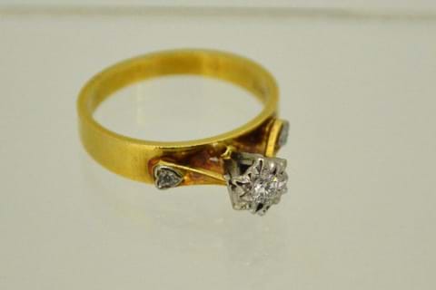 Dated circa 1960's this ring is full of character and detail. Crafted in 18ct yellow and white gold the centre single cut diamond has been illusion set and each shoulder features another single cut diamond in a heart shape grain setting. Total diamond content equals 0.10cts.
