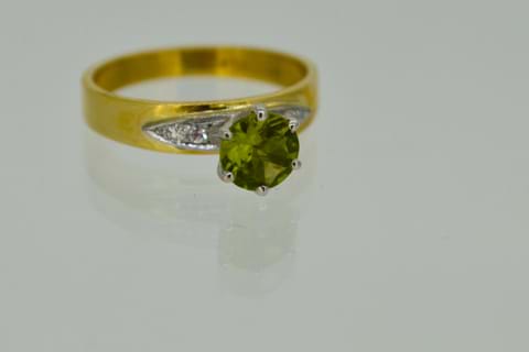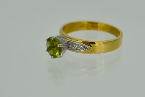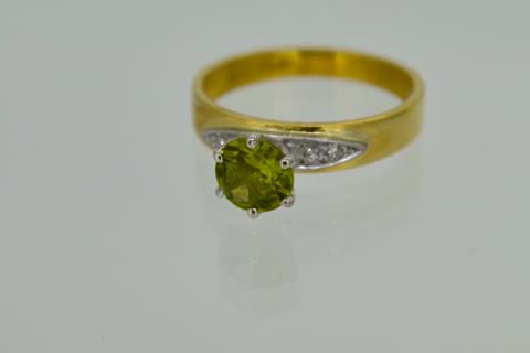 Perfect for vintage lovers! With a 6mm round peridot set into platinum with 2 sparkling diamonds set into platinum wings on either side, and an 18ct yellow gold band this ring is striking and has the character that only a vintage ring does. Independent Valuation Supplied