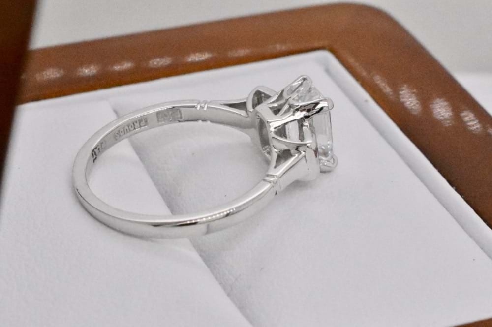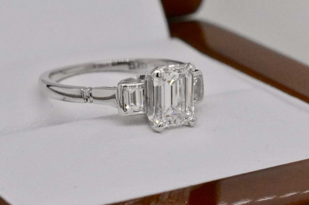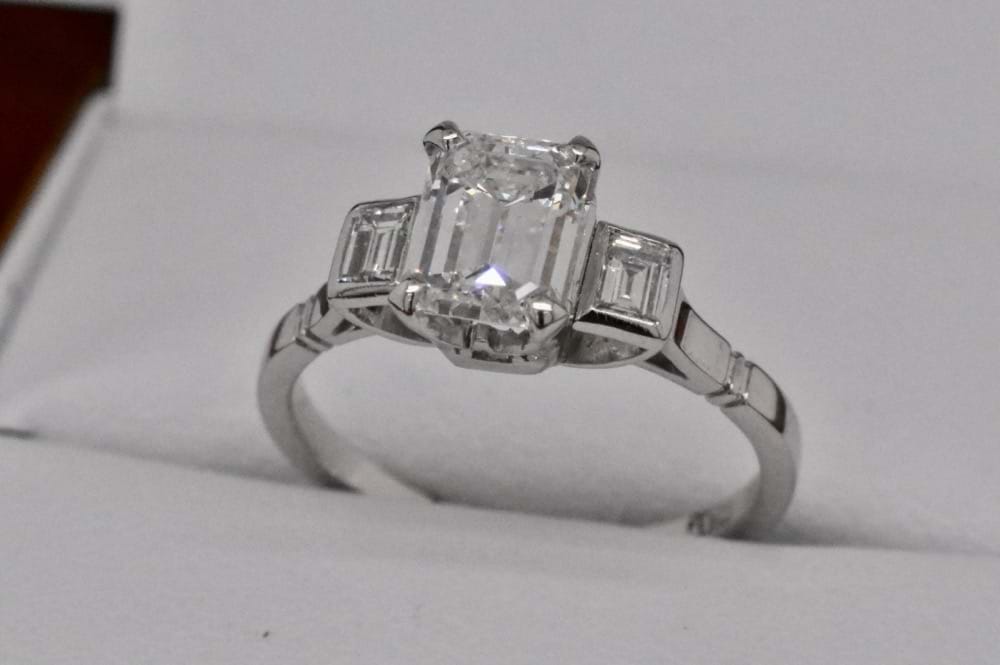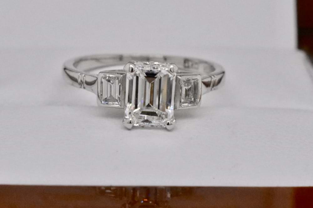 This vintage ring is handcrafted in platinum and 18ct white gold and features an exceptional G/VVS 1.00ct emerald cut diamond four claw set, flanked by a stunning baguette diamond on either side totaling 0.22cts (G/VS). This stunning ring is the epitome of elegance and can be worn as either an engagement or dress ring. Independent Valuation Supplied