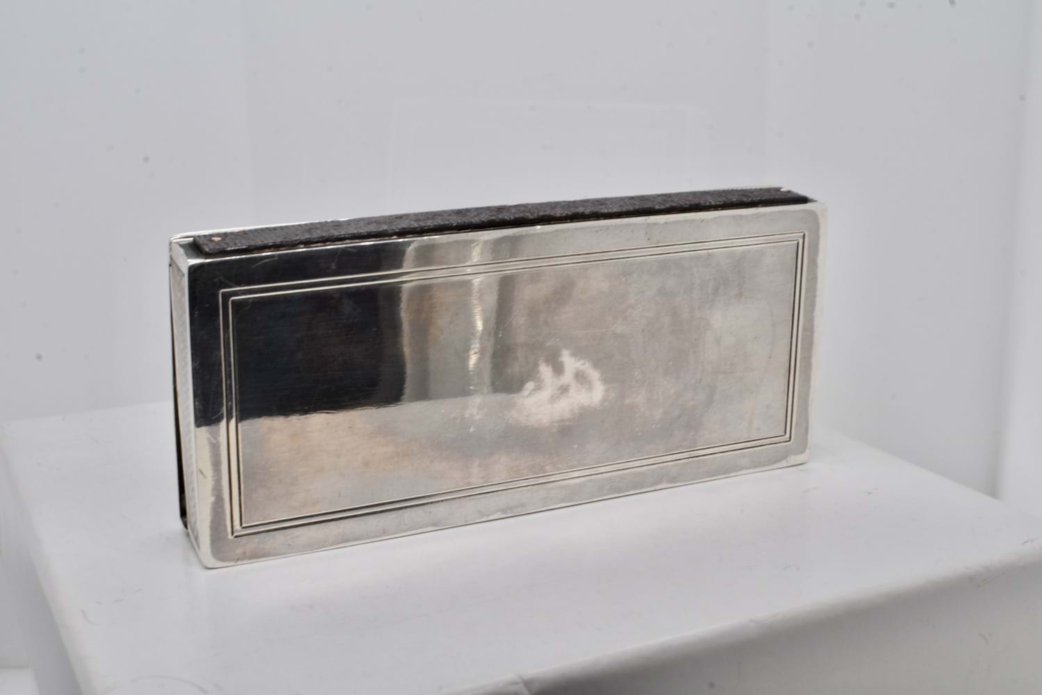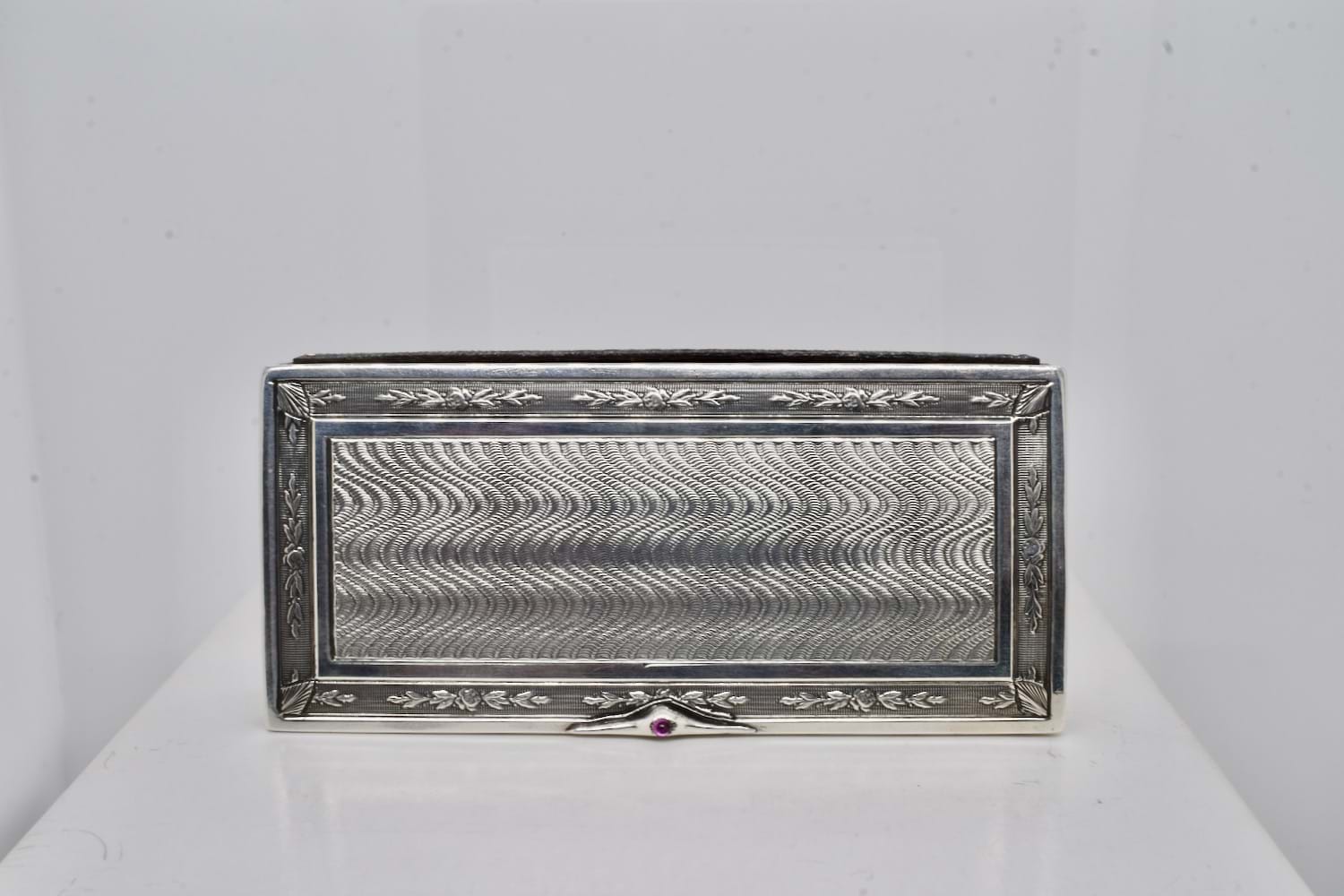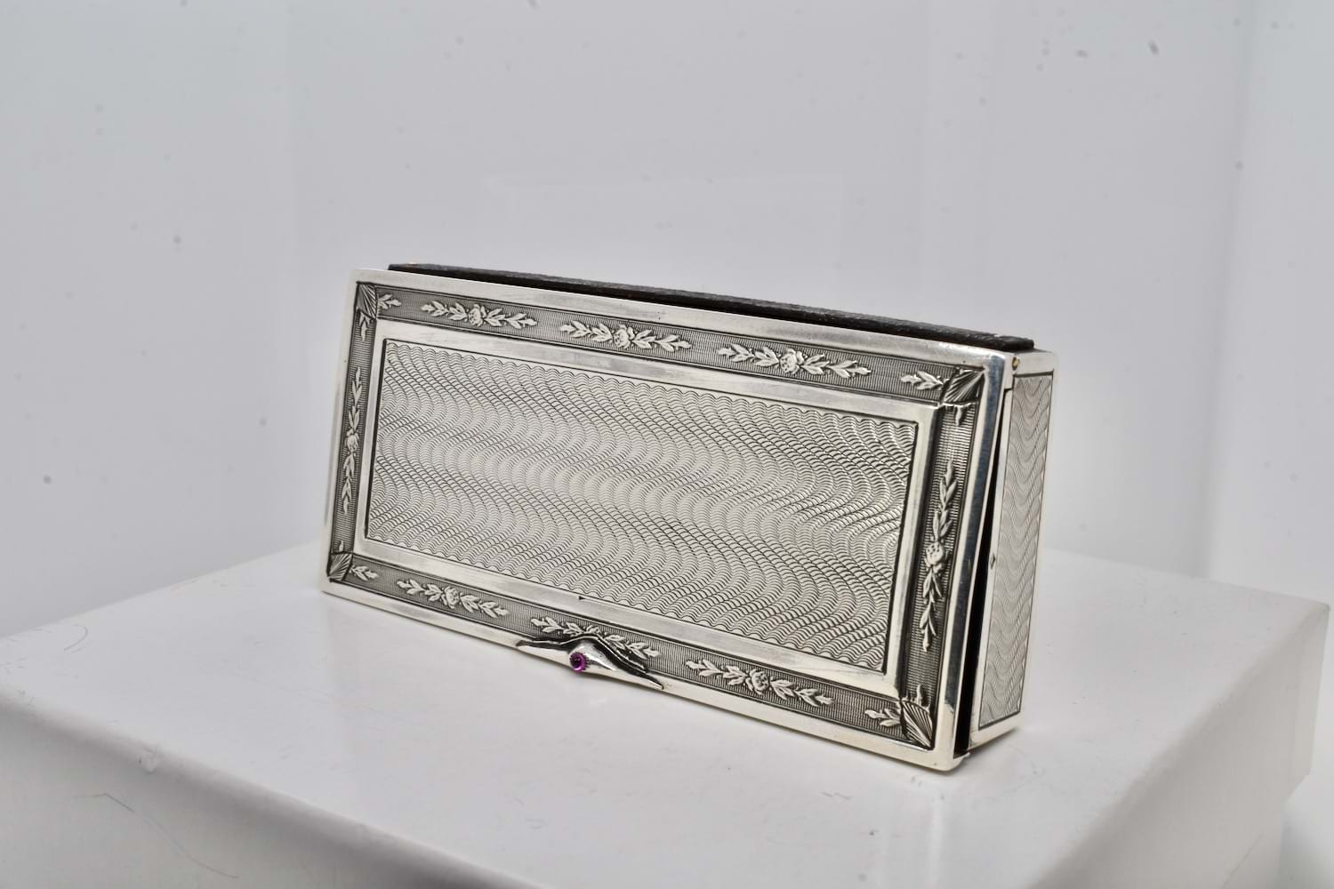 A French silver match safe, the hinged lid features a lovely foliage embossed border with waved engine turn decoration in the centre section and a raised thumbpiece with a small ruby inset and a long striker panel on one side. Hallmarked with a French boar guarantee mark along with an indistinct makers mark. Circa 1880s. Weight - 56.1grams. Measures approx. 83x38mm.